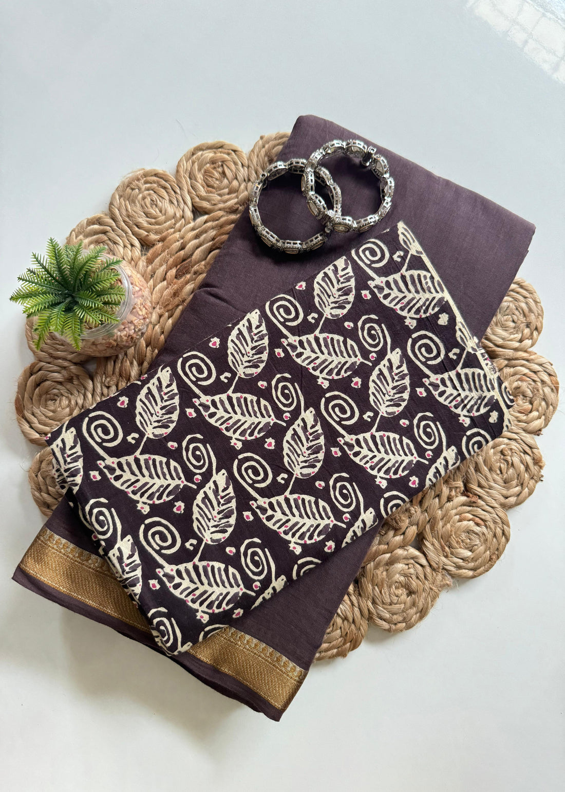Brown Mul Cotton Saree with Zari Border & Leaf Printed Blouse S2346