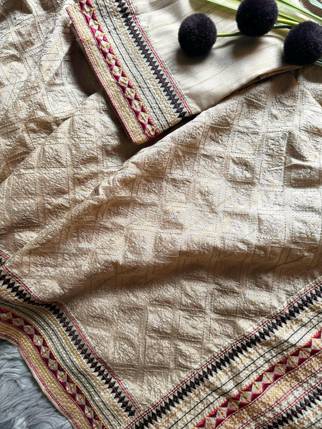 Premium Soft Tussar Silk Saree with Elegant Multicolor Kantha Work VT-1216
