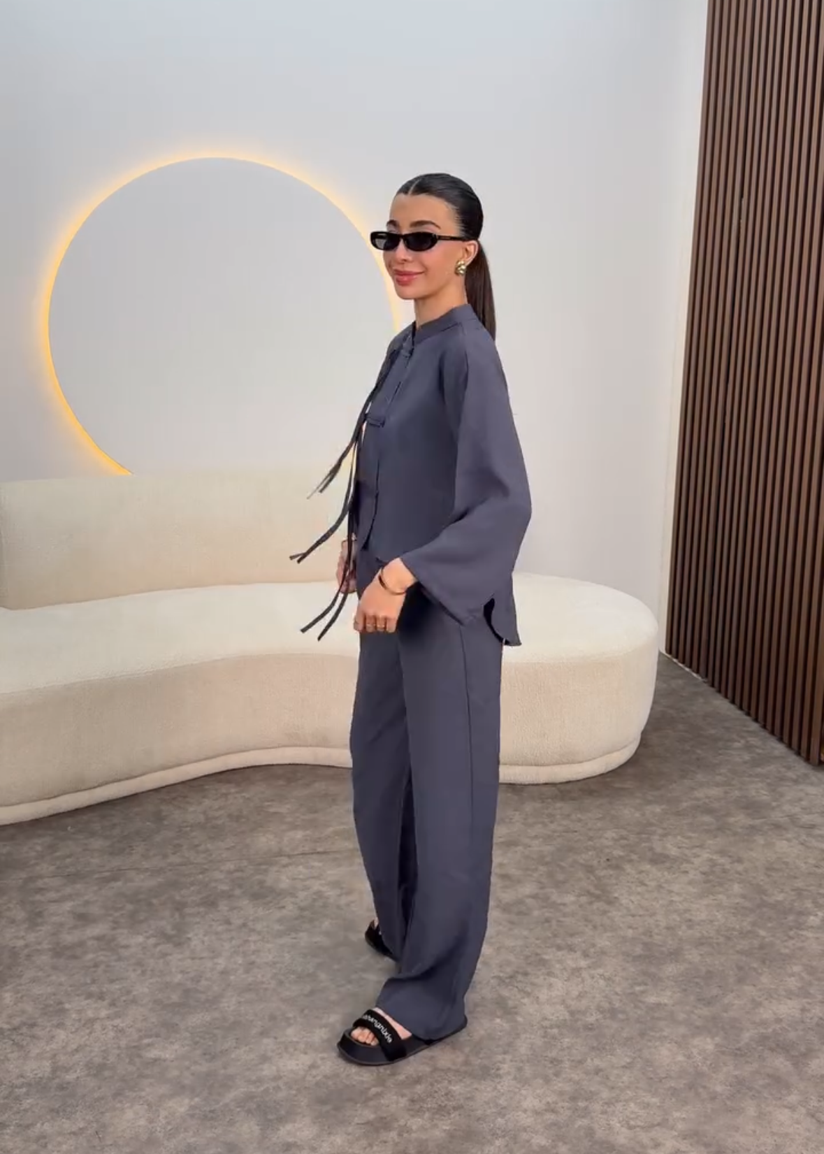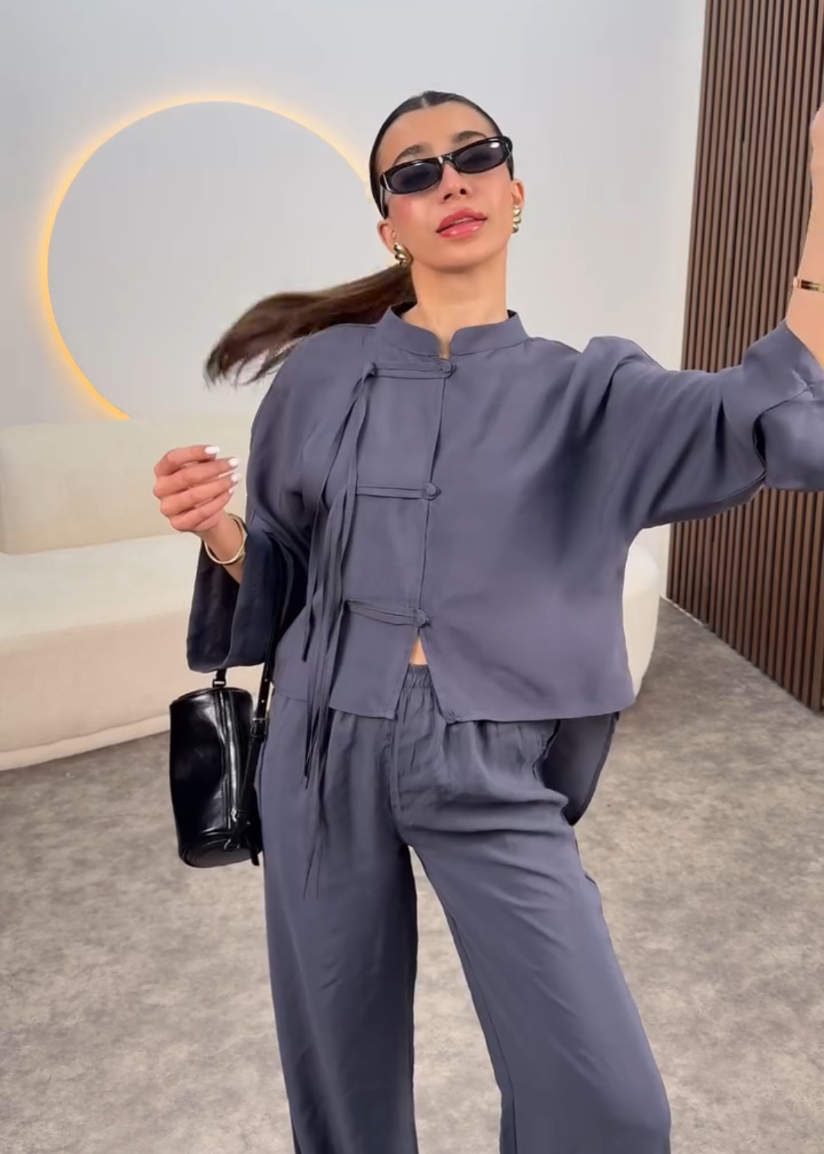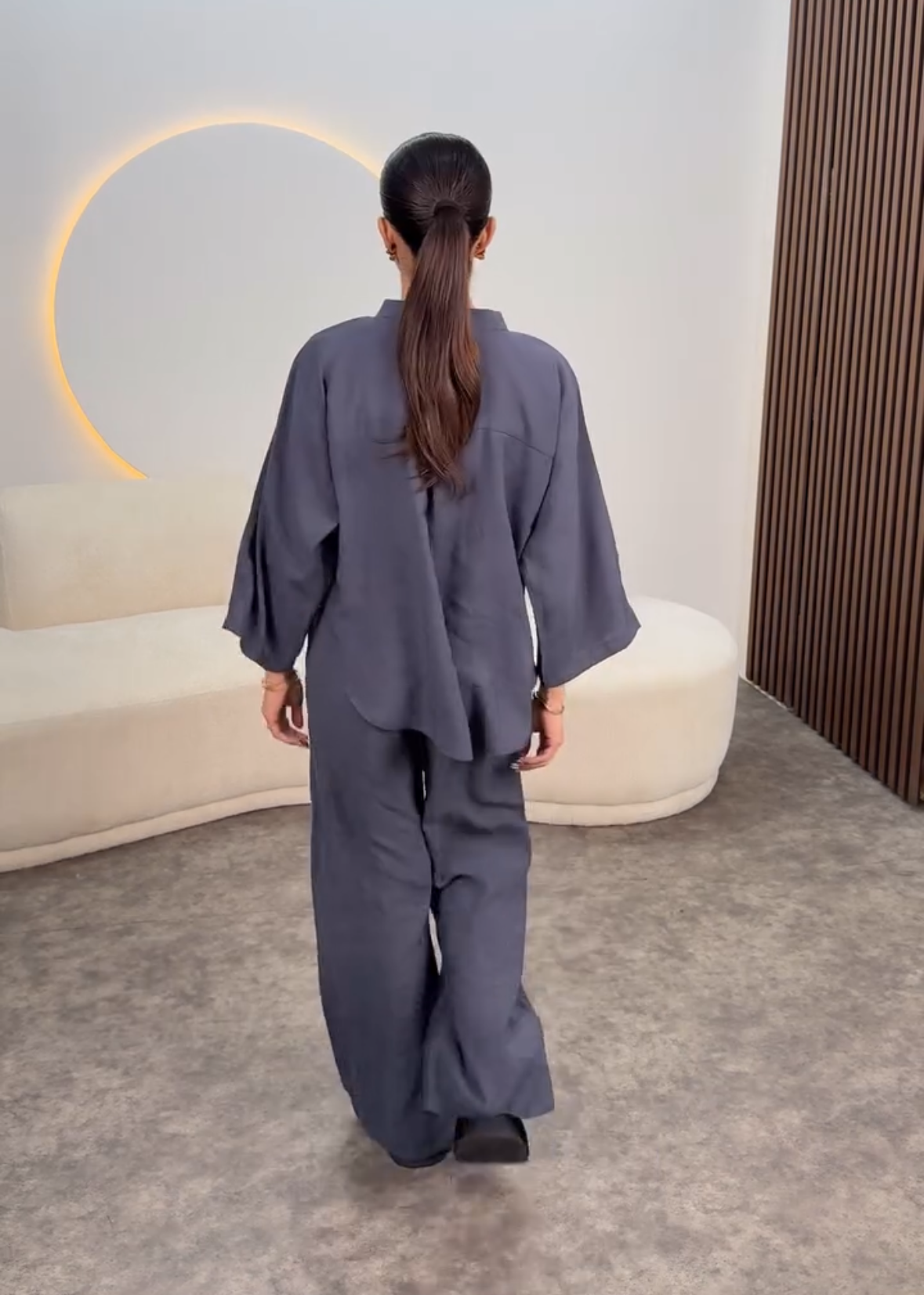 A clean and elegant Grey co-ord set designed for everyday comfort. The top has a relaxed fall with loop-button detailing, paired with soft wide-leg pants that drape smoothly. Easy to wear and effortlessly stylish.