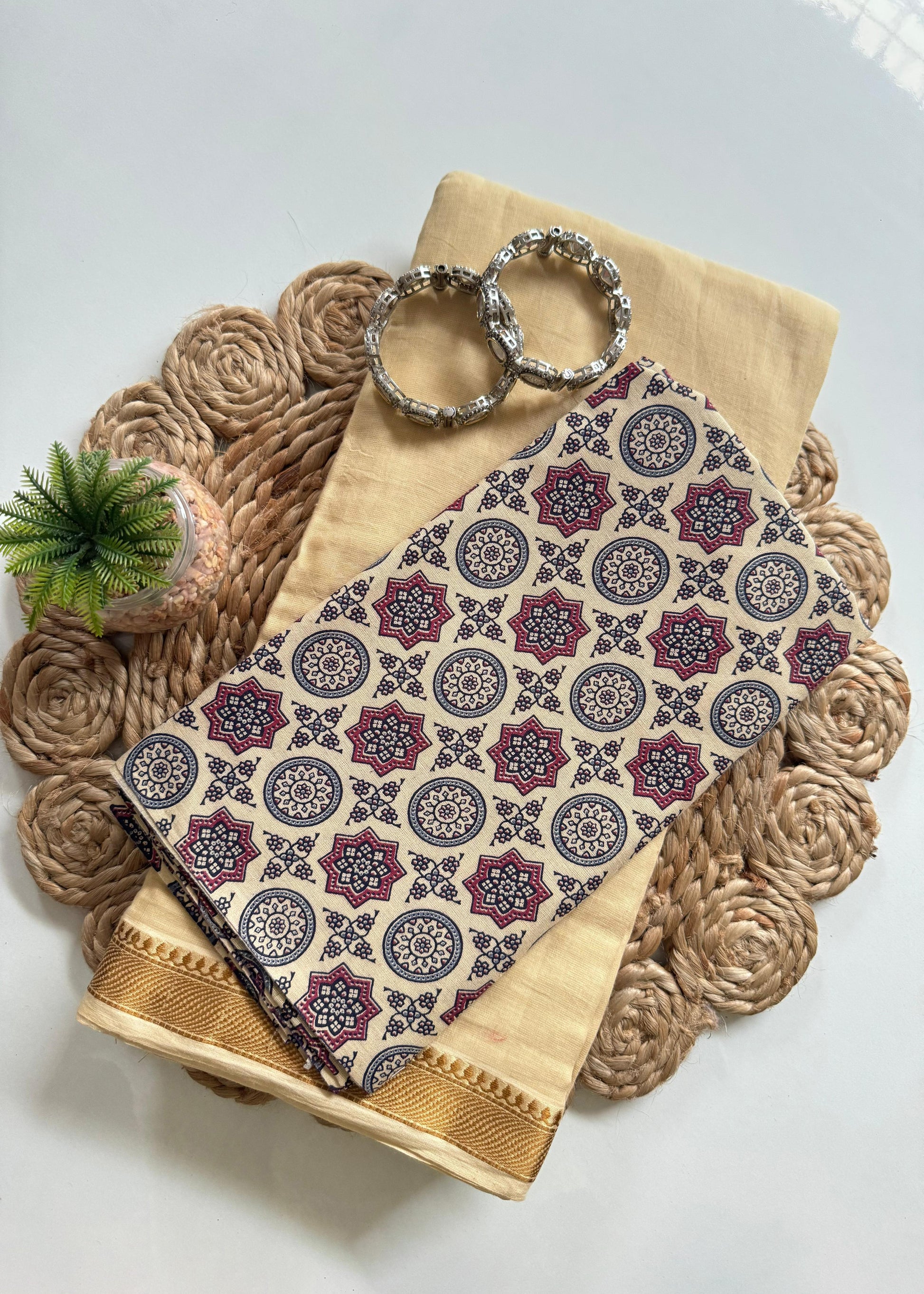 Elegant beige mul cotton saree with golden zari border, paired with a chic geometric printed blouse in contrasting shades. Lightweight, breathable, and perfect for festive occasions, office wear, or everyday elegance.
