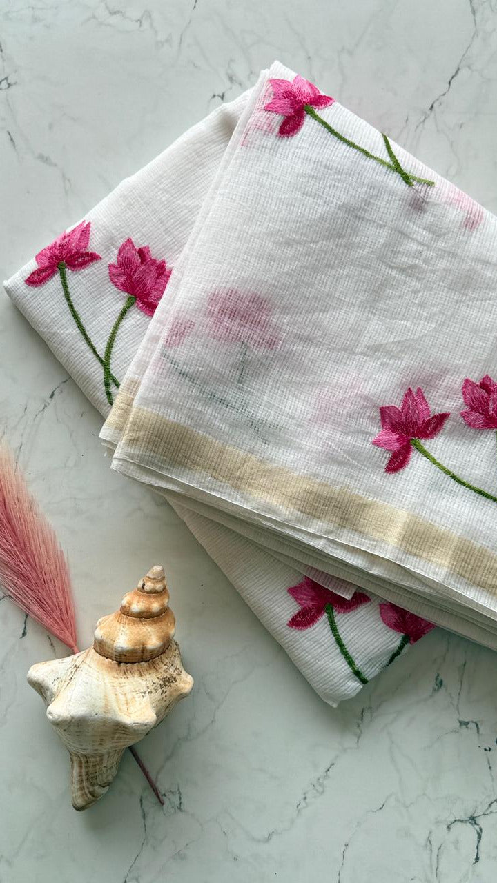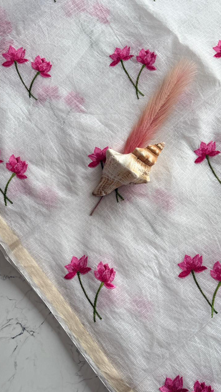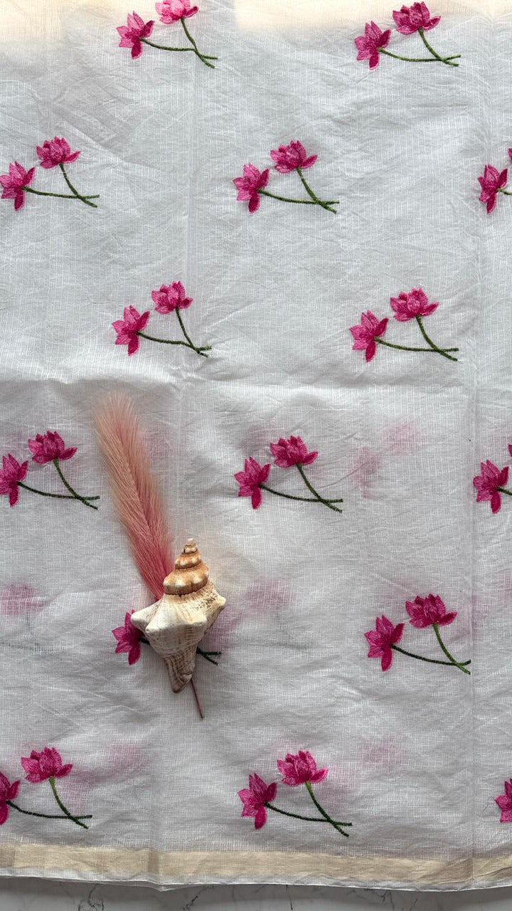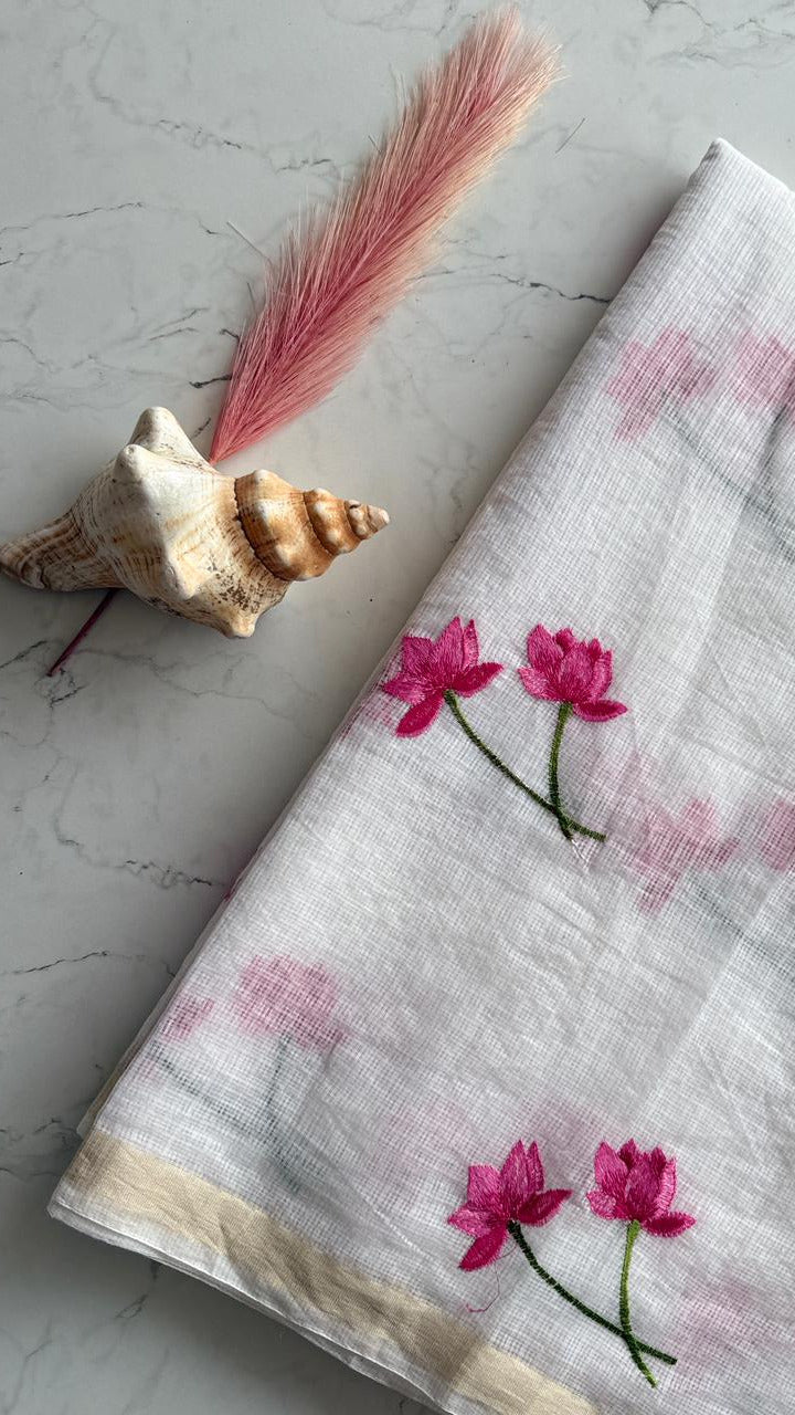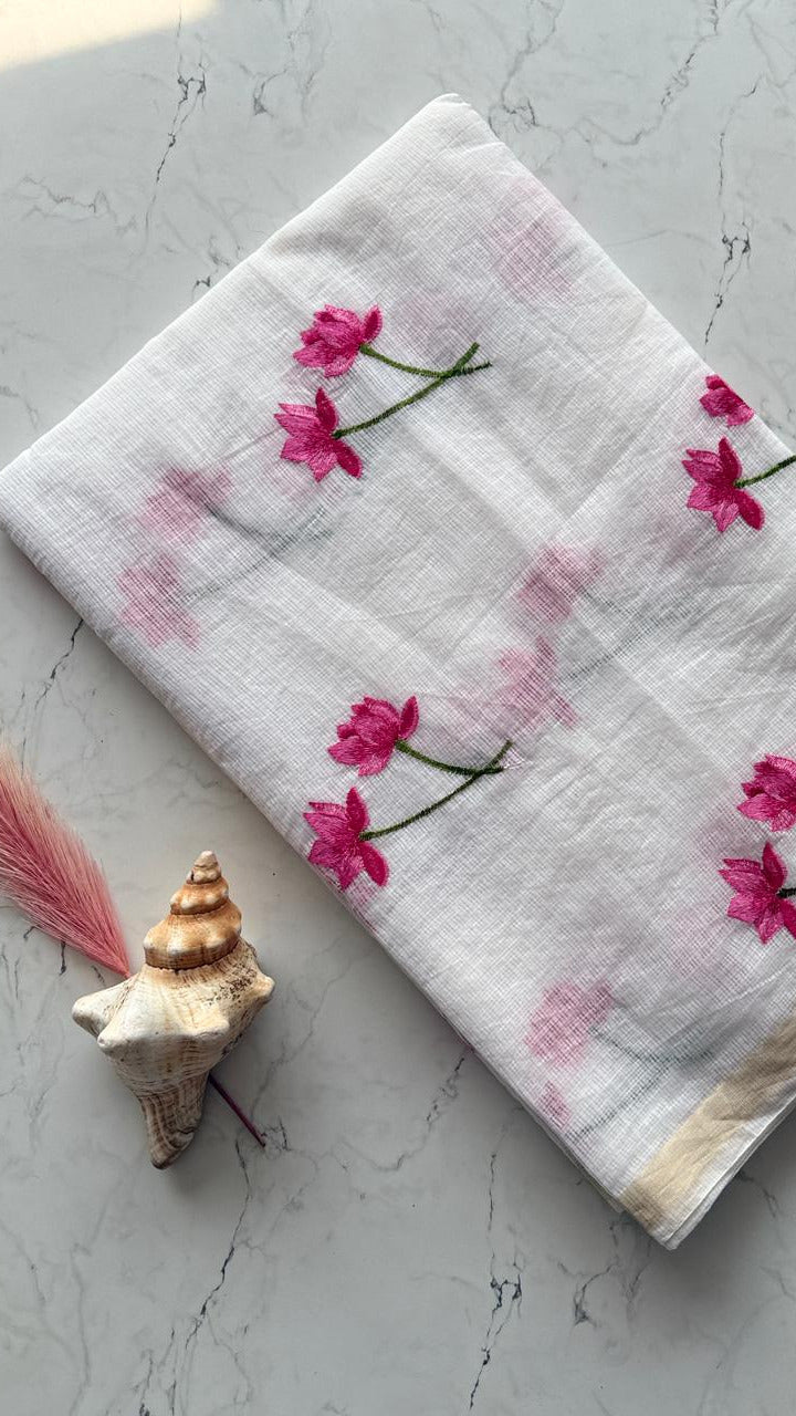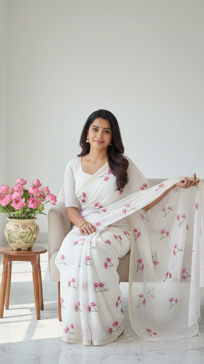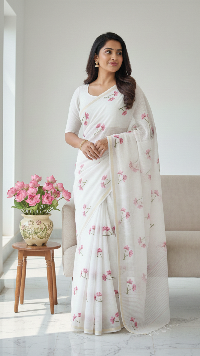 Blooming Blossom White Saree, a beautiful blend of elegance and freshness. Crafted on soft, breathable cotton, this saree features charming pink floral embroidery that adds a touch of romance to every drape. The white base gives it a clean, graceful look — perfect for daytime outings, festive gatherings, or casual celebrations.