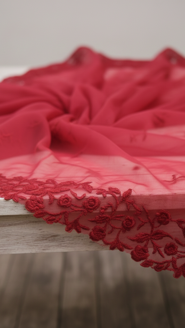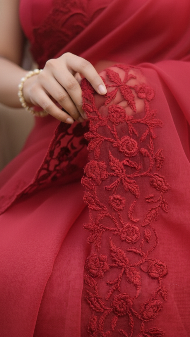 This affordable and elegant organza is such a closet staple that can be styled into versatility Crimson Bloom Organza Saree, crafted from premium soft organza that drapes effortlessly with a luxurious flow. The saree features delicate floral embroidery along the borders, adding a touch of sophistication and charm. Its rich crimson red shade makes it perfect for festive occasions, weddings, parties, and special celebrations.