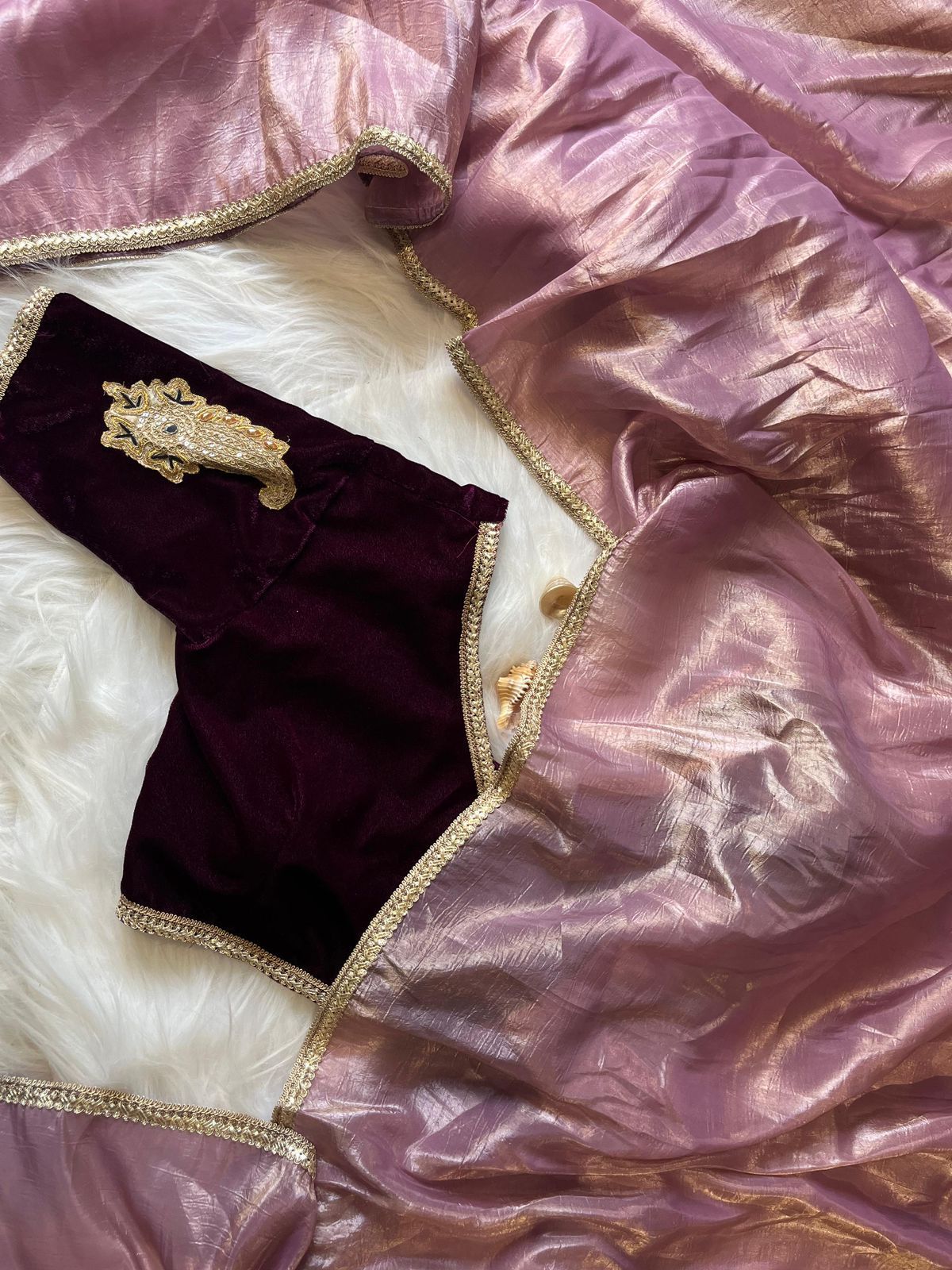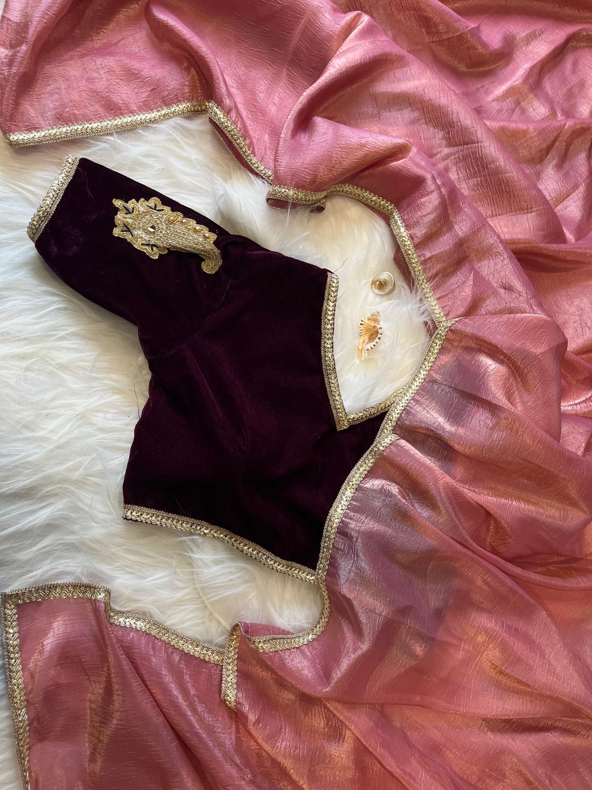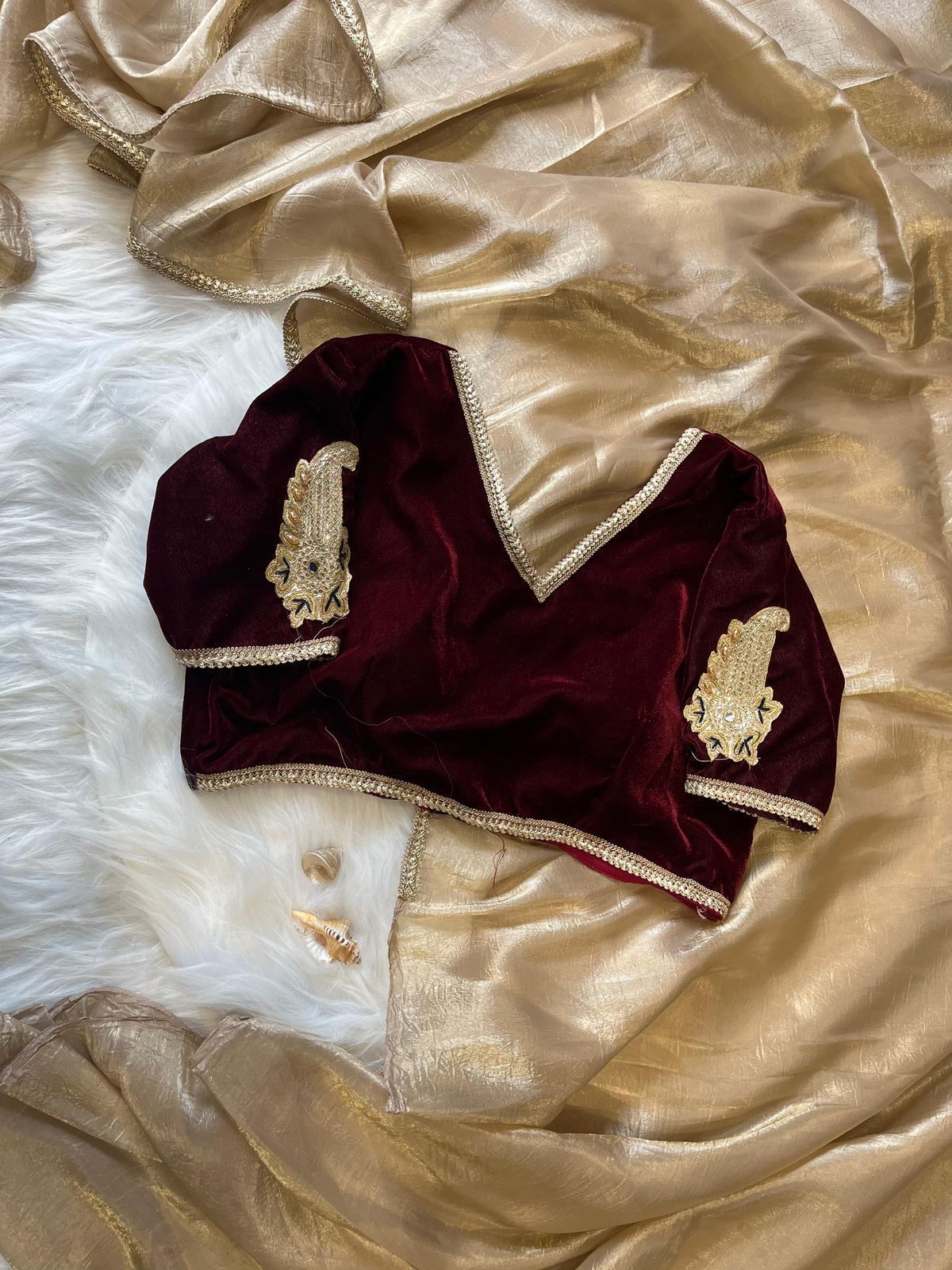 Designer Tissue Crush Silk Saree with Golden Zari Work and Maroon Velvet Blouse D1077