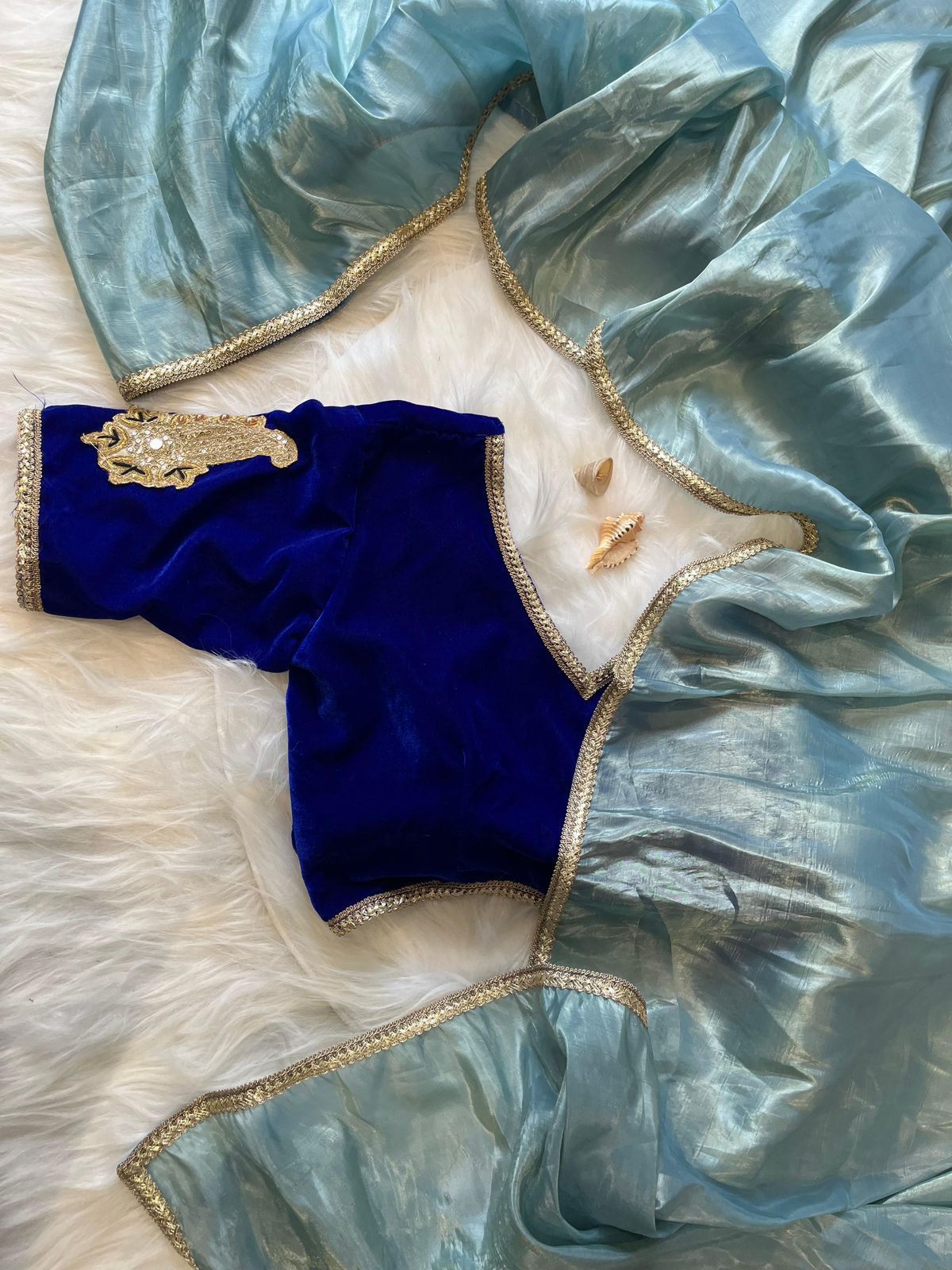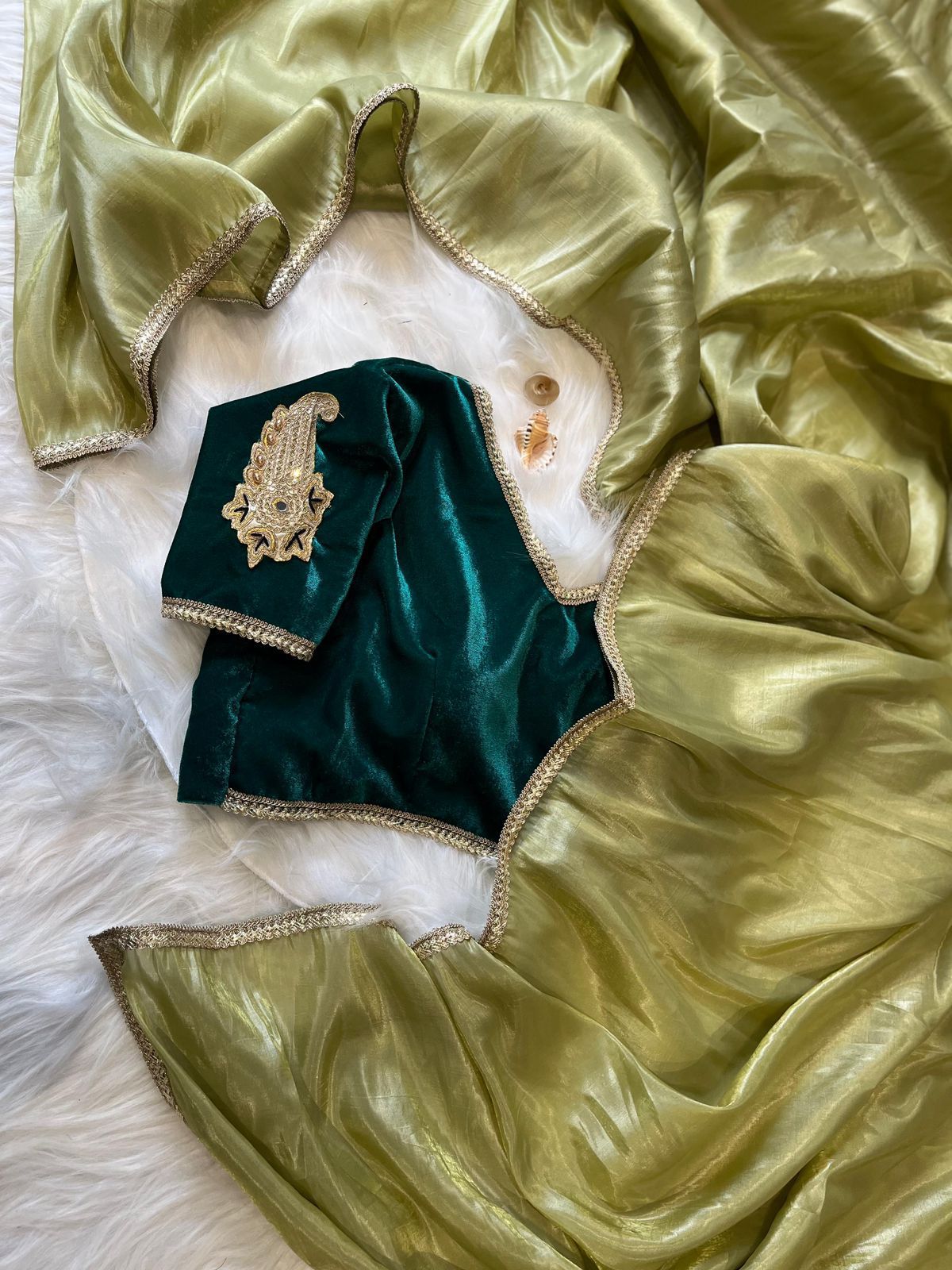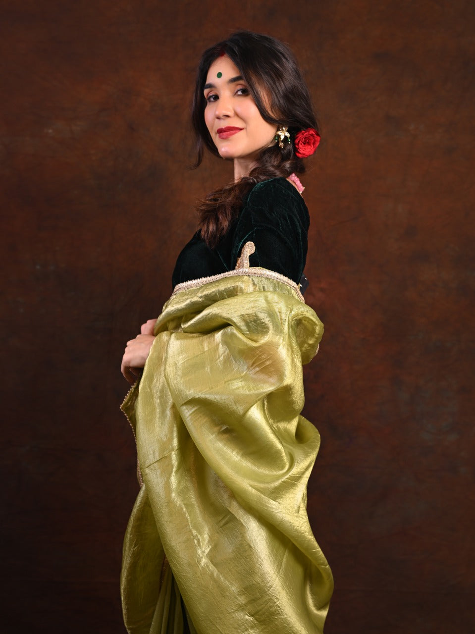 Designer Tissue Crush Silk Saree with Golden Zari Work and Maroon Velvet Blouse D1077