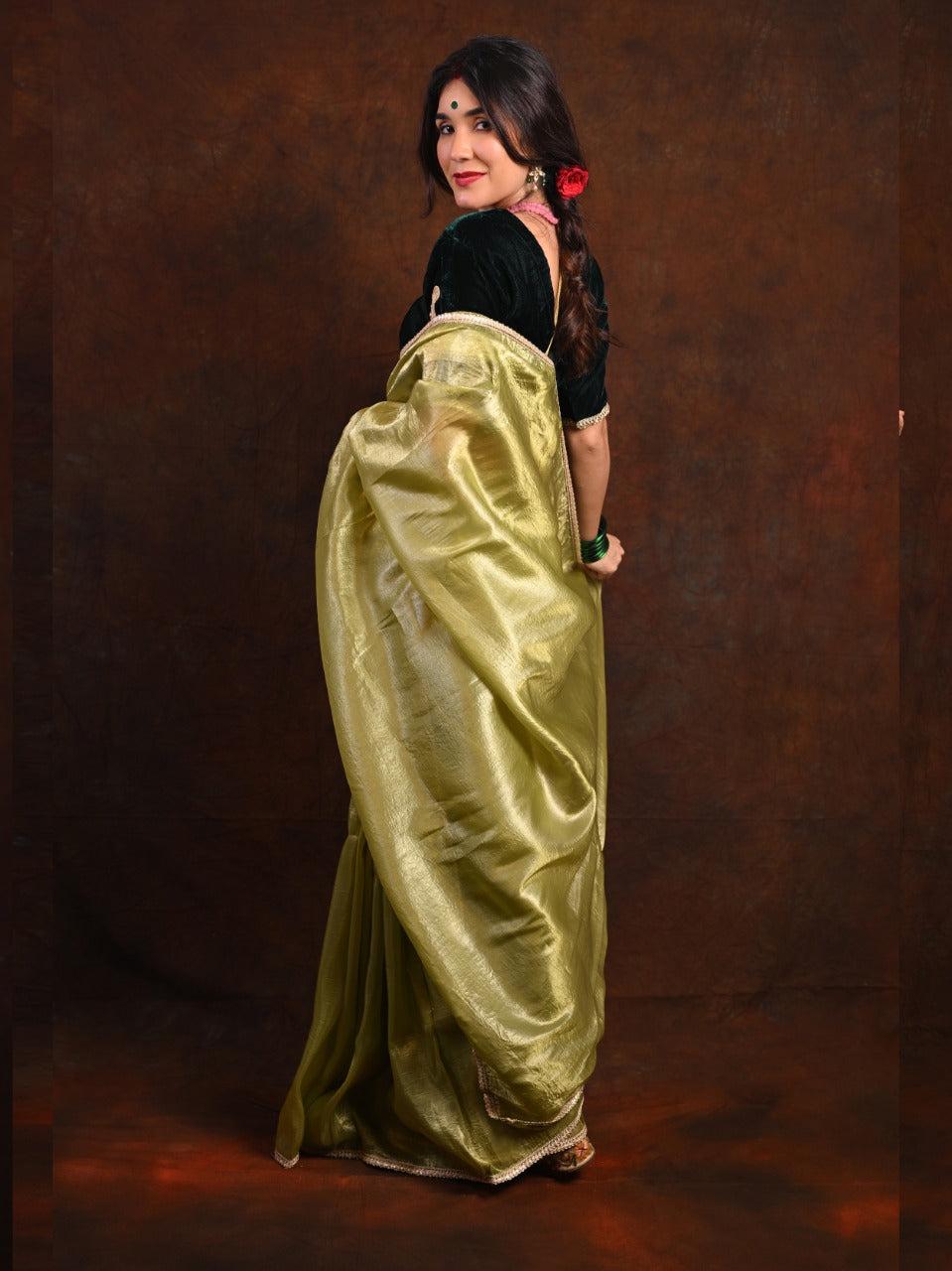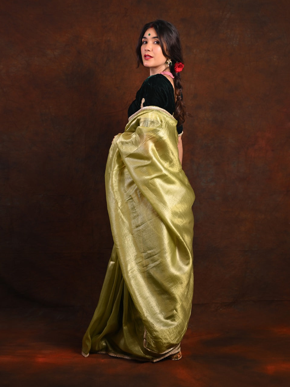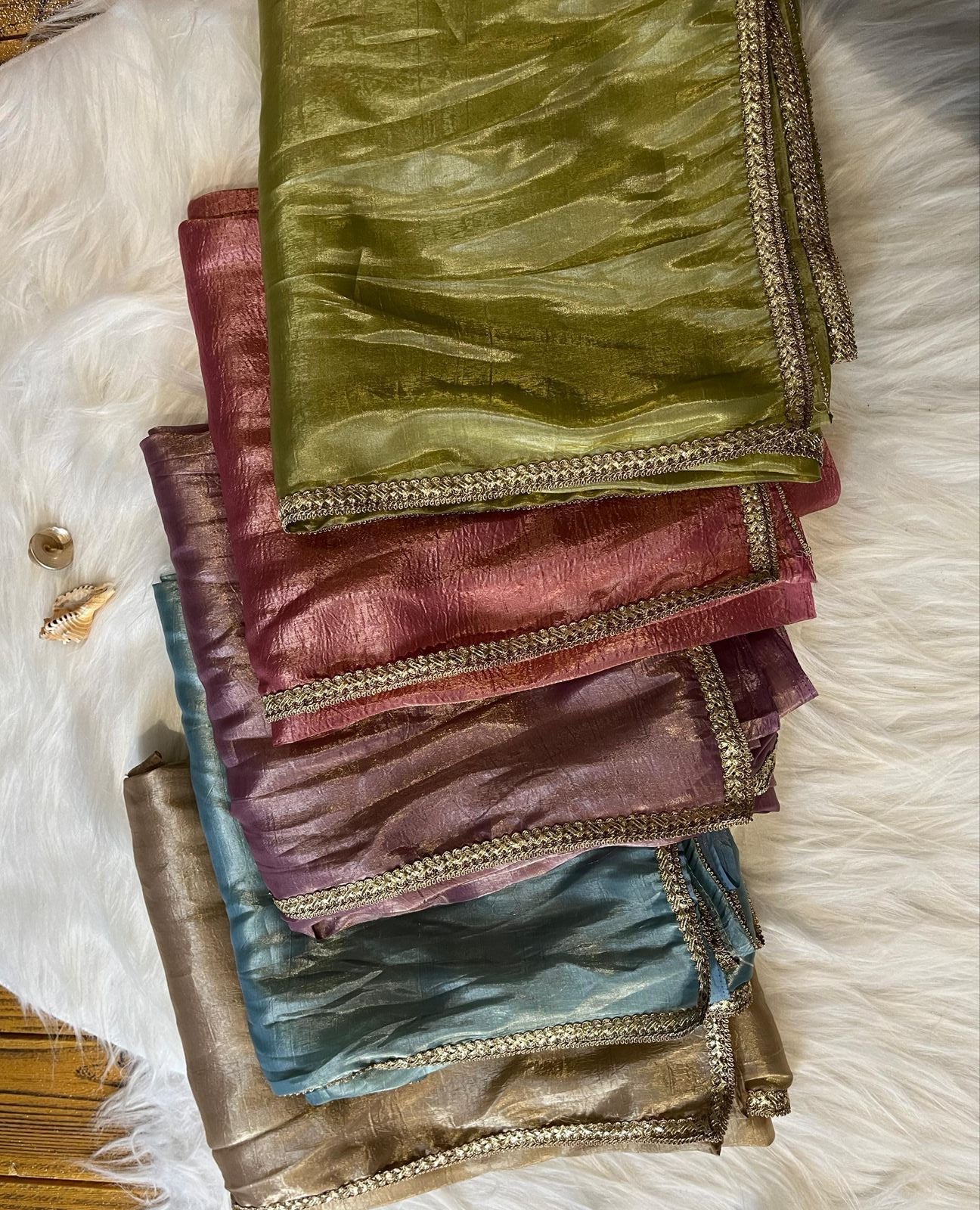 Discover the timeless elegance of this beautiful designer saree crafted from heavy pure tissue crush silk fabric. Featuring a golden true tone zari color and stunning fancy lace work, this saree exudes opulence, making it an ideal choice for weddings, festive celebrations, or special events. The saree is designed with a flattering 5.5-meter cut, ensuring ample fabric for a graceful drape.
