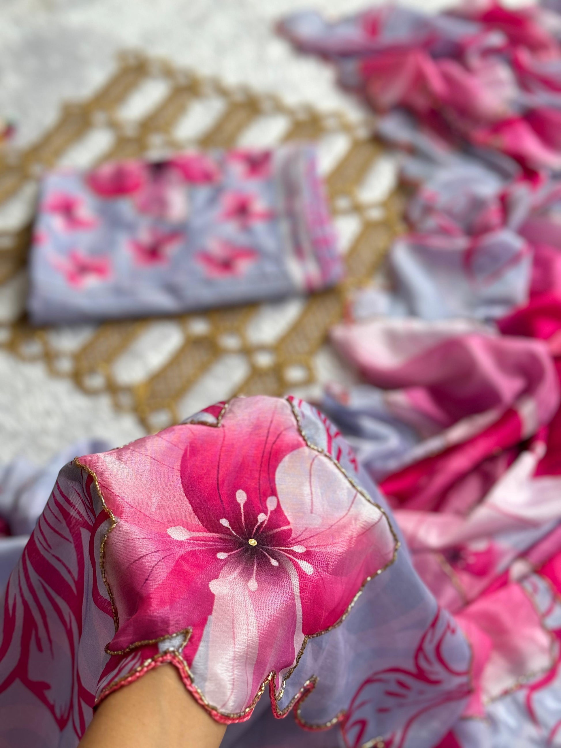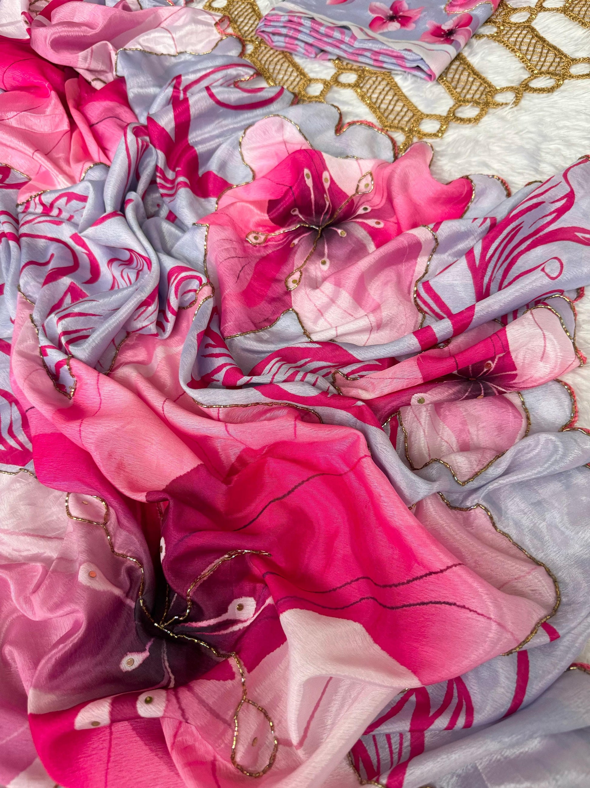 Pure Chinnon Silk Saree with elegant digital print, embellished with moti bits & cutdana handwork. Comes with matching blouse fabric – perfect for festive & party wear.