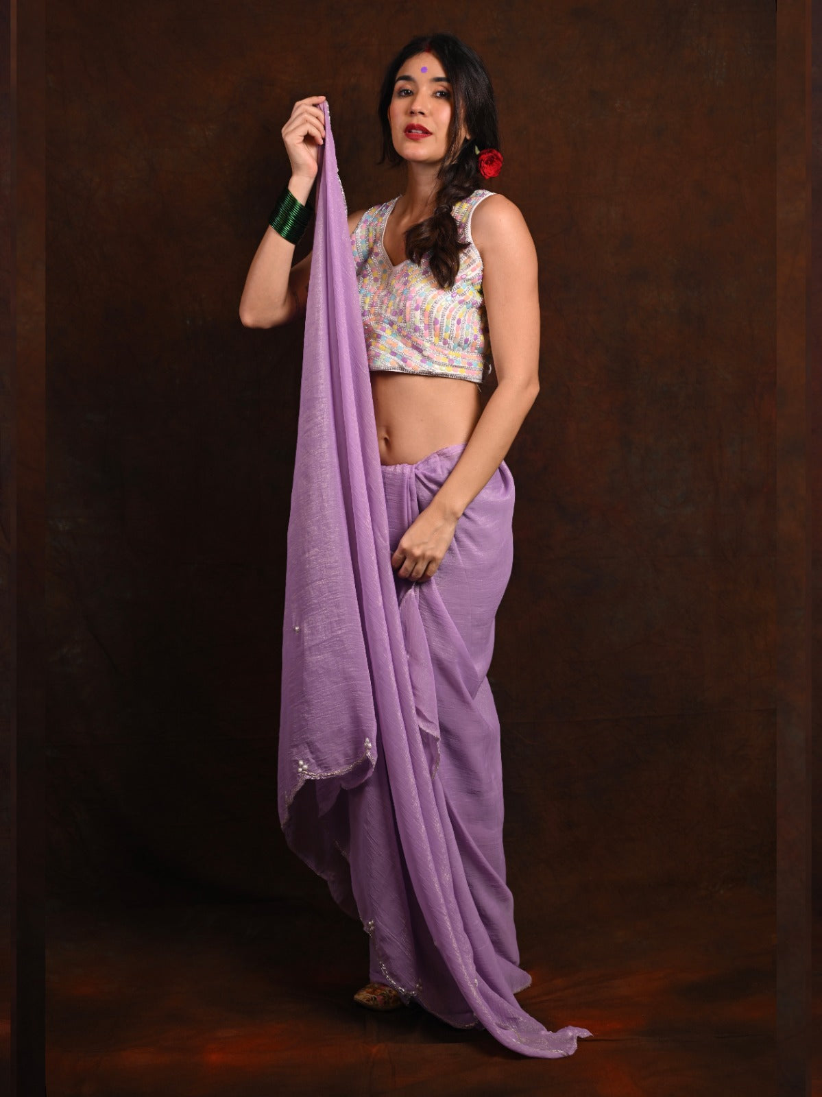 The blouse is pre-stitched and comes in sizes ranging from 38 to 42, ensuring a comfortable and perfect fit. This combination of the finely crafted saree and the elegant, bead-embellished blouse makes for a stunning ensemble that radiates sophistication and charm.