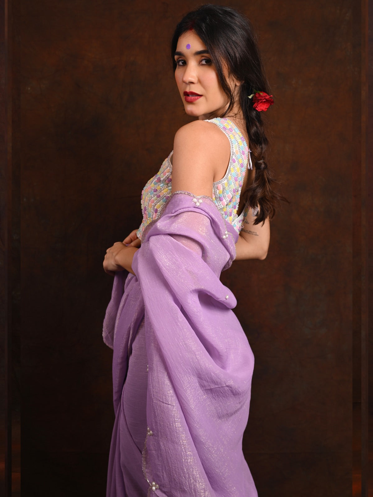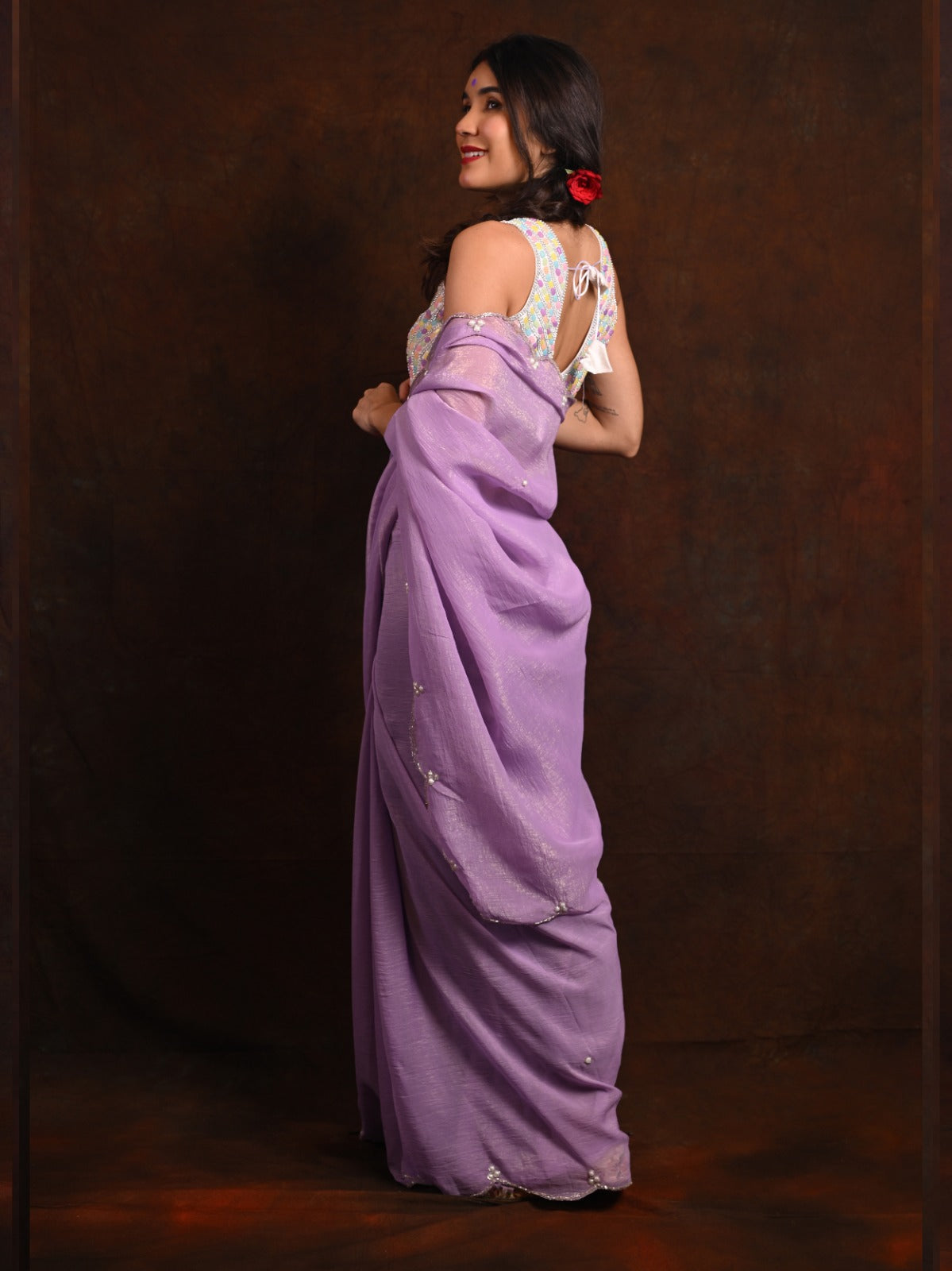 texture that beautifully enhances its elegance. The saree is adorned with intricate pearl and bead handwork, adding a touch of sophistication and grace. The fine detailing of the beadwork showcases exceptional craftsmanship, making this saree a perfect choice for special occasions and celebrations.