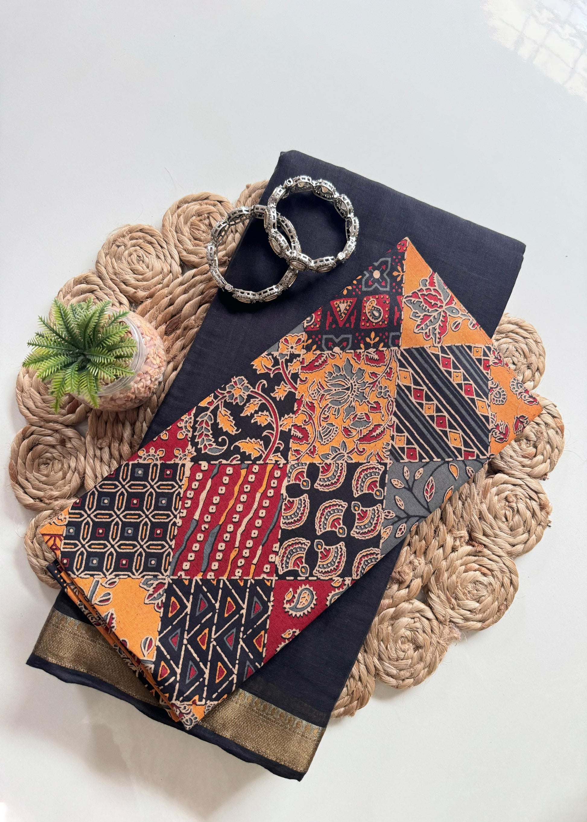 Graceful mul cotton saree with resham weaving border and tassels. Comes with a matching cotton blouse piece. Soft, lightweight, and perfect for elegant everyday wear or festive occasions.