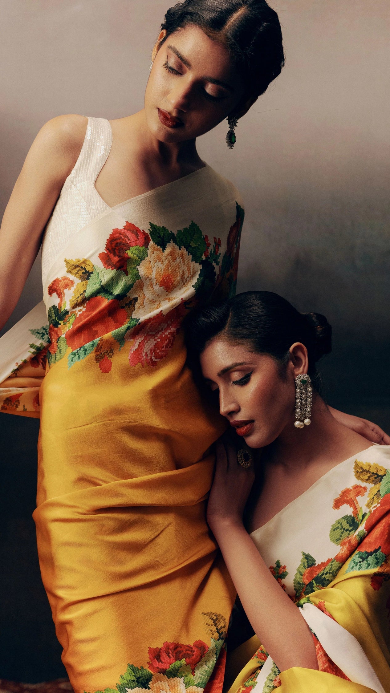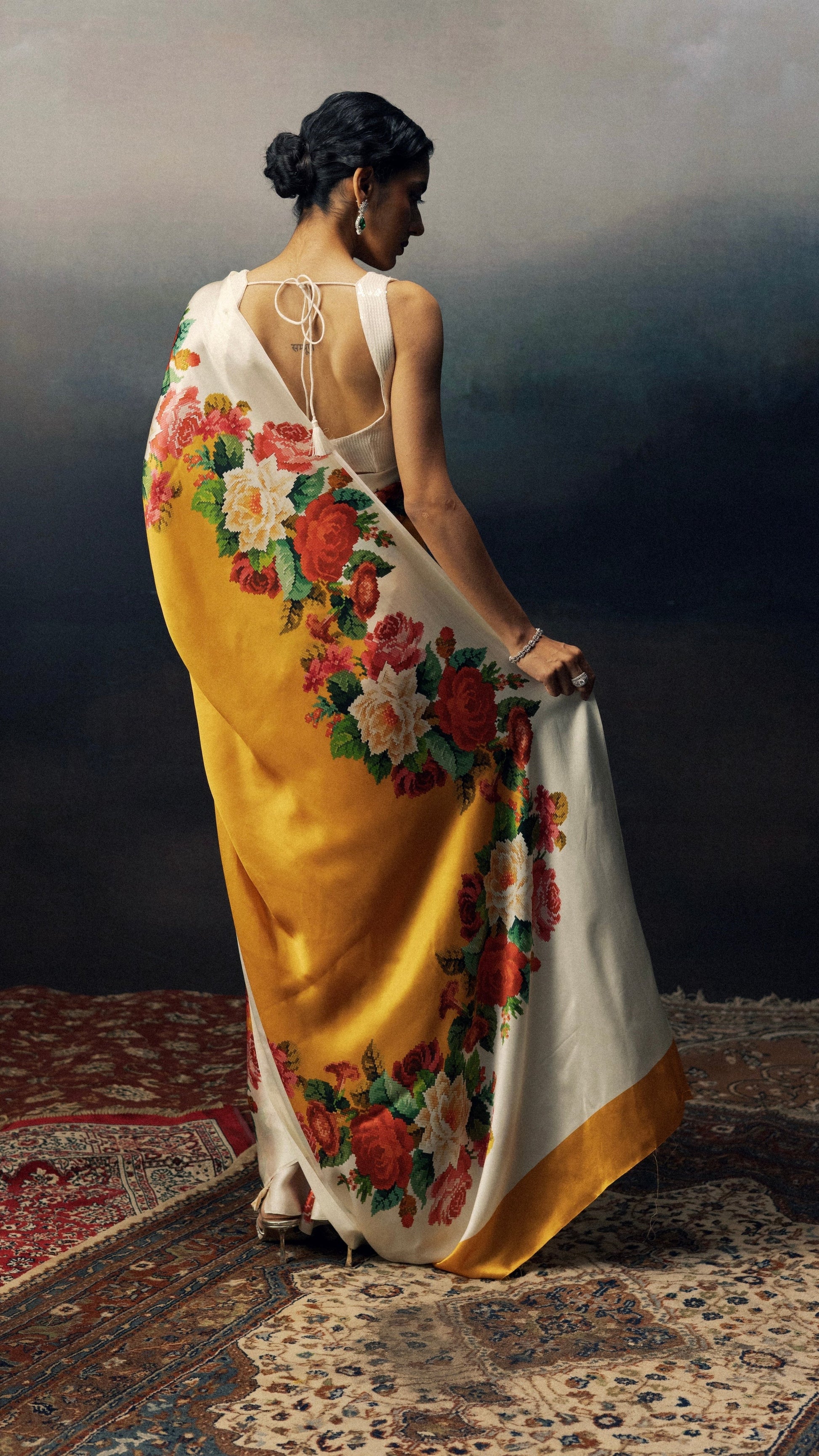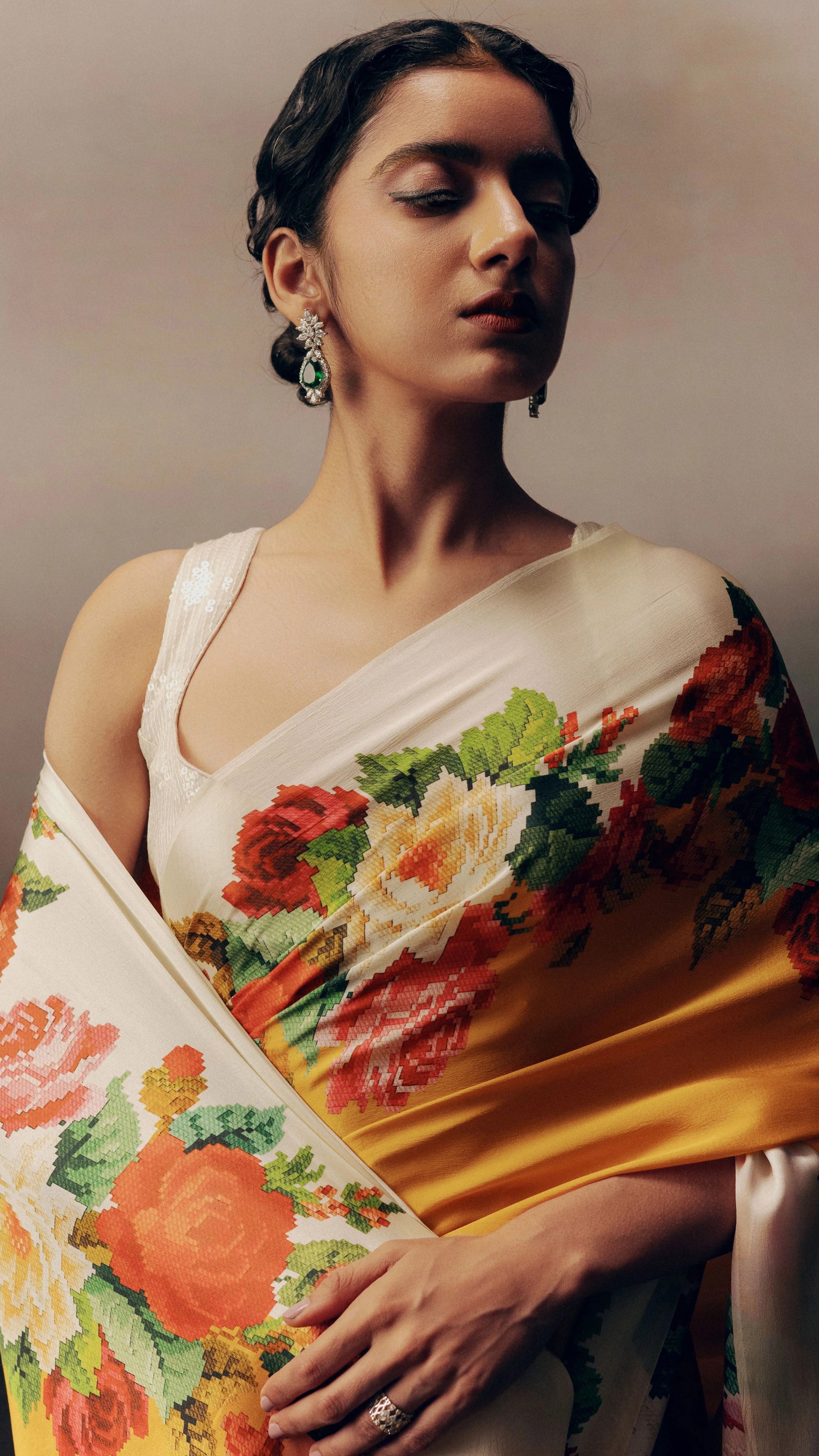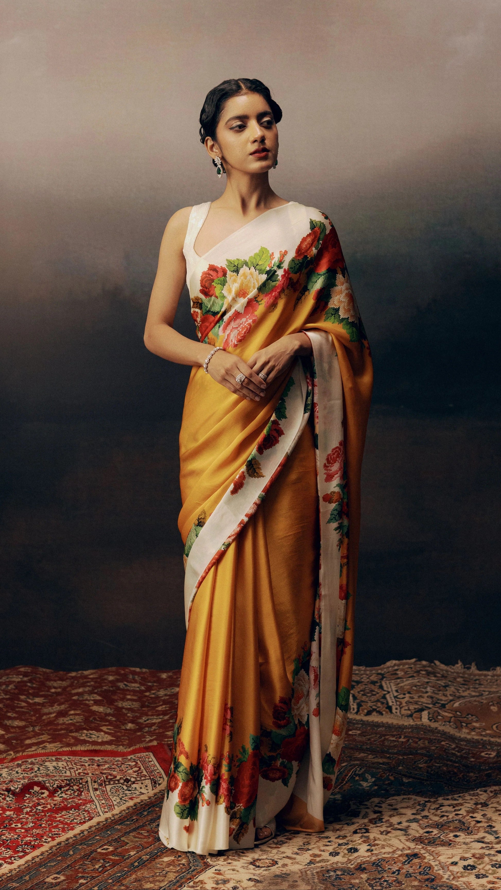 The smooth, lustrous rich silk fabric falls naturally, enhancing the silhouette while keeping the feel light and comfortable. Finished with a contrast border that adds subtle definition, this saree is a perfect choice for festive gatherings, formal occasions, and elegant day events. Pair it with minimal jewellery to let the print and fabric take centre stage.