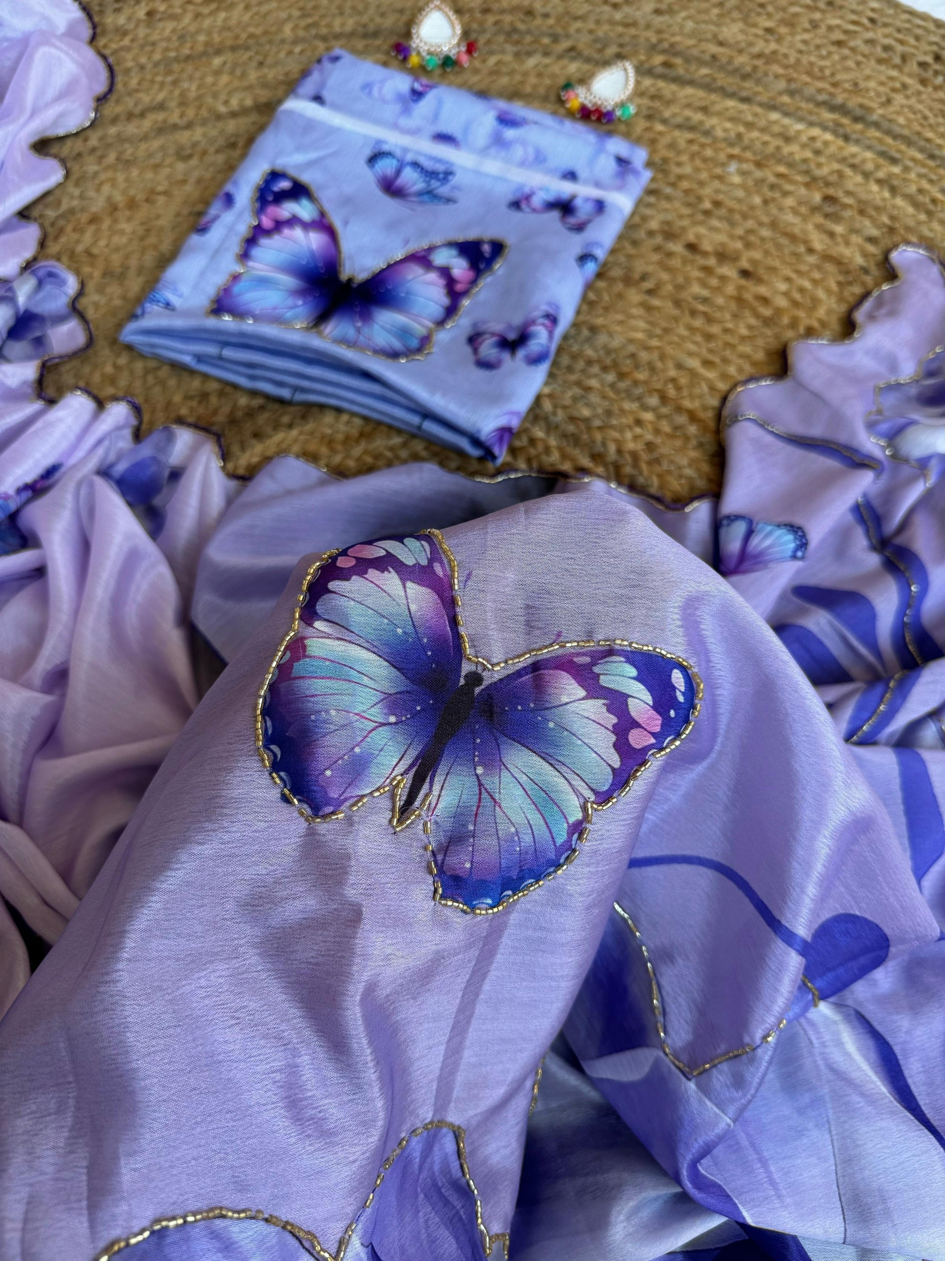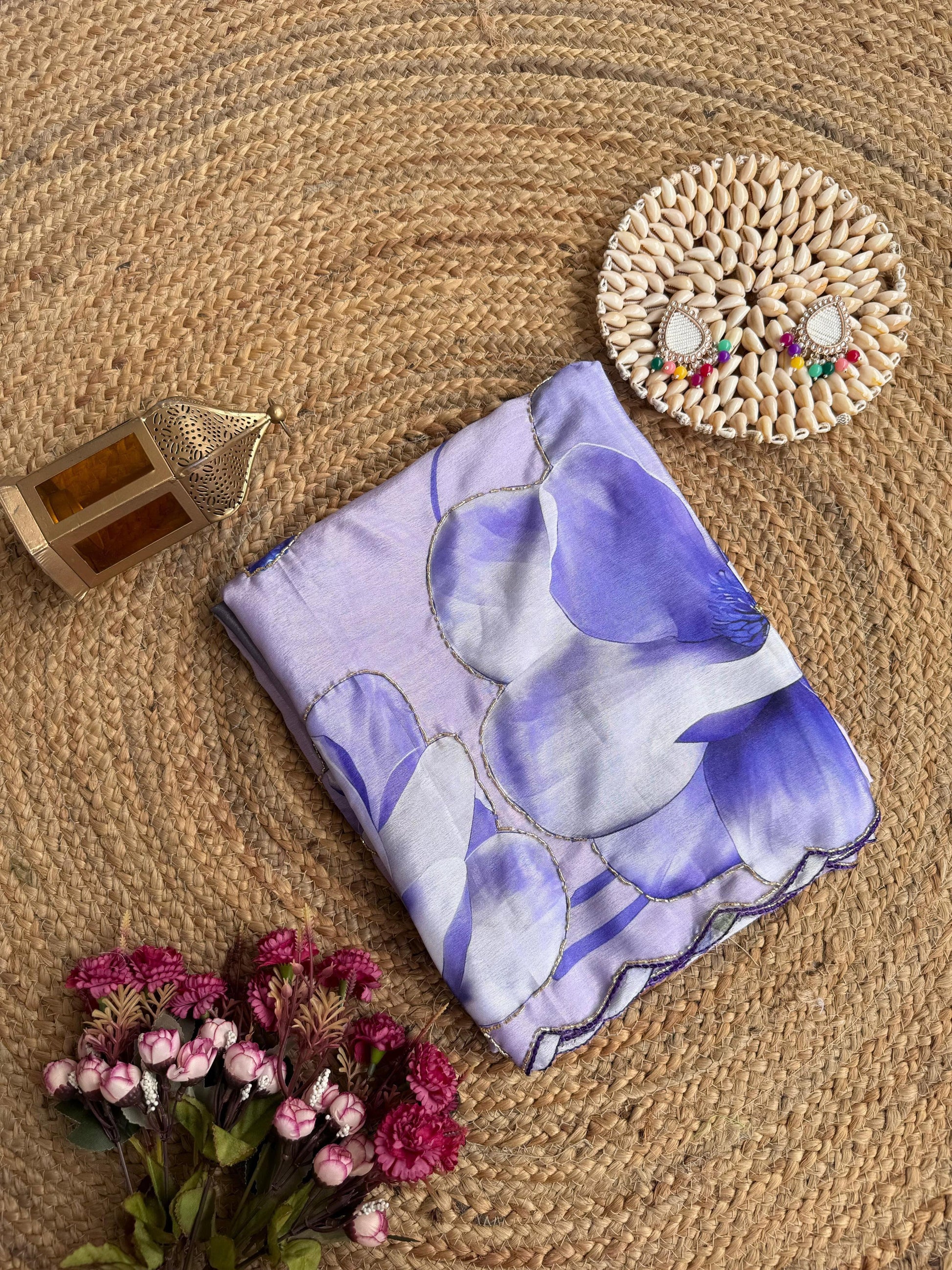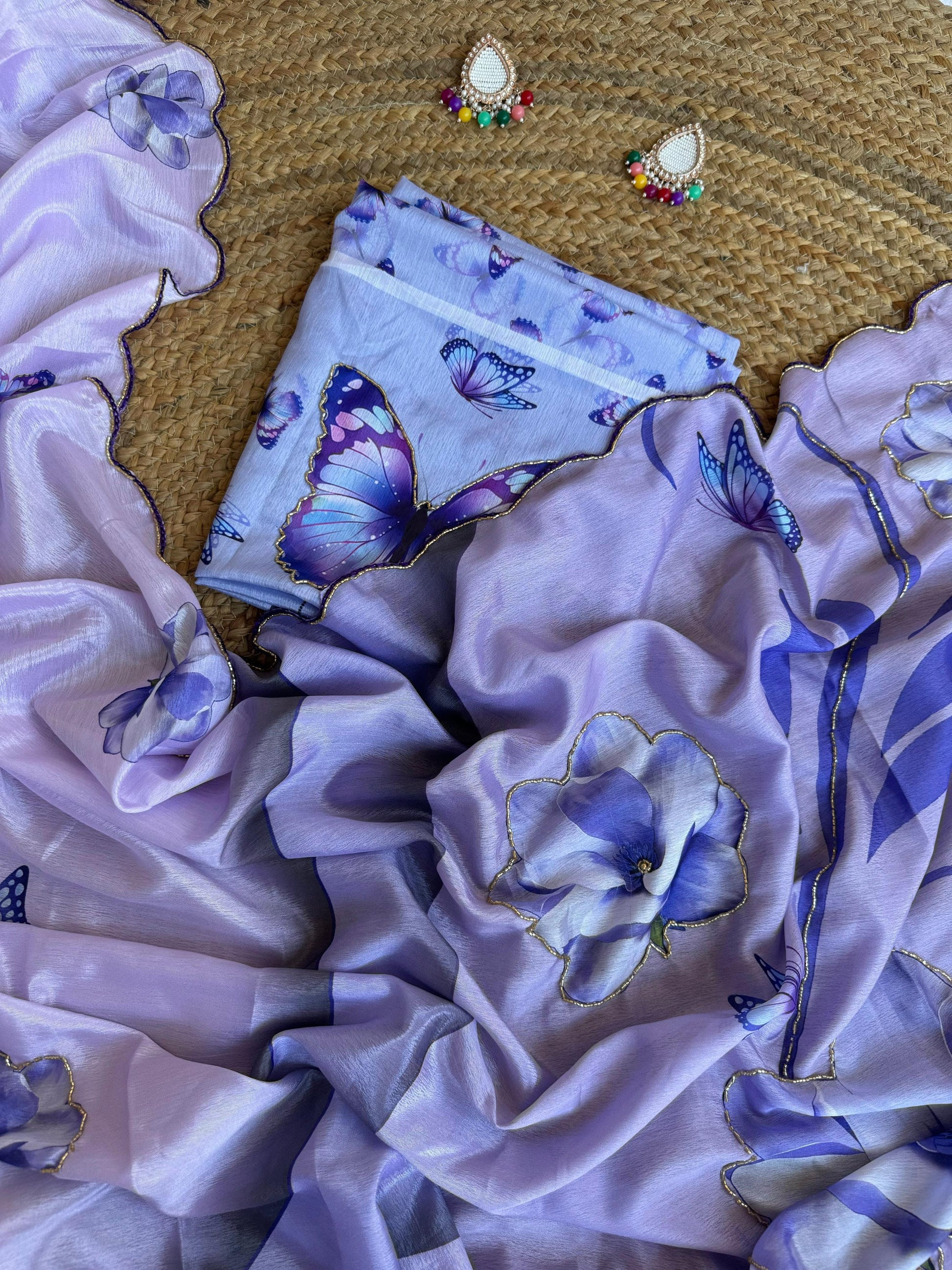 Pure Chinnon Silk Saree with elegant digital print, embellished with moti bits & cutdana handwork. Comes with matching blouse fabric – perfect for festive & party wear.