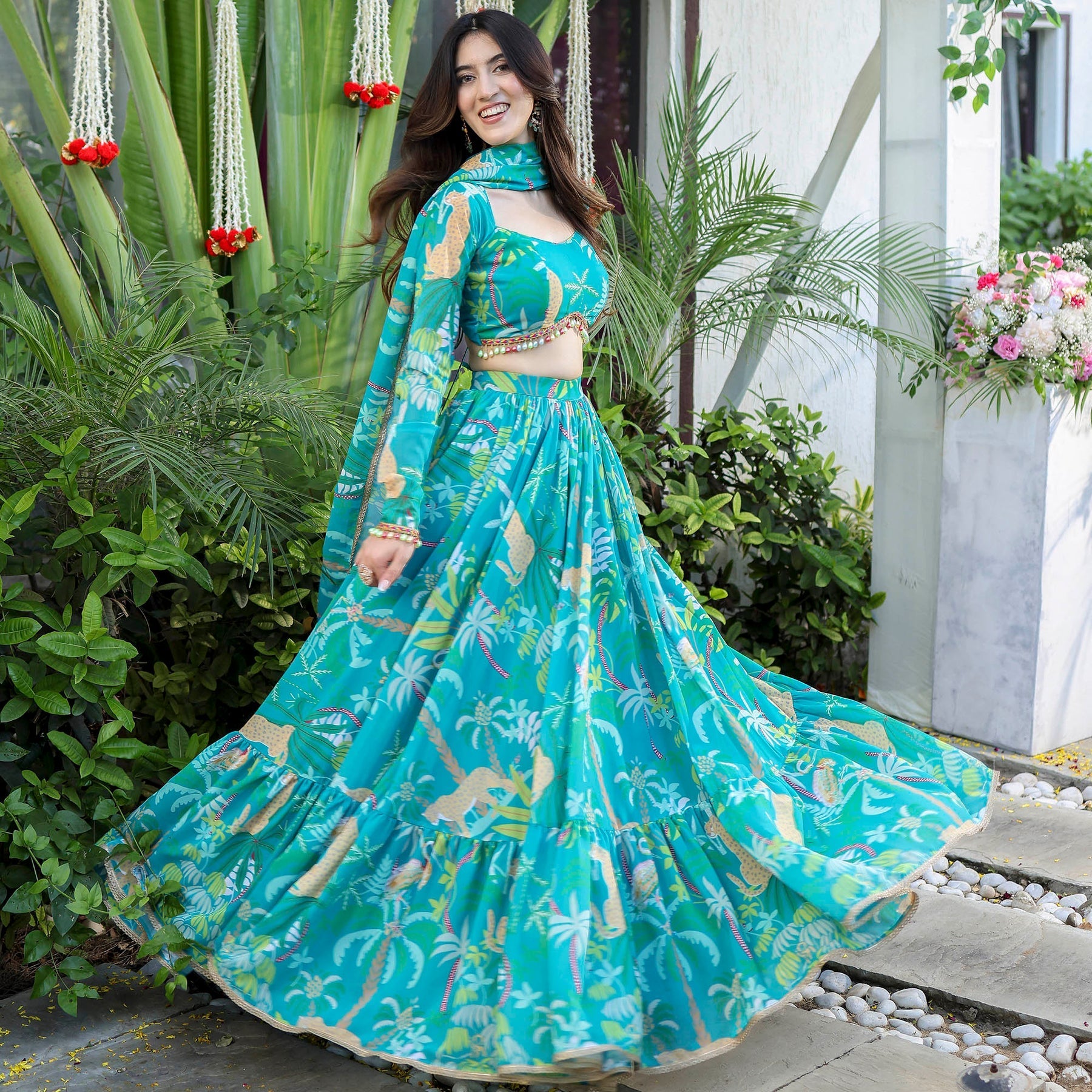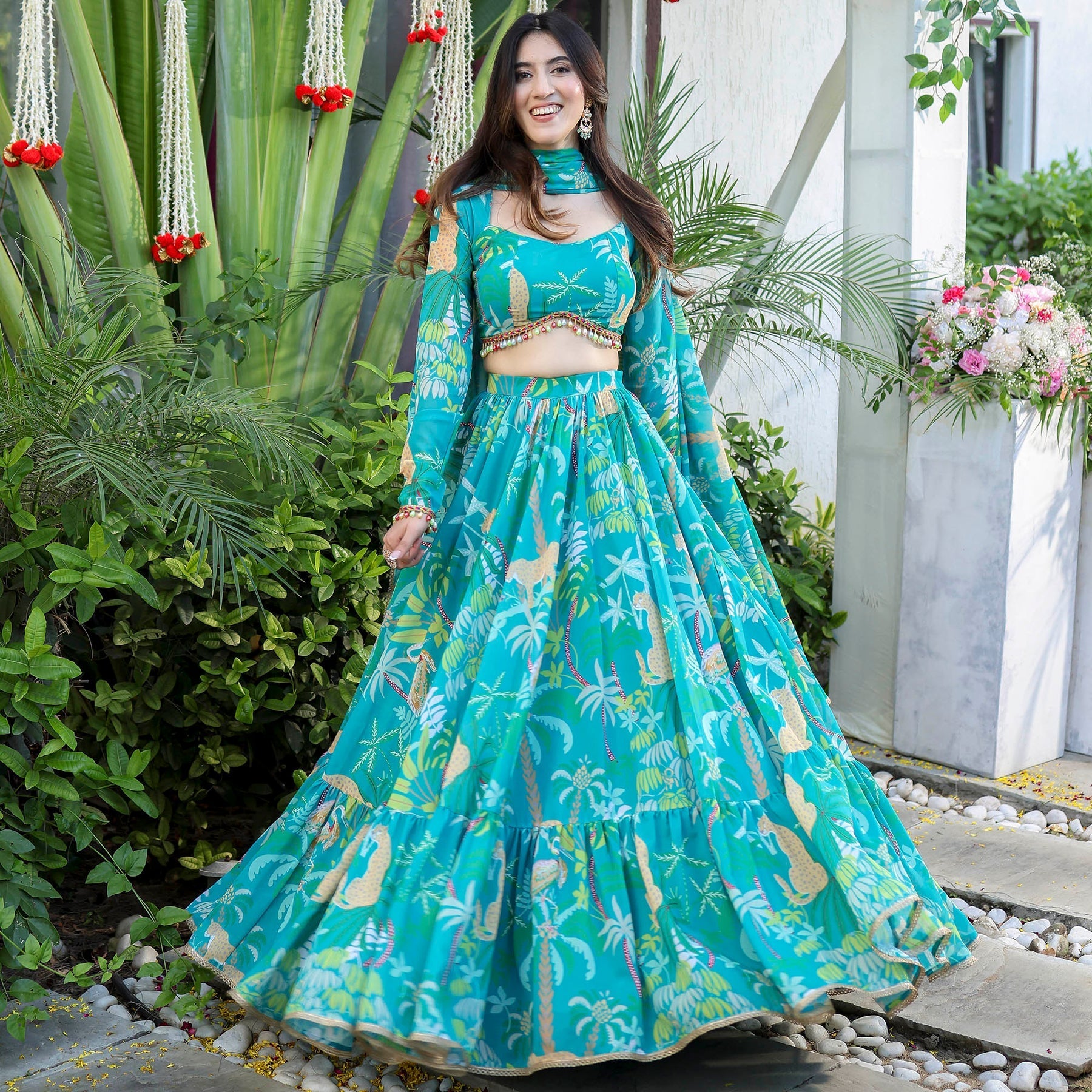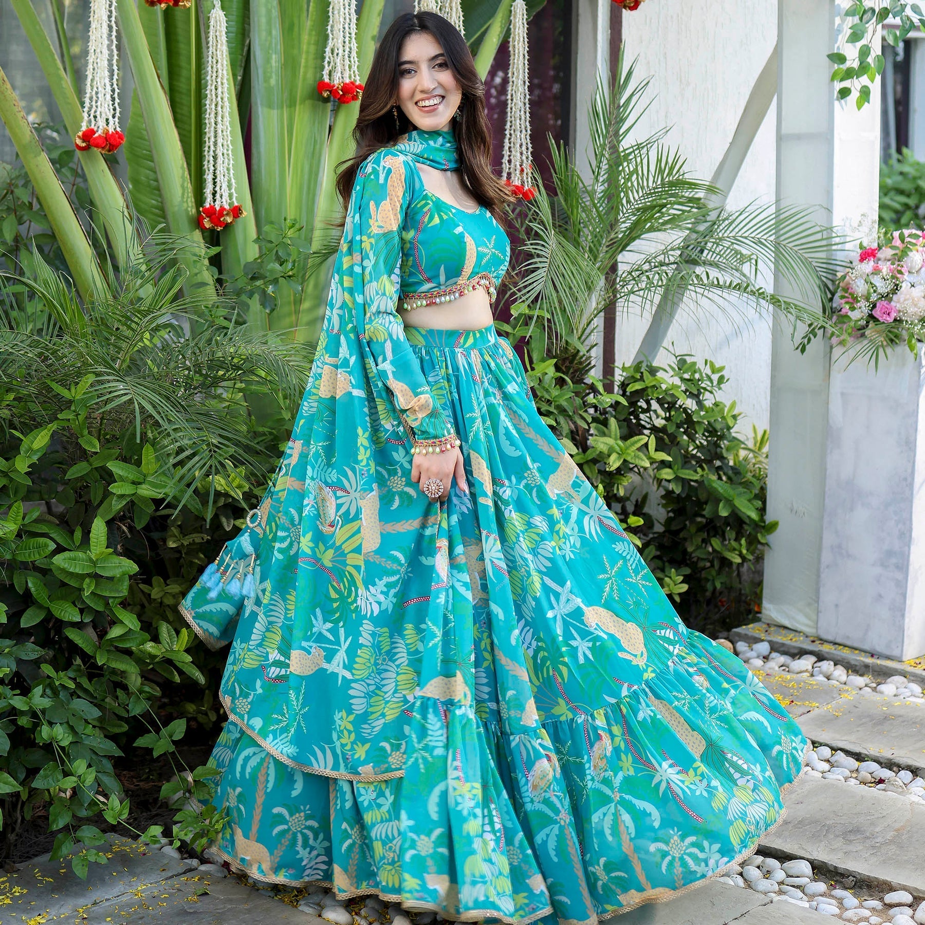Green Beautiful Printed Stylish Georgette Lehenga Set D5003