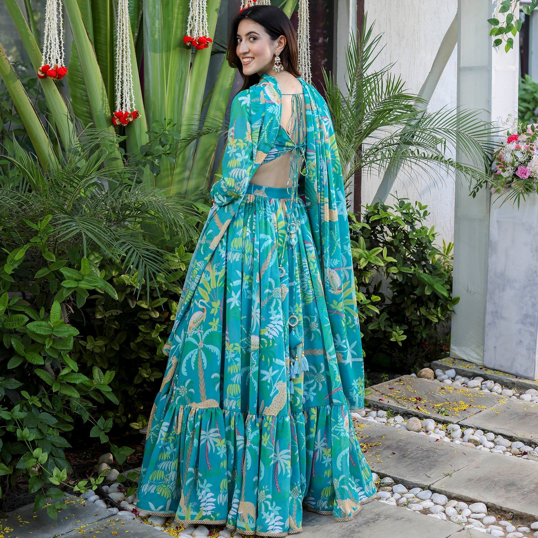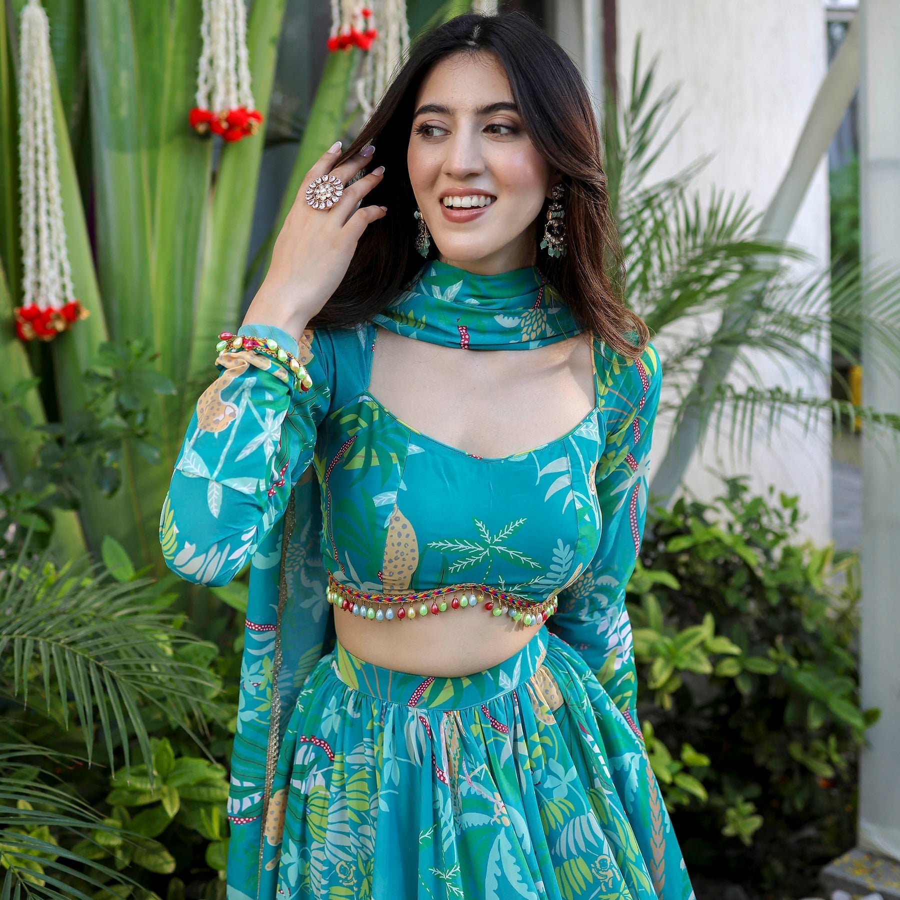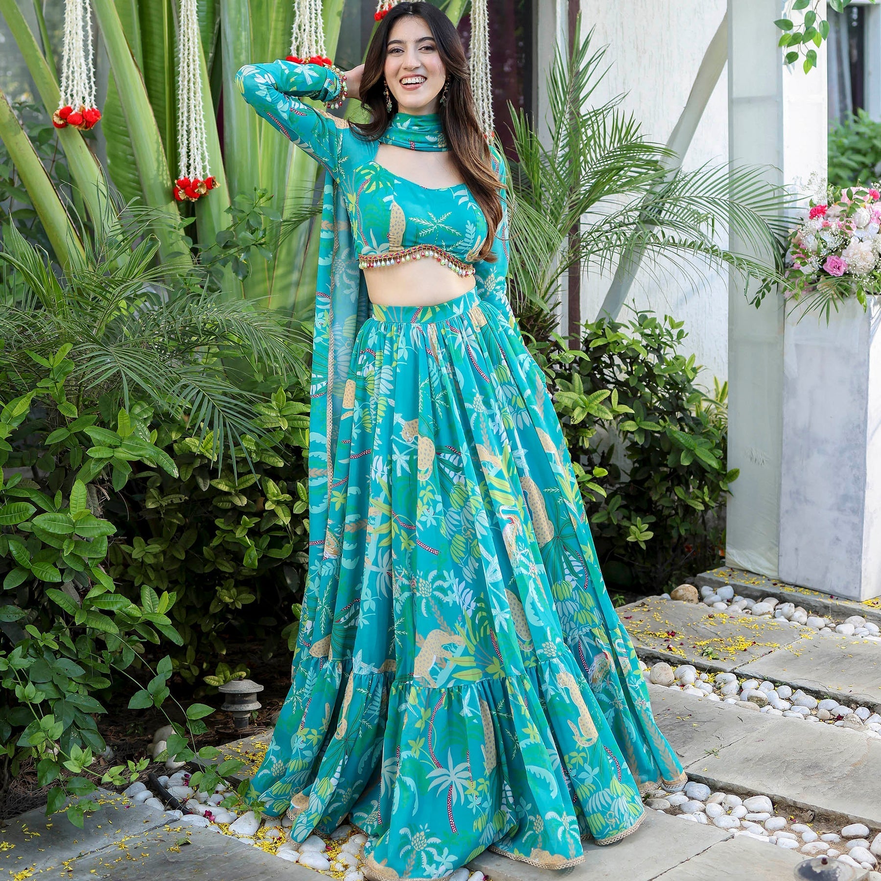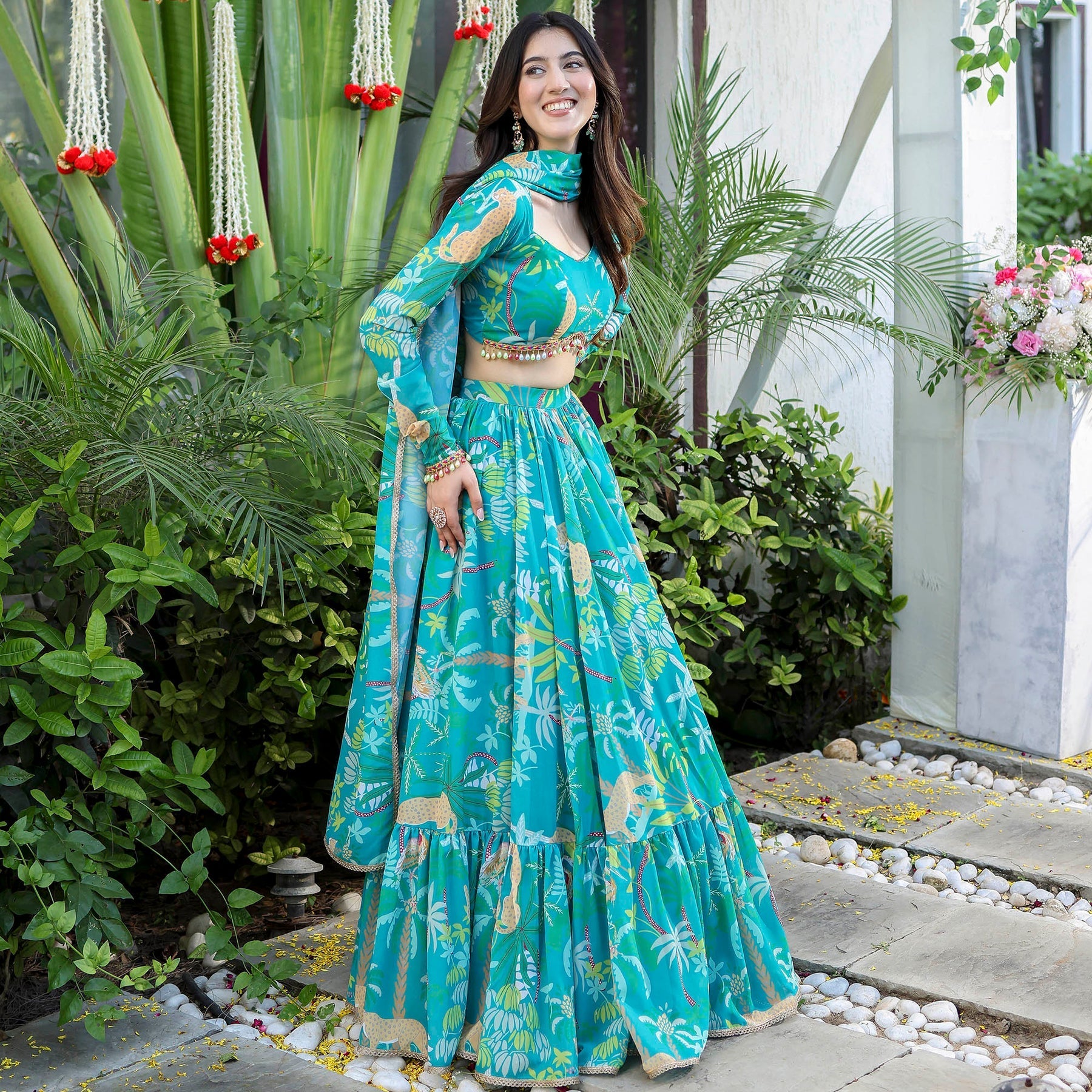 Green Beautiful Printed Stylish Georgette Lehenga Set D5003