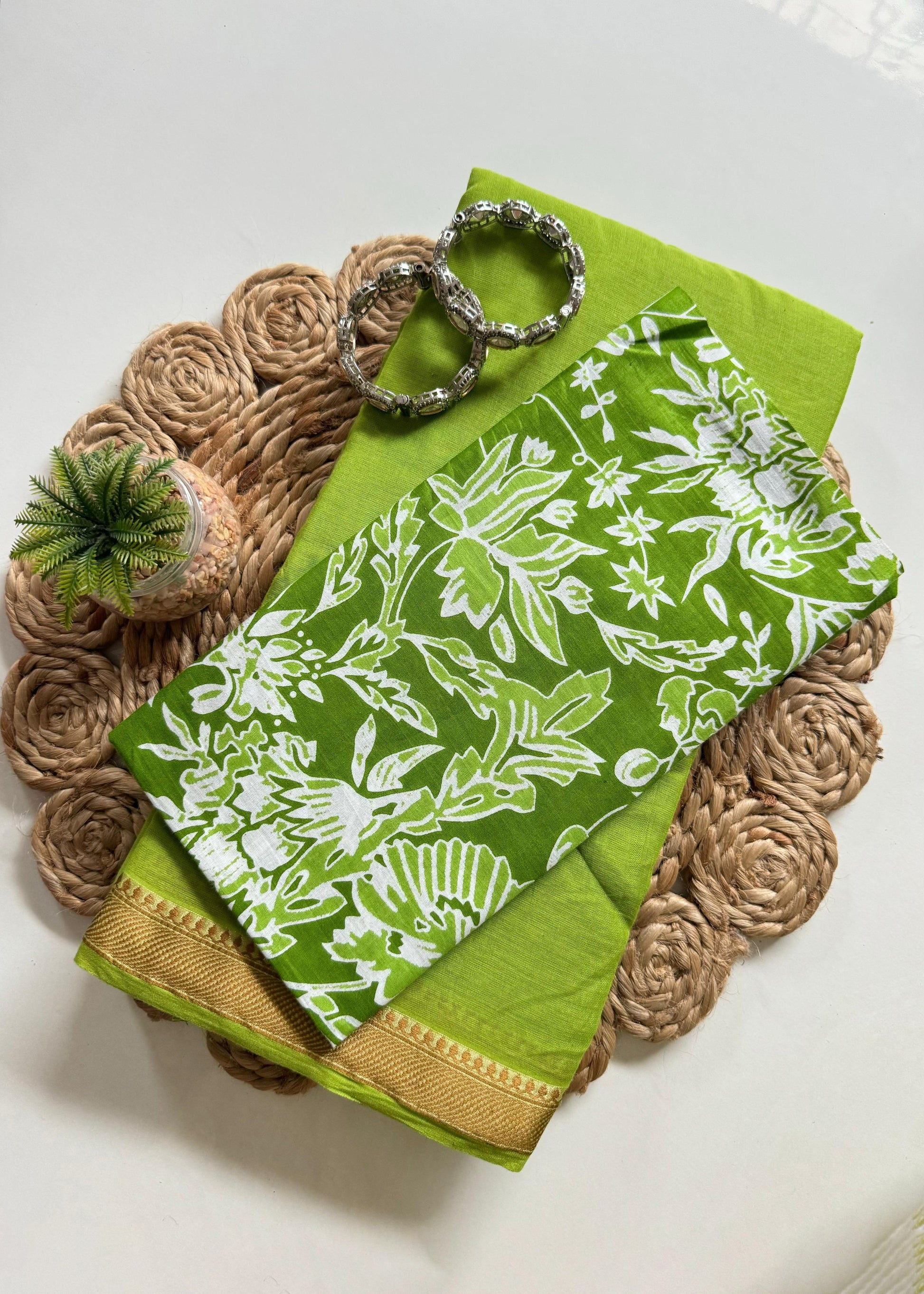 Elegant green mul cotton saree with golden zari border, paired with a stylish floral printed Unstitched blouse. Soft, breathable, and perfect for festive wear, office, or casual outings.