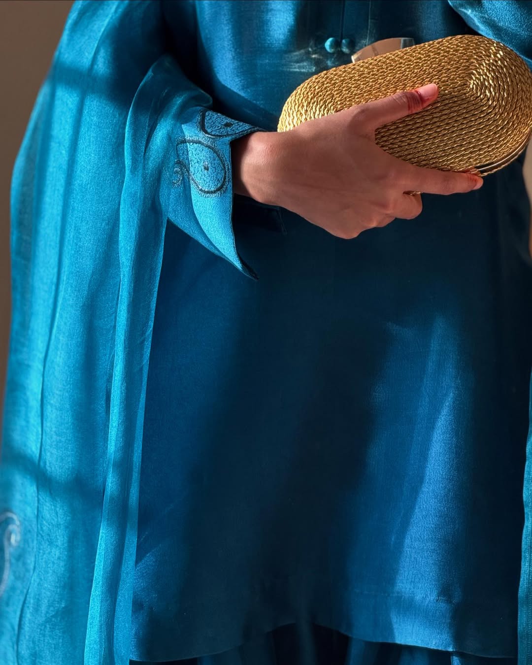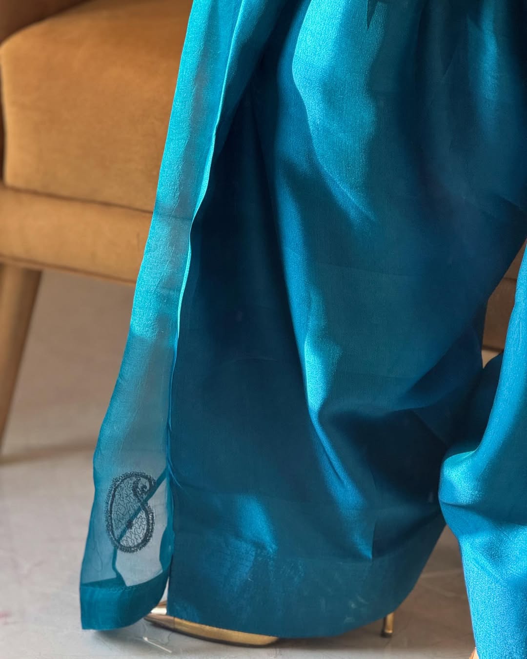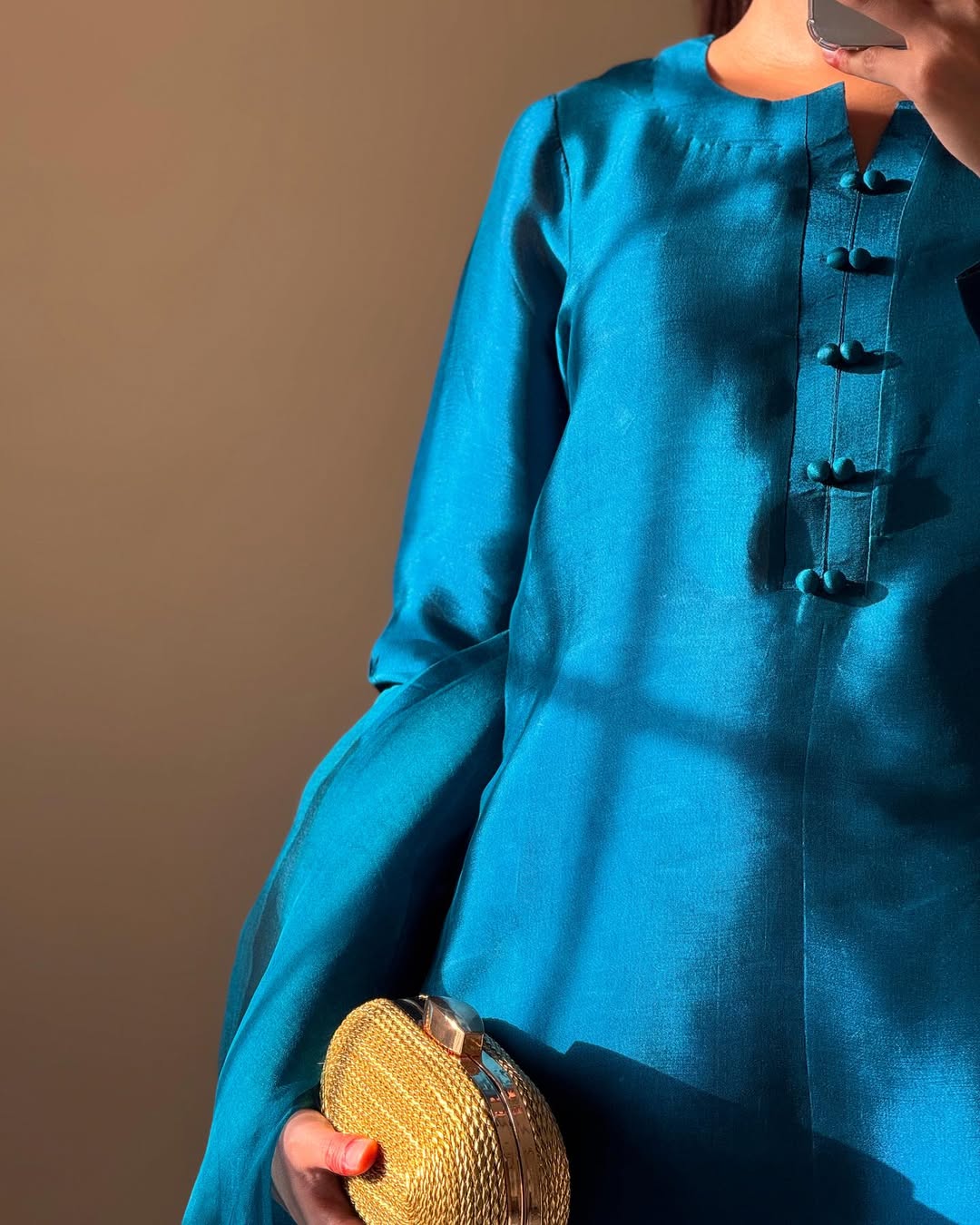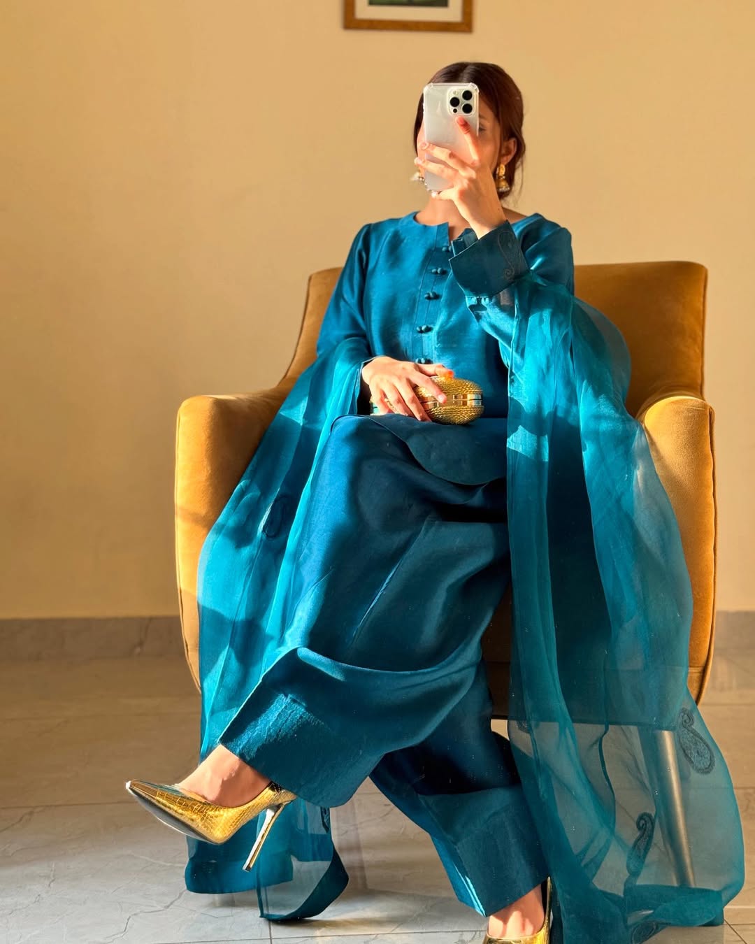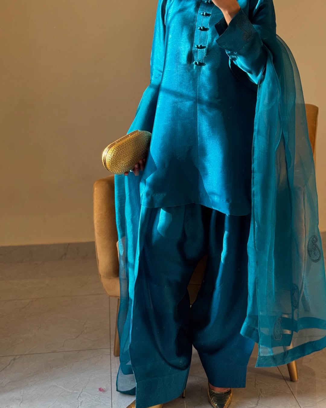 This elegant farshi suit is crafted from luxurious Japan satin, offering a rich, smooth texture with a subtle sheen. The deep teal hue adds a touch of sophistication, complemented by the matching organza dupatta adorned with delicate embroidery at the edges. Styled with golden heels and a shimmering clutch, this ensemble is perfect for festive occasions or formal gatherings, combining traditional grace with modern elegance.