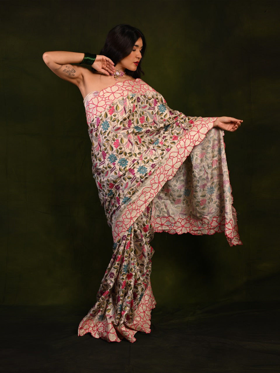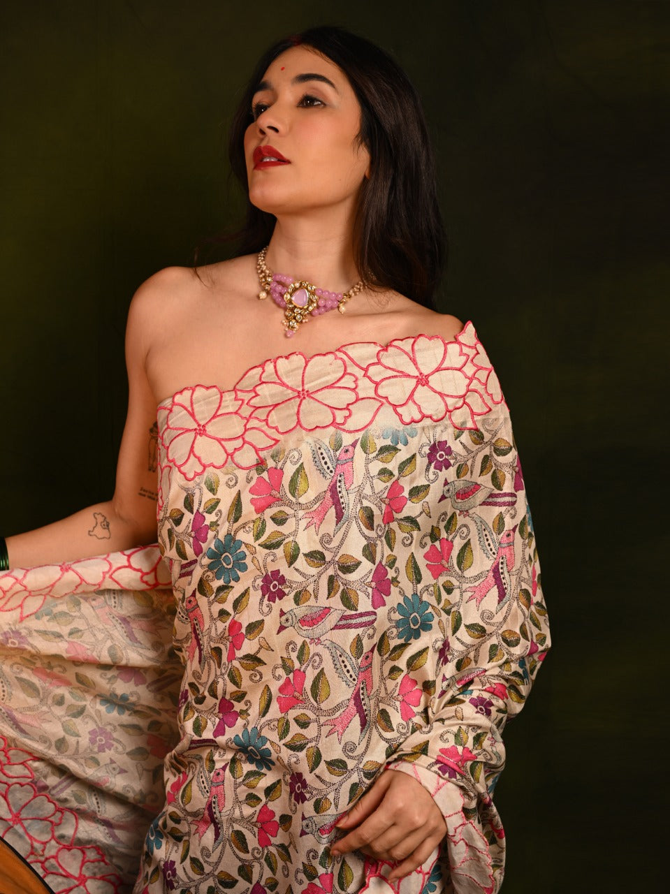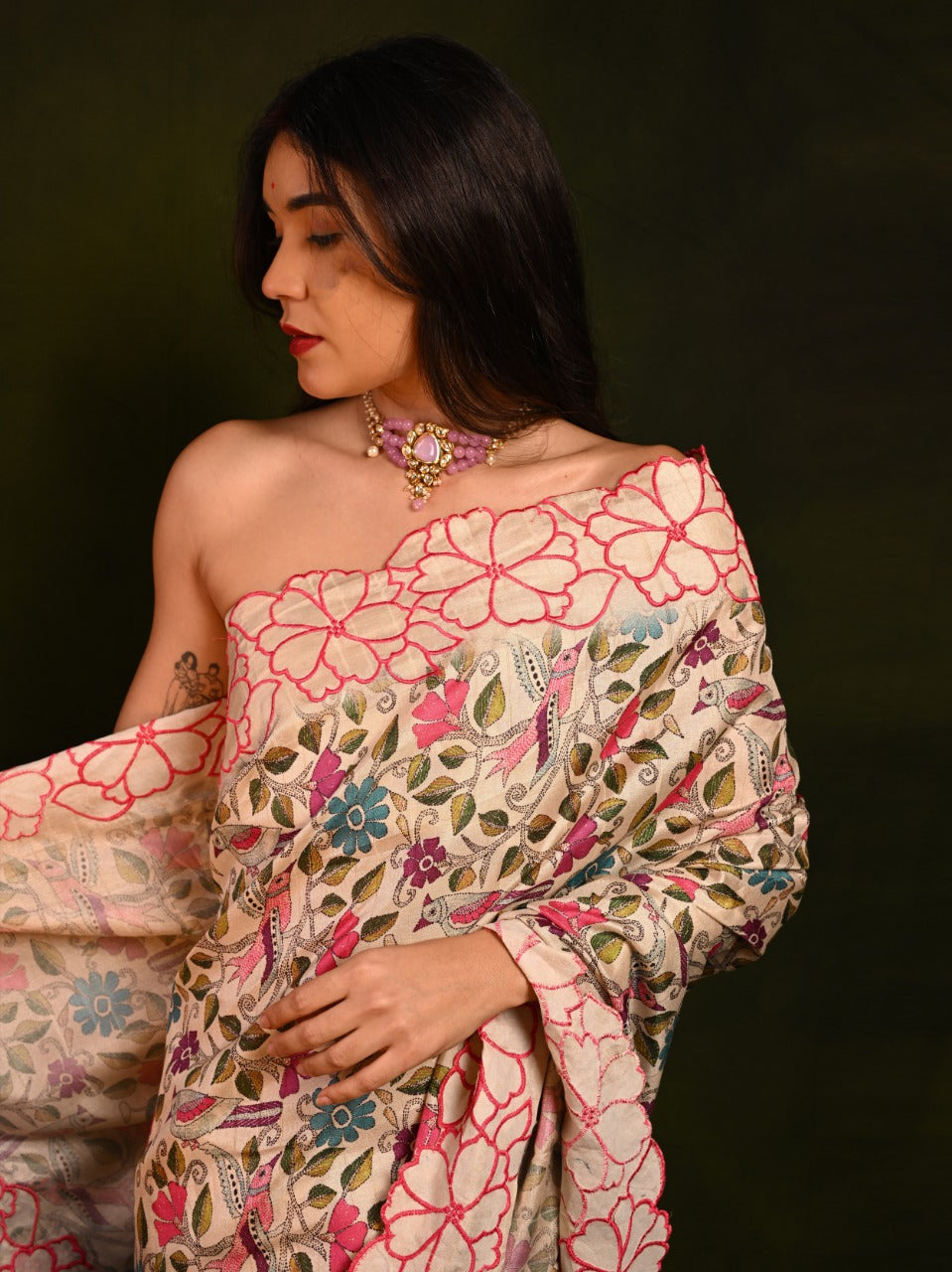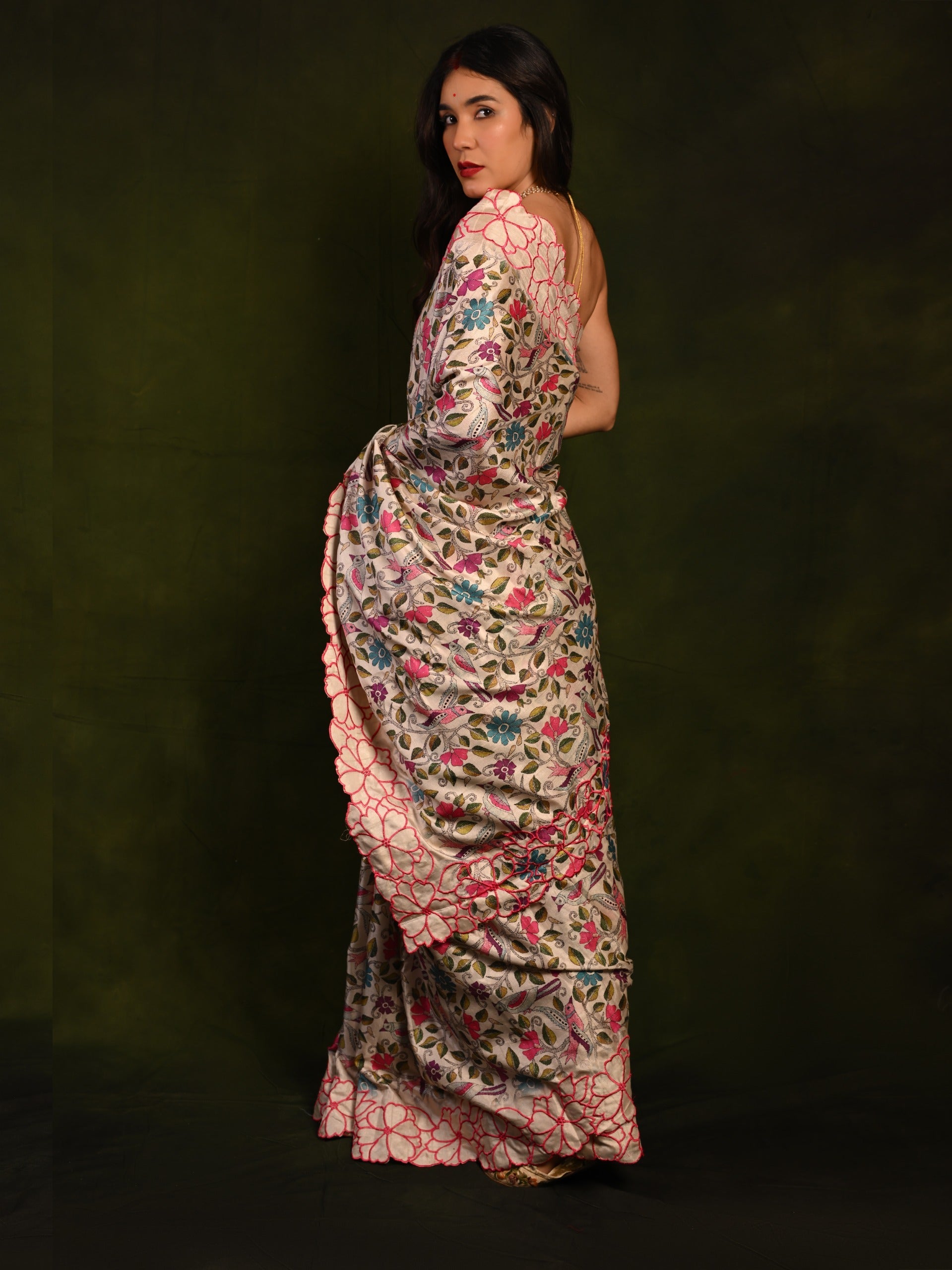 Luxurious Tussar Silk Saree with Digital Prints and Embroidered Cutwork S2018