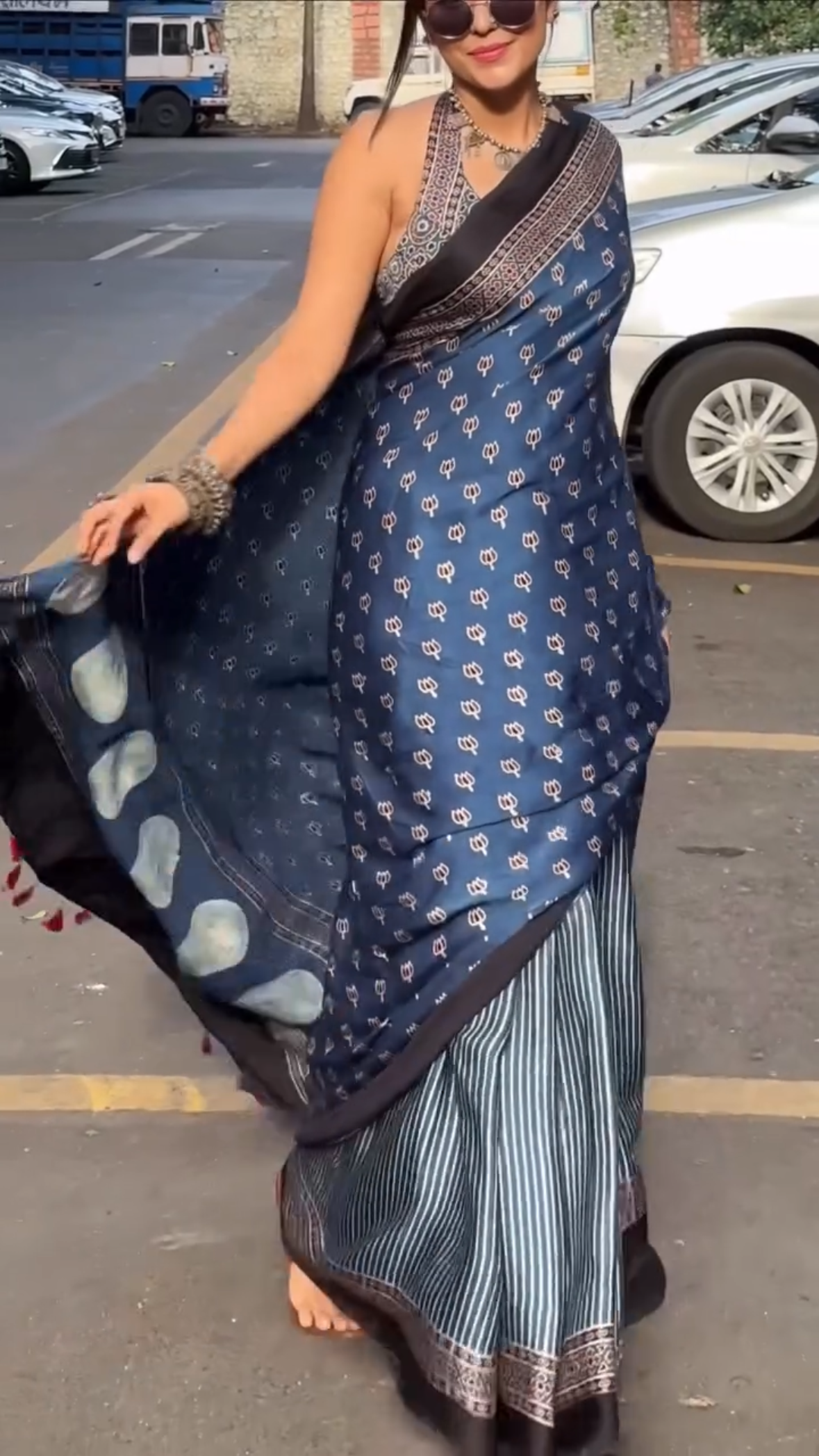Elevate your ethnic wardrobe with this elegant navy blue printed georgette saree, designed to offer effortless grace and timeless appeal. Crafted from lightweight georgette fabric, this saree drapes beautifully and ensures all-day comfort. The saree features delicate ethnic prints complemented by a contrasting border, making it perfect for festive occasions, casual gatherings, and evening wear.