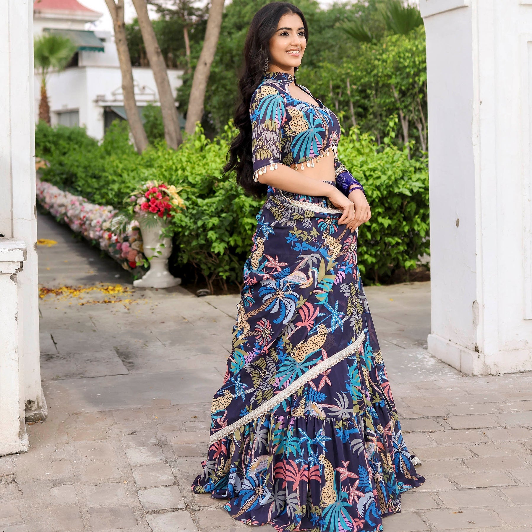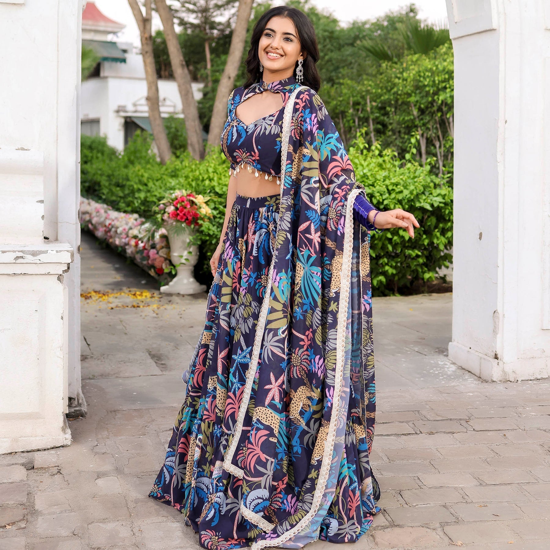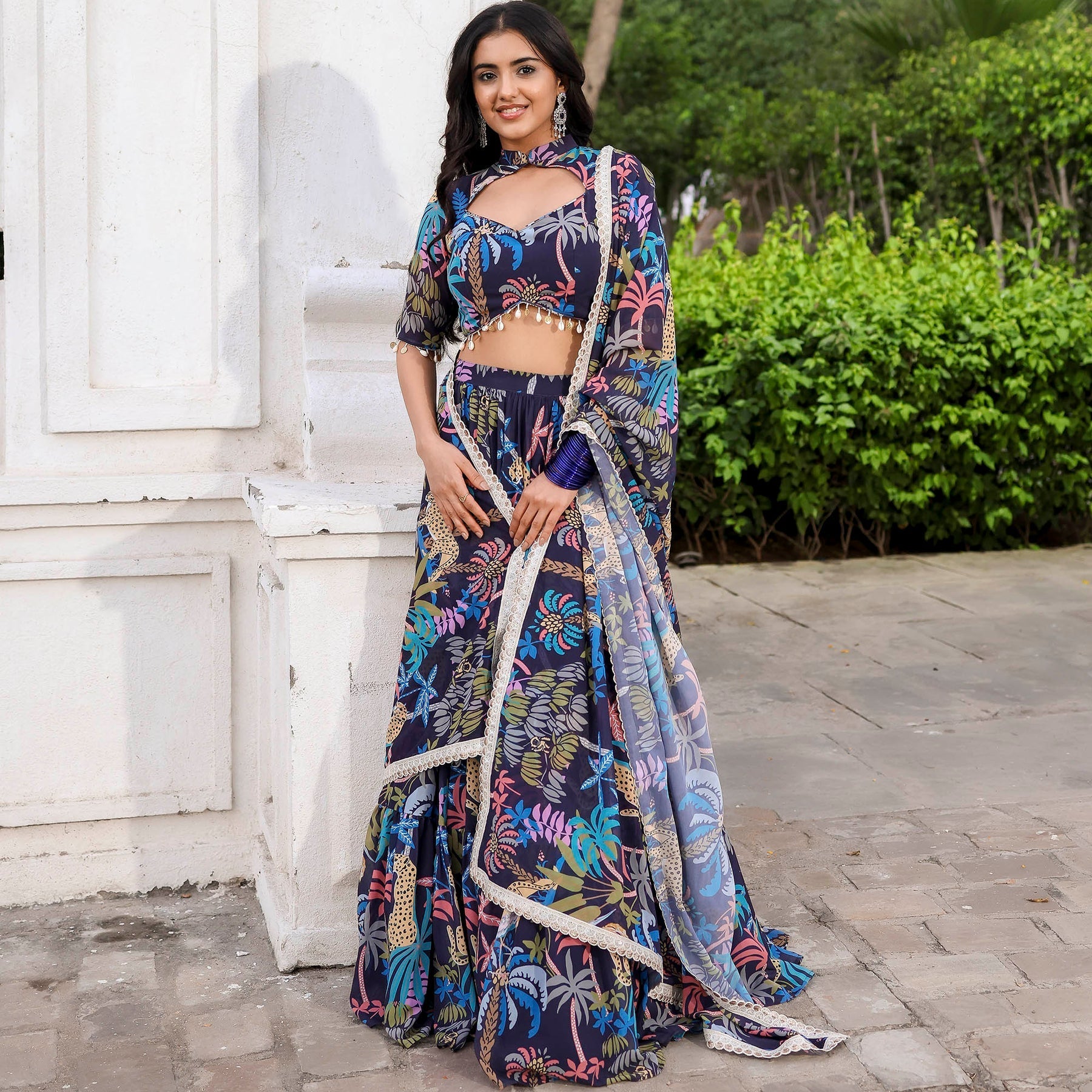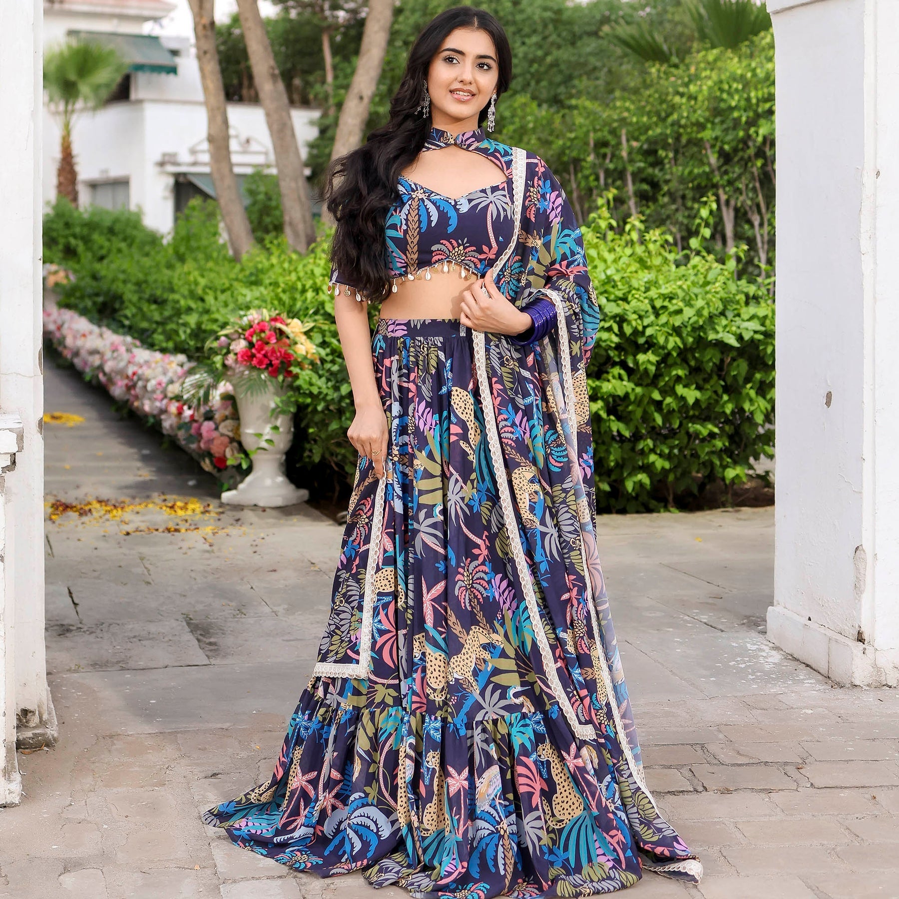 Envelop yourself in timeless elegance with our Navy Blue Forest Printed Stylish Lehenga Set. Featuring a sweetheart halter neckline and a regular fit, this ensemble exudes sophistication. The captivating forest print adds a touch of mystique, while the convenient zipper ensures effortless wear. Embrace high-rise grace and celebrate in style with this seamless and chic attire.