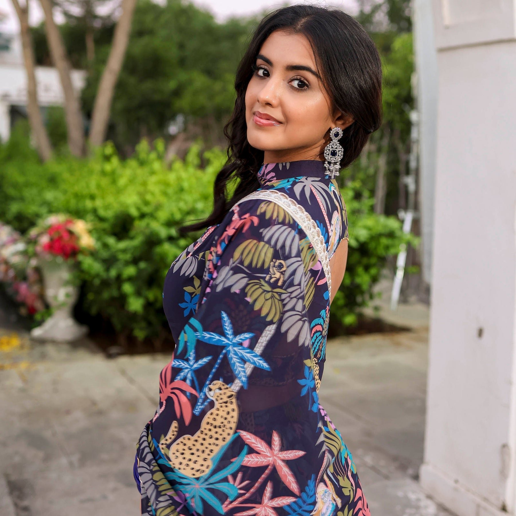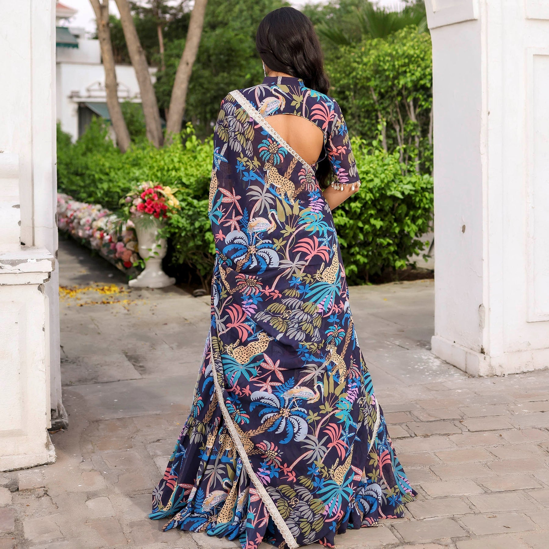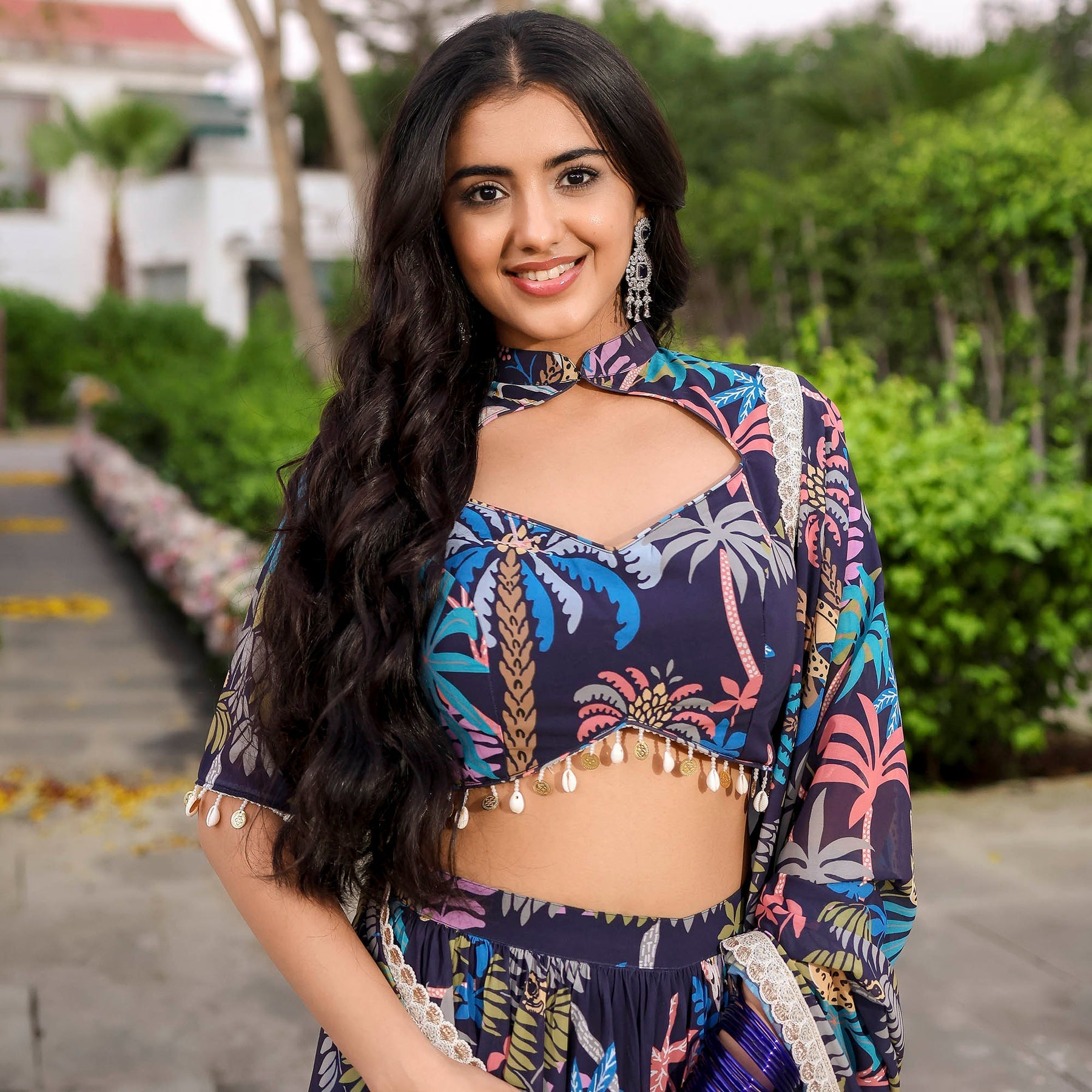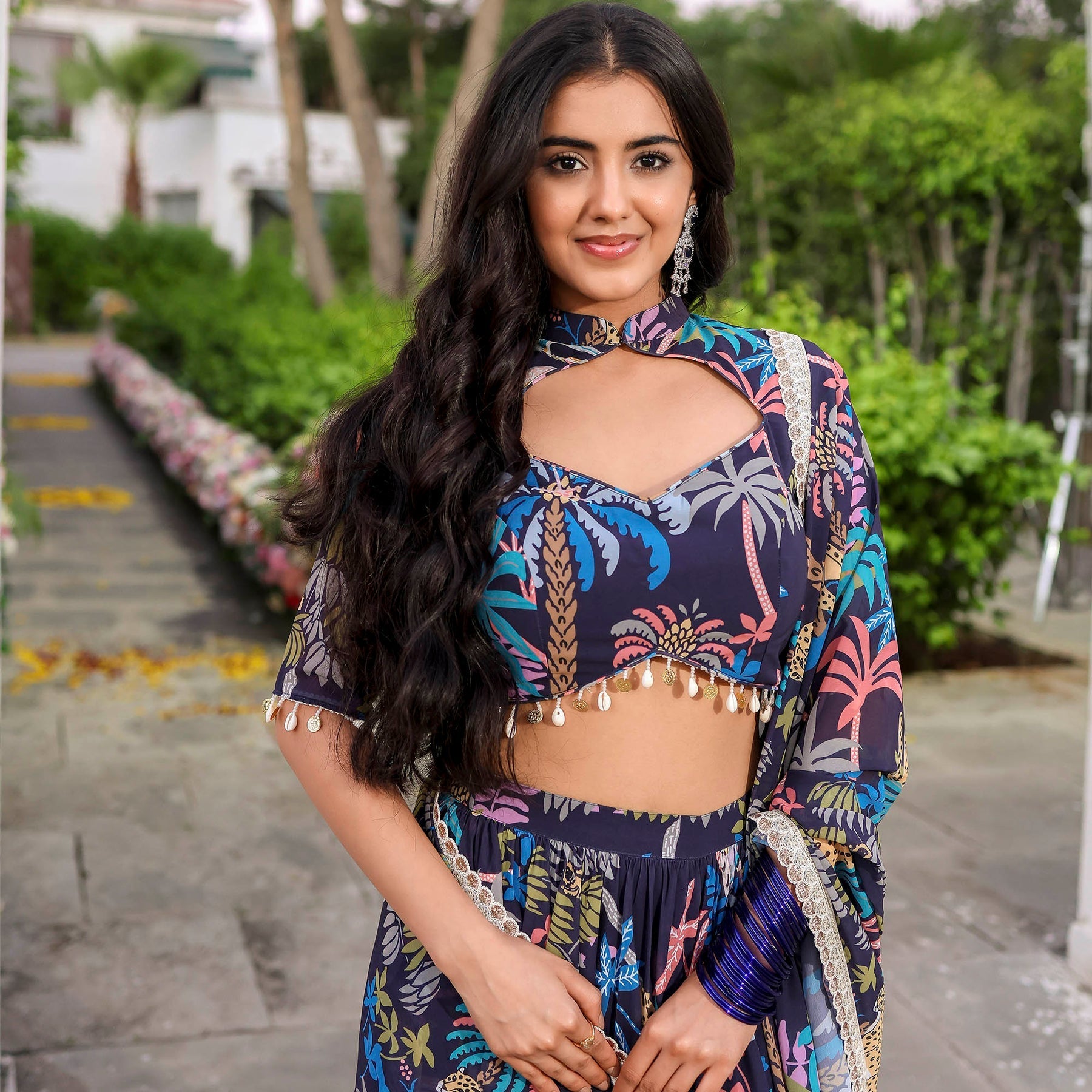 Envelop yourself in timeless elegance with our Navy Blue Forest Printed Stylish Lehenga Set. Featuring a sweetheart halter neckline and a regular fit, this ensemble exudes sophistication. The captivating forest print adds a touch of mystique, while the convenient zipper ensures effortless wear. Embrace high-rise grace and celebrate in style with this seamless and chic attire.