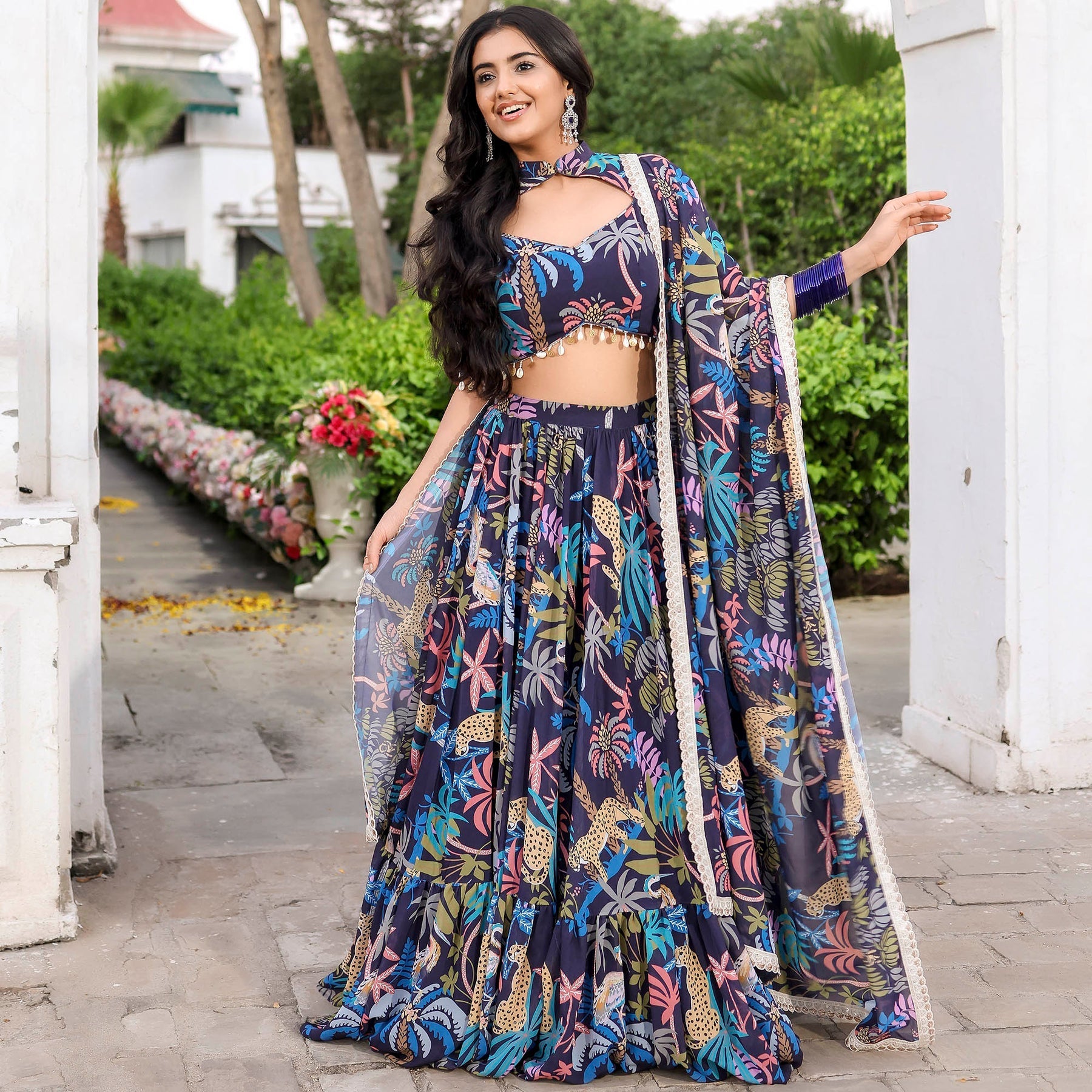 Navy Blue Forest Printed Stylish Georgette Lehenga Set D5001