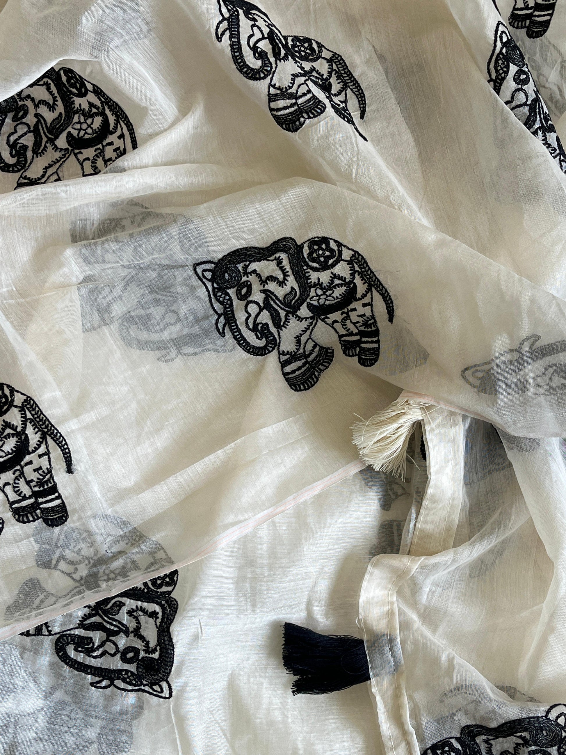 Elegant premium Chanderi saree featuring all-over elephant embroidery, cotton tassel pallu, and a matching plain black blouse piece. Perfect for festive, wedding & party wear.