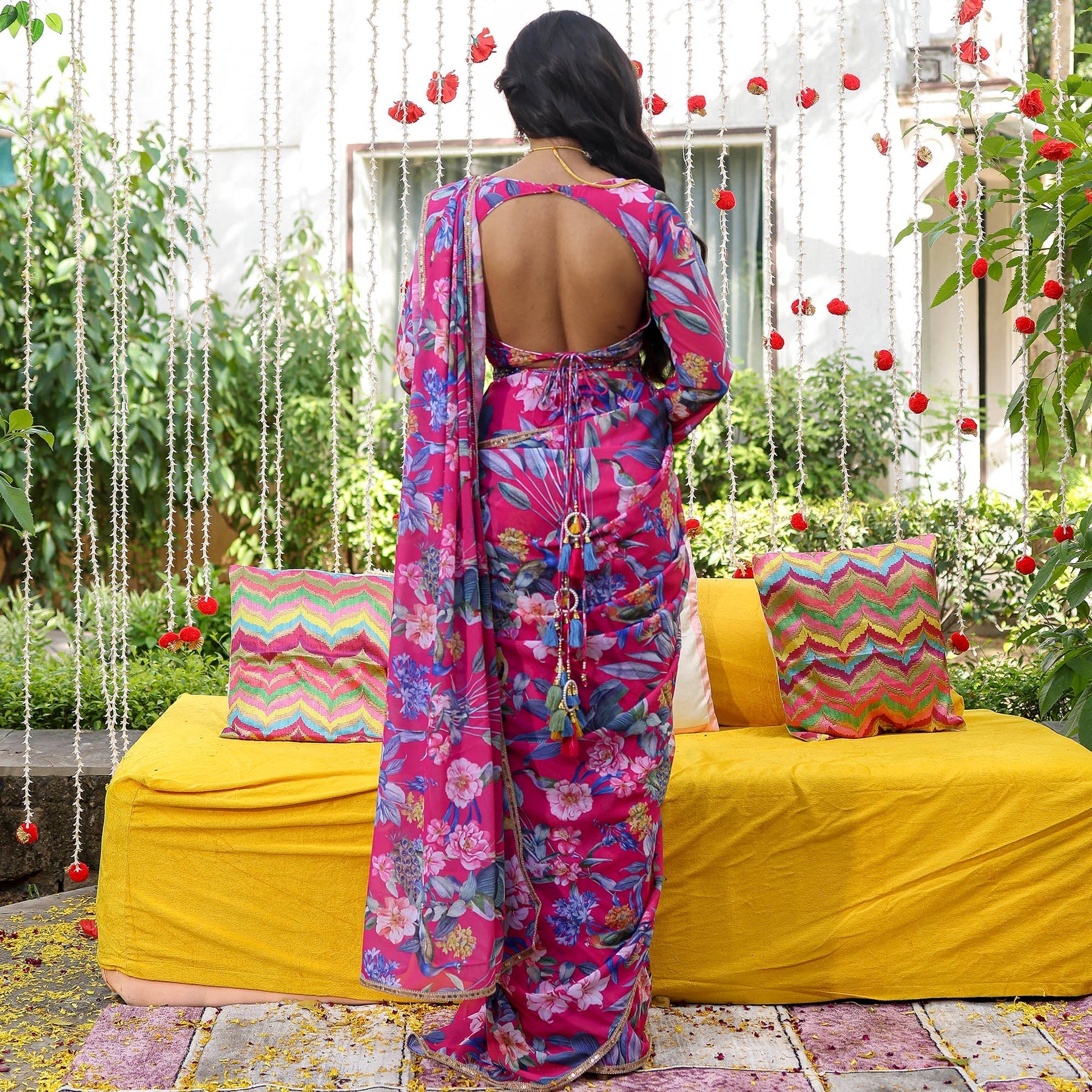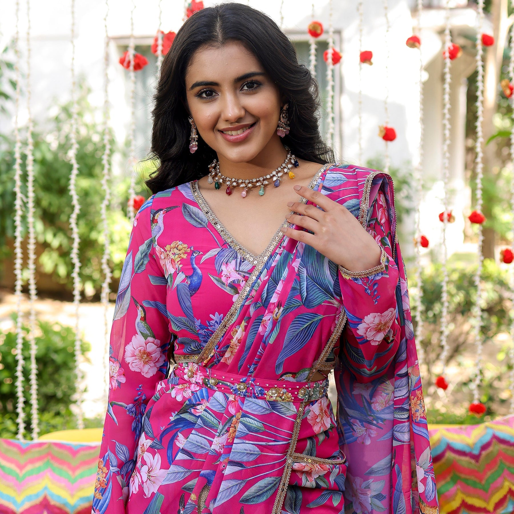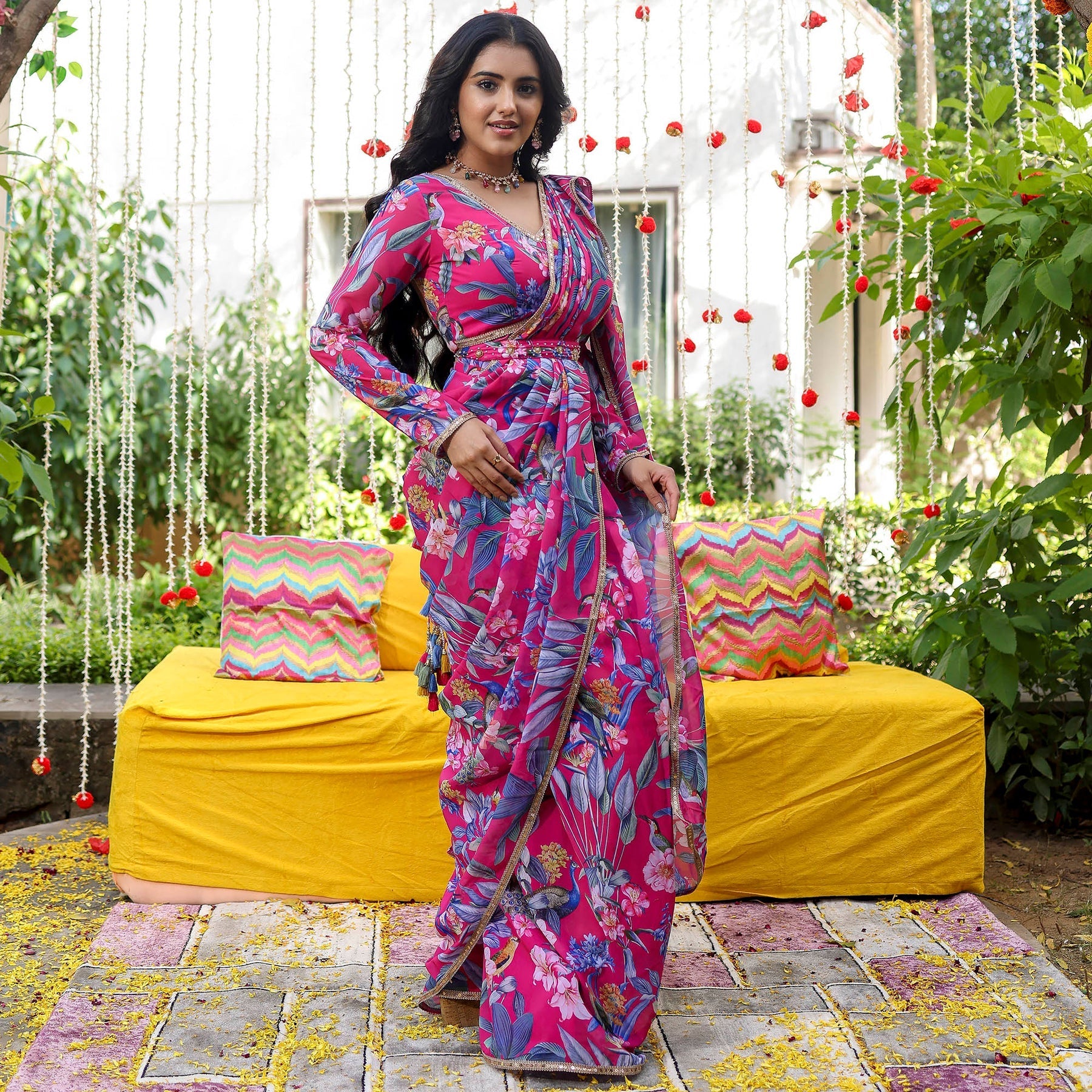 Premium Dark Pink Flower Print Georgette Saree D5013