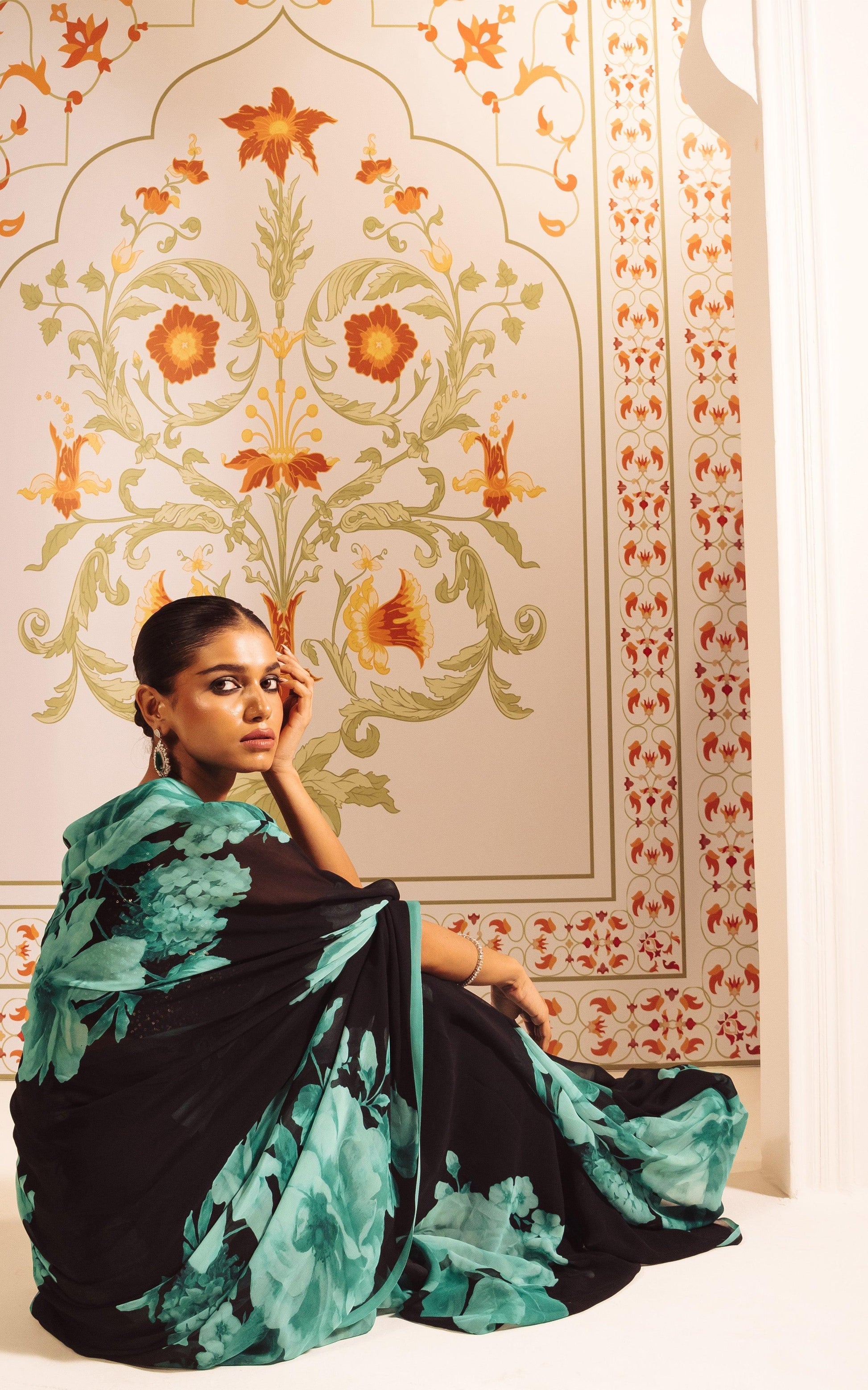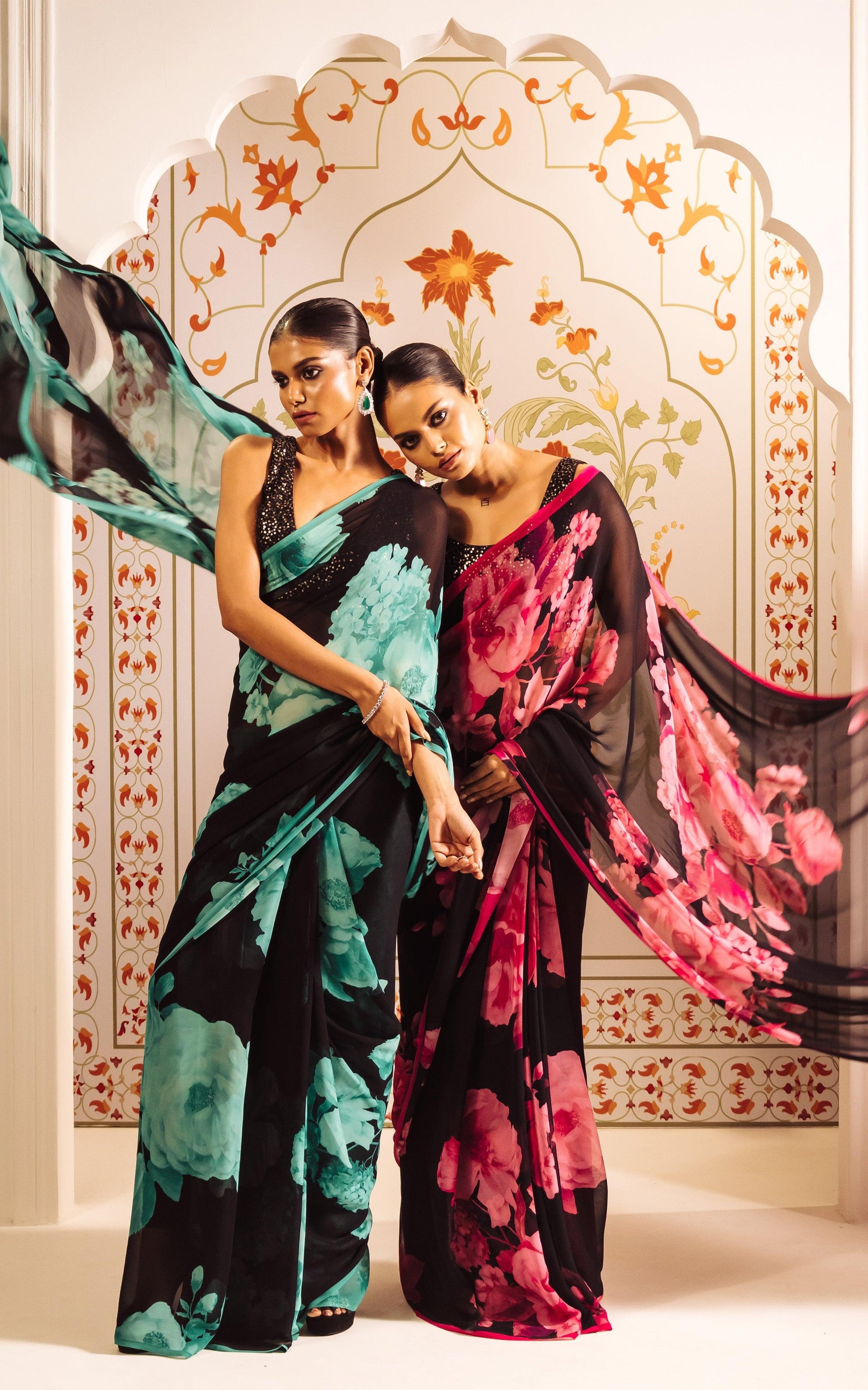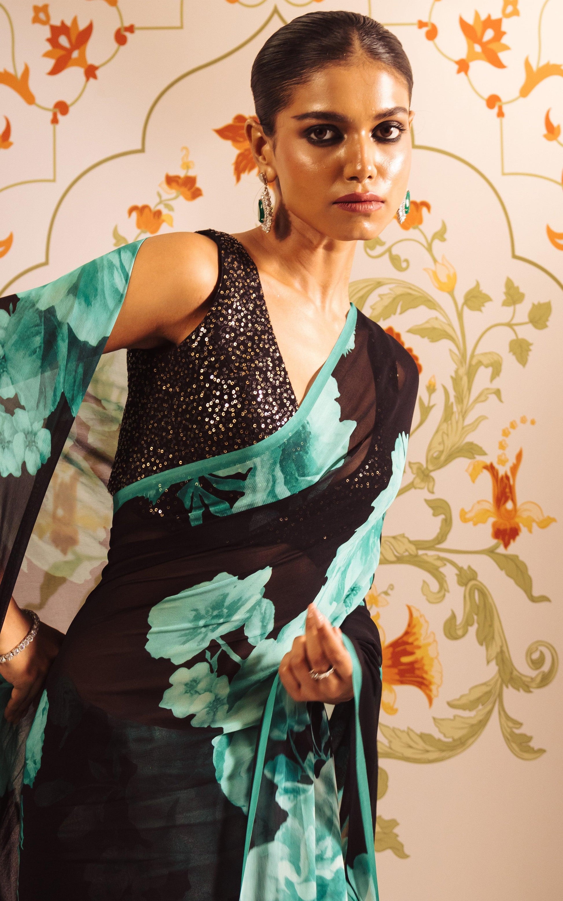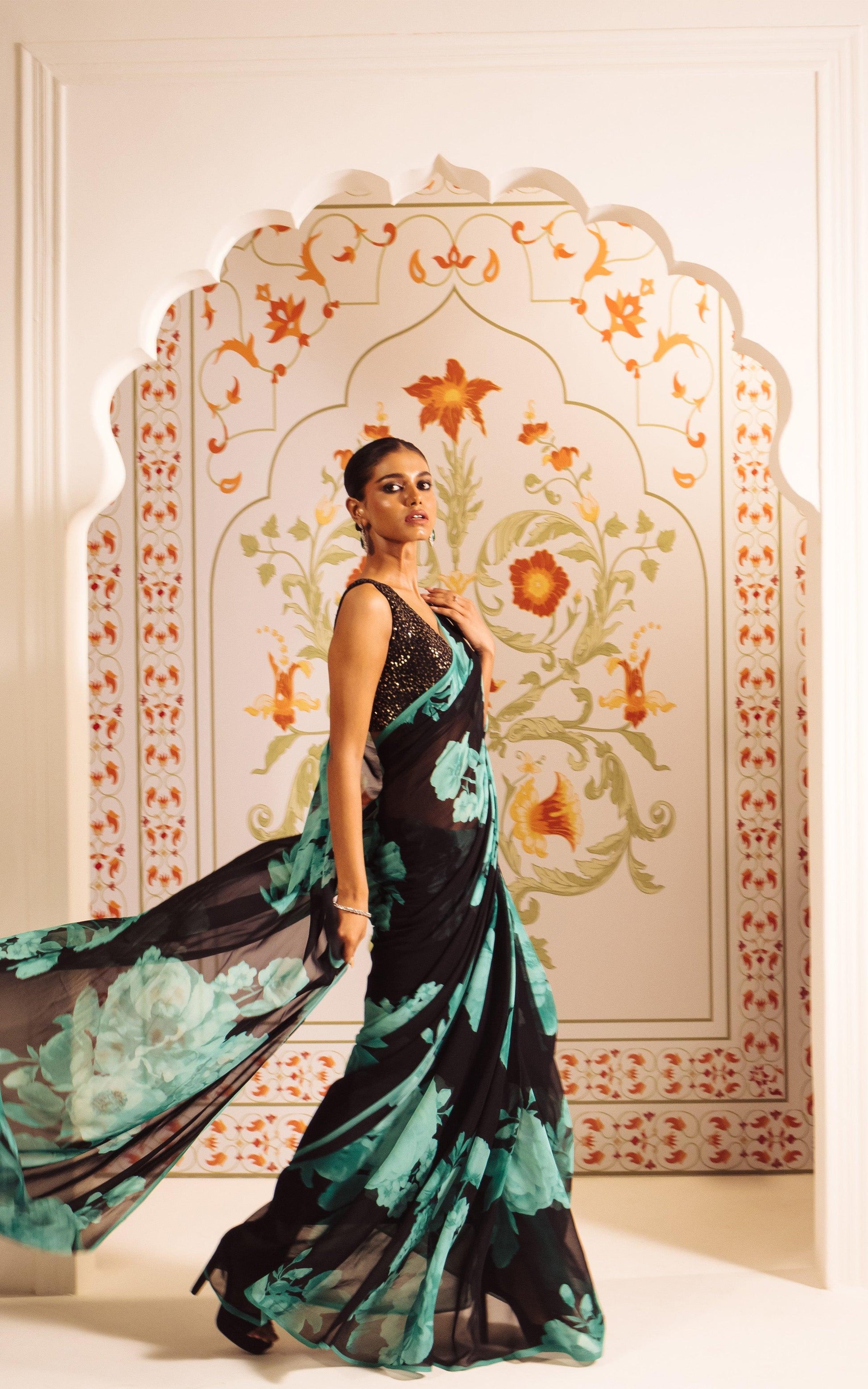 Make a striking style statement with this elegant Printed Satin Silk Saree, designed for women who appreciate modern luxury with timeless charm. Crafted from smooth satin silk, this saree features a rich black base beautifully enhanced with soft teal floral prints, creating a graceful contrast and a refined look.