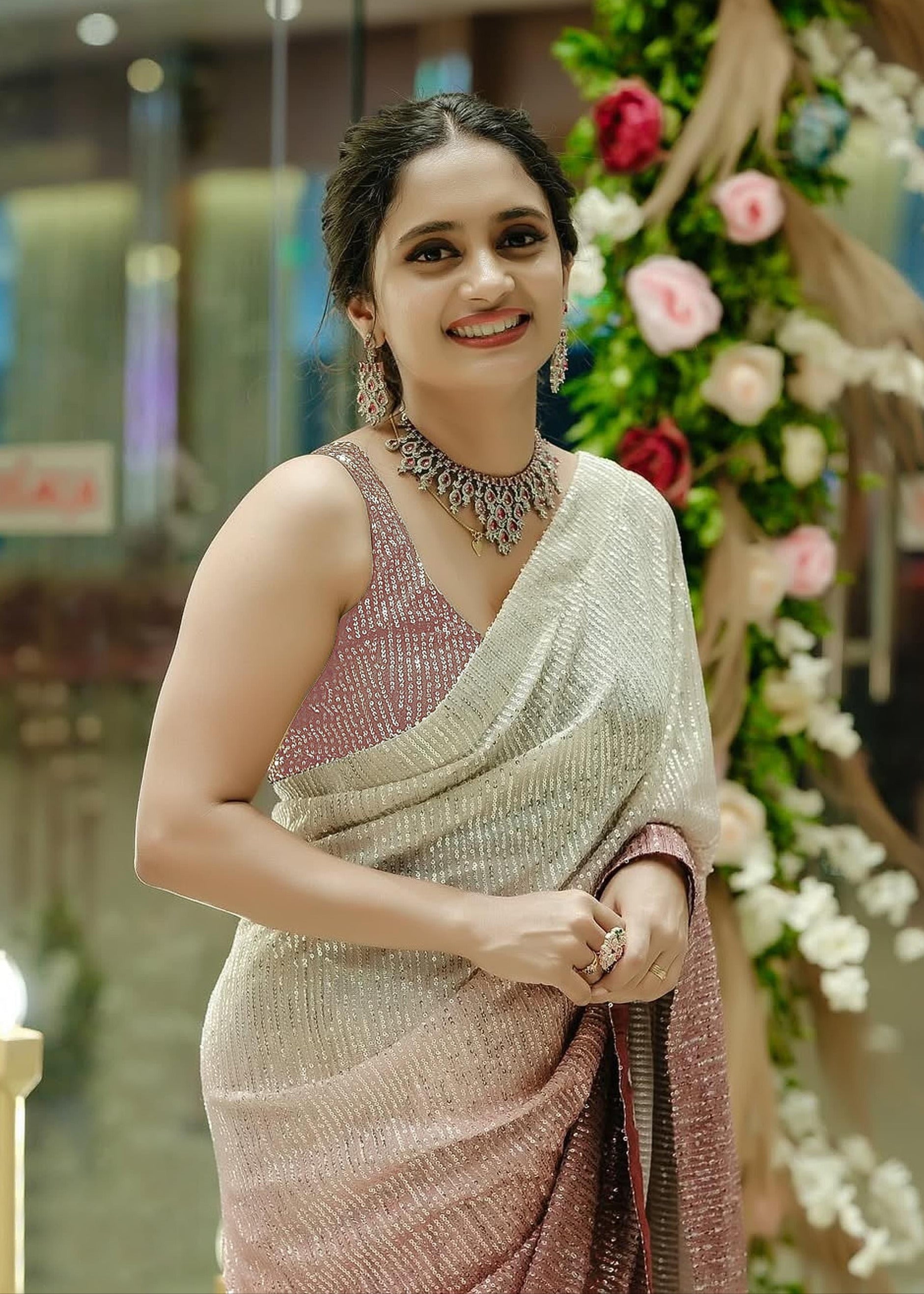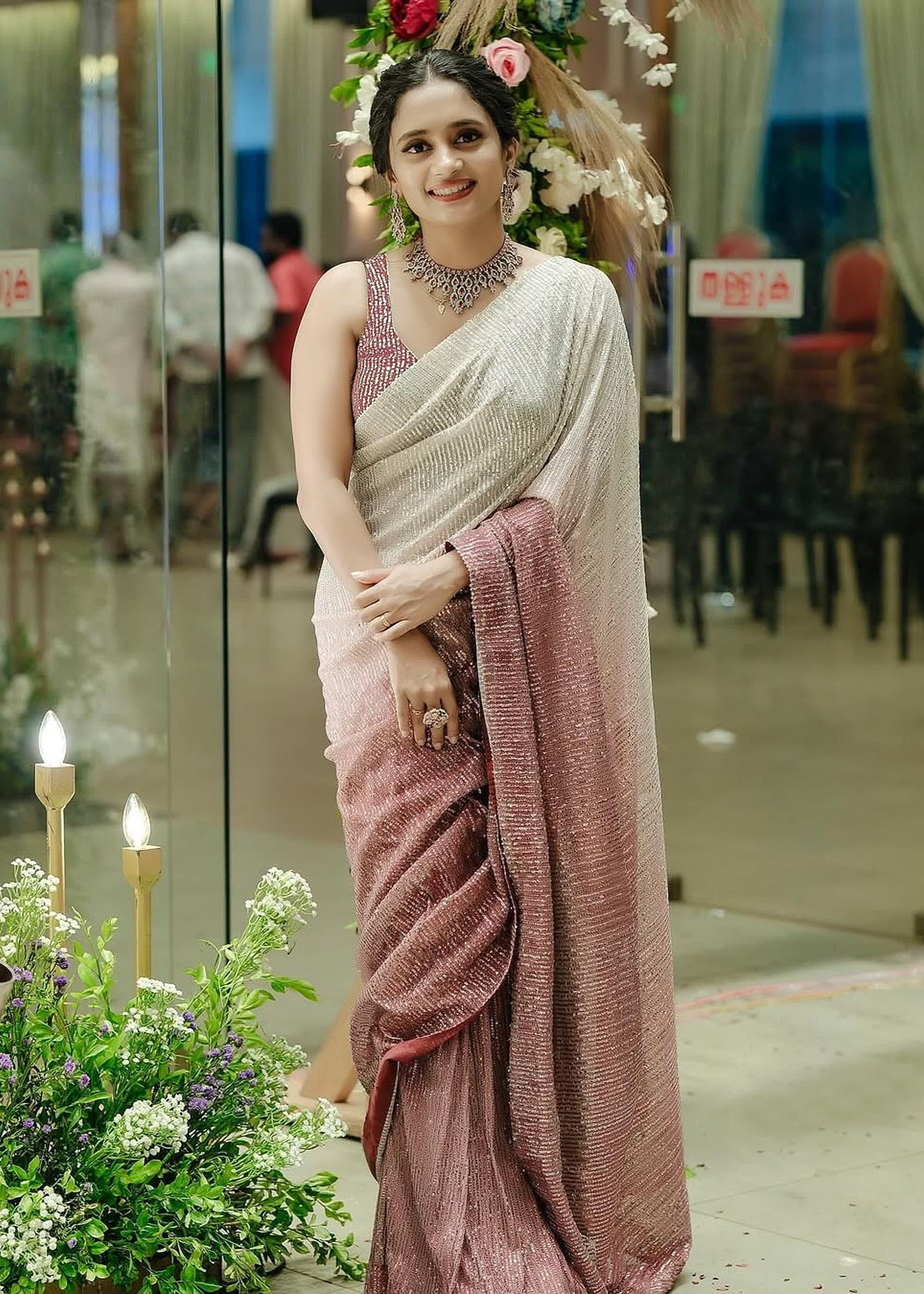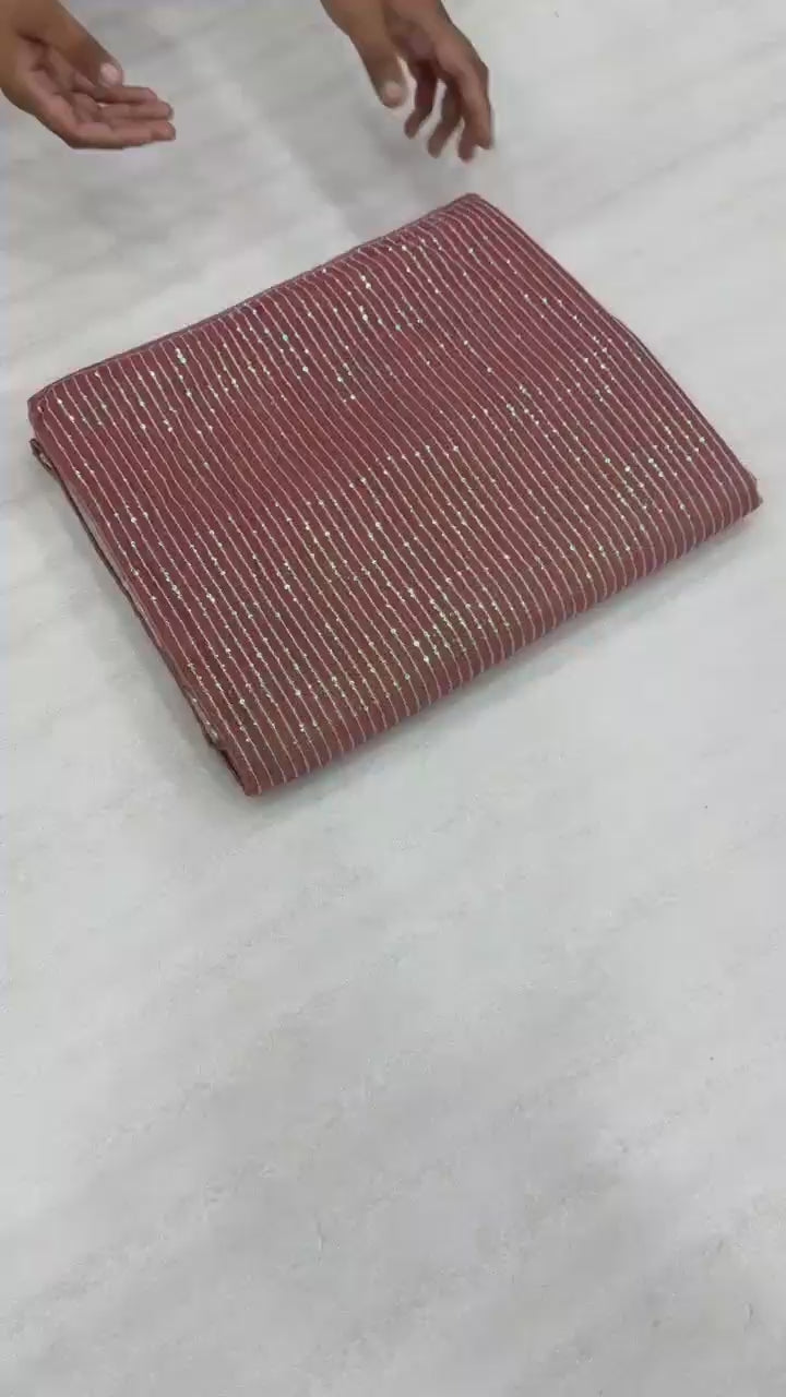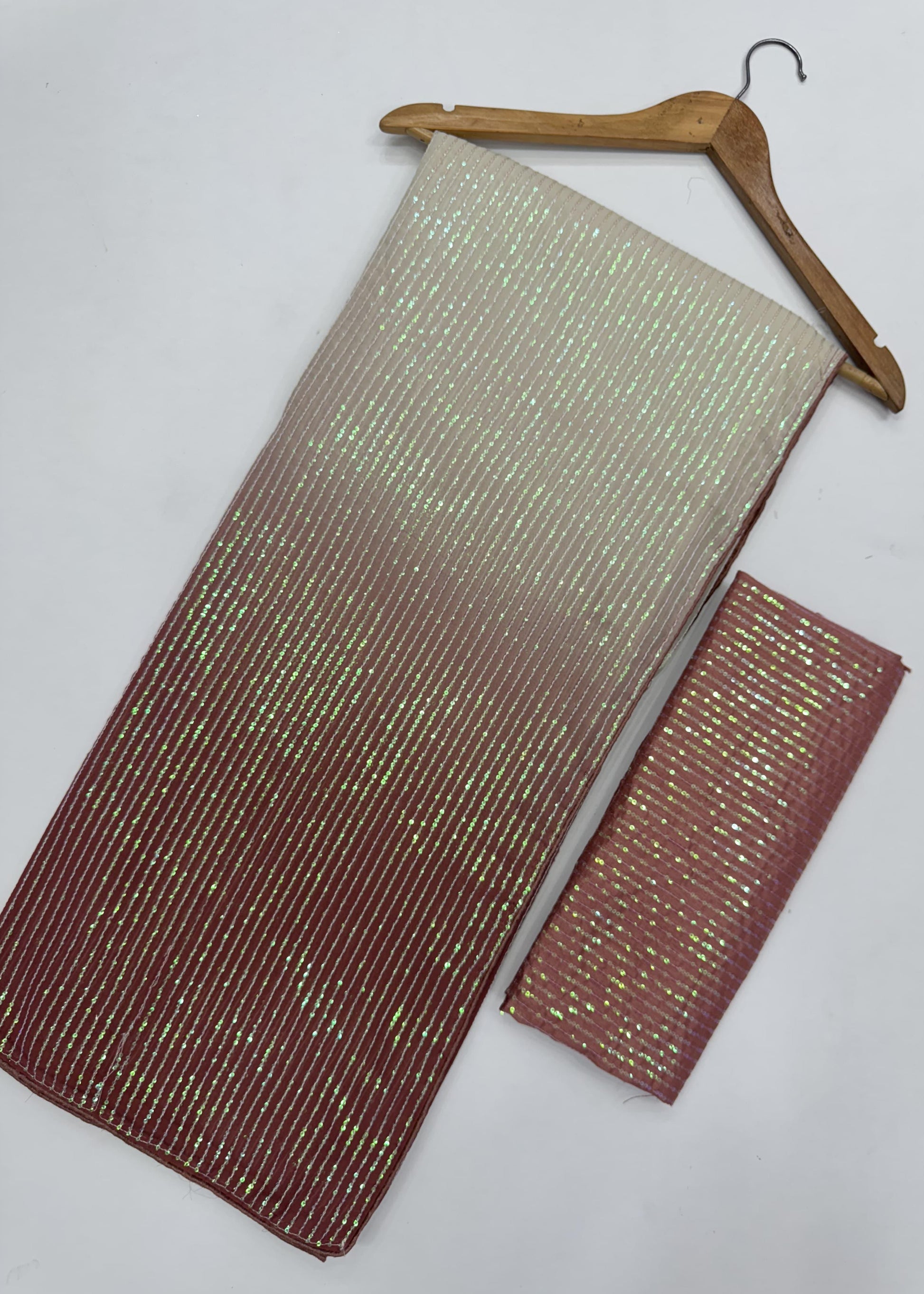Stunning Padding Georgette saree featuring all-over mill print and heavy 3MM rainbow sequin embroidery for a shimmering finish. Paired with a Banglori silk blouse adorned with matching 3MM sequin work for a complete festive look,