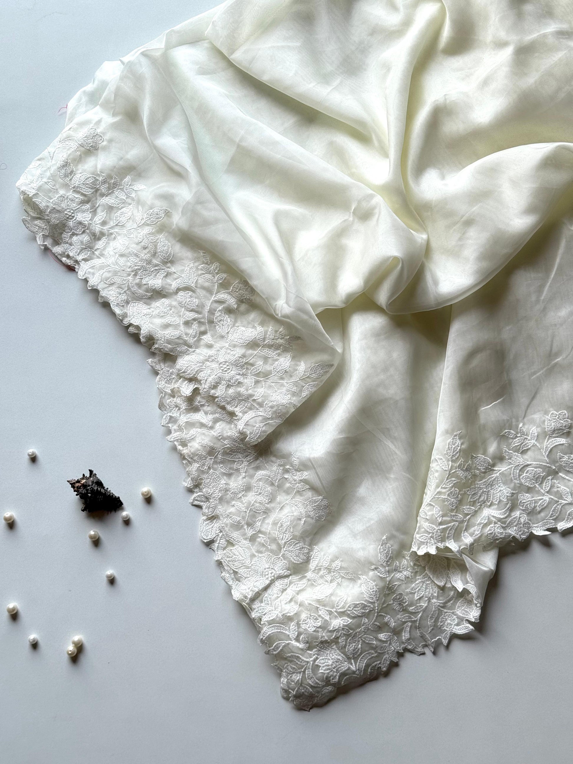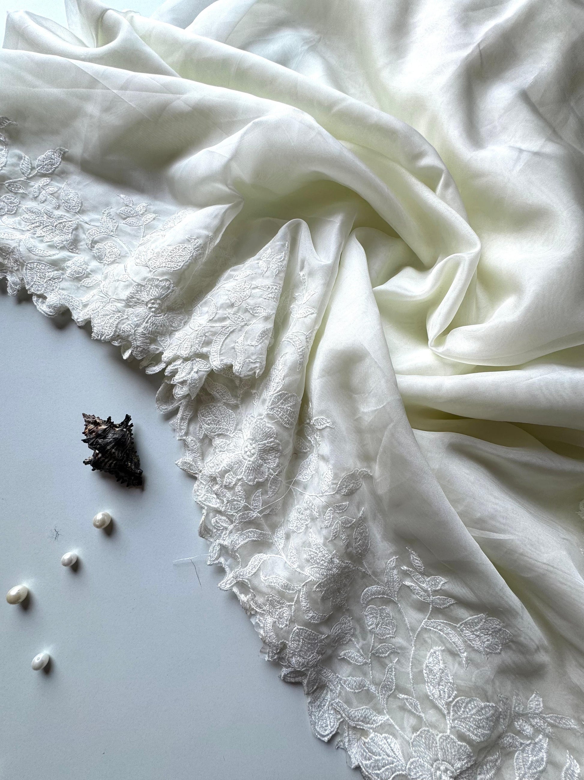 Elegant premium soft organza saree featuring intricate multi-thread scallop work, paired with a matching unstitched blouse. A luxurious designer piece crafted with pure fabric and detailed borders for a timeless look.