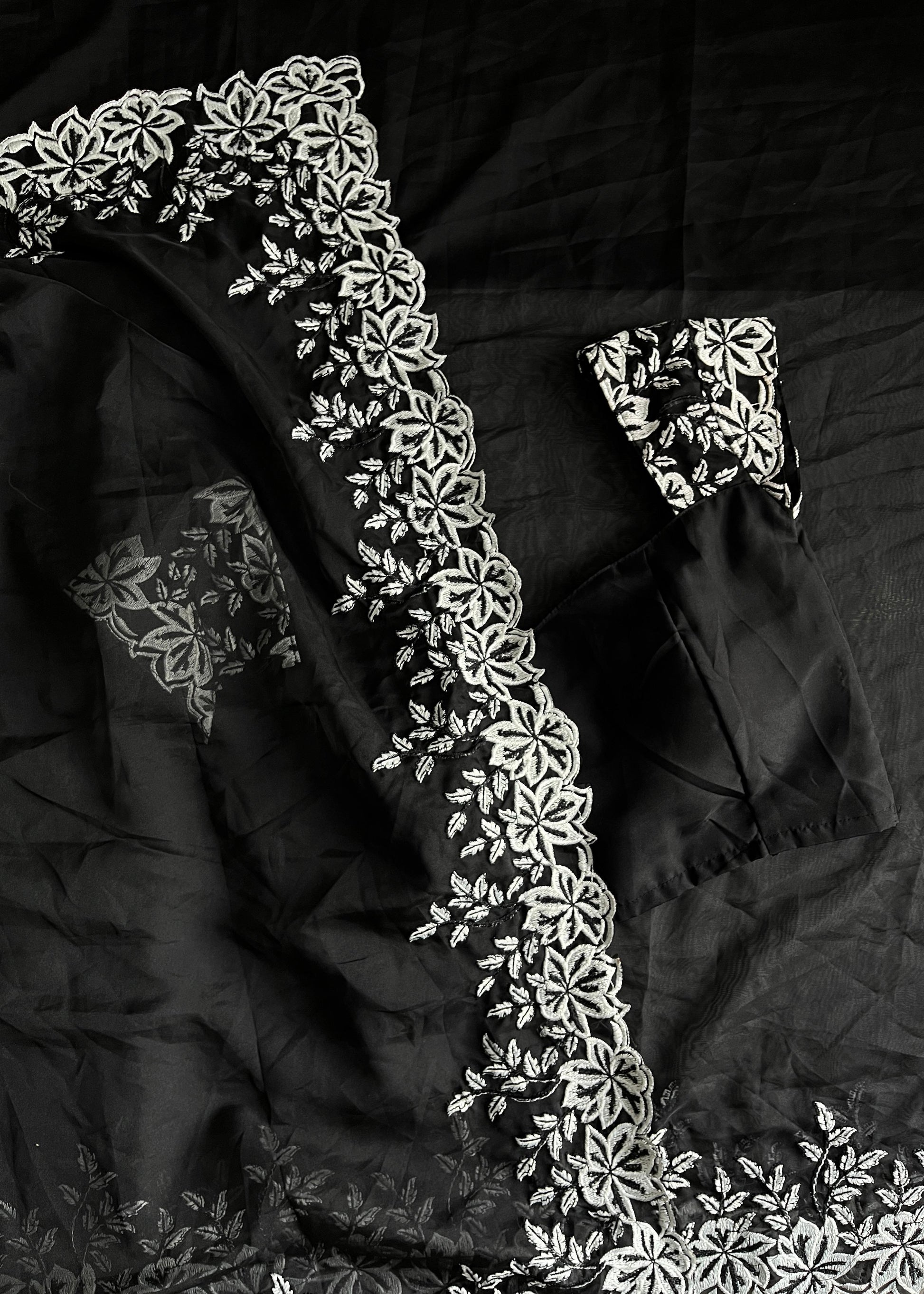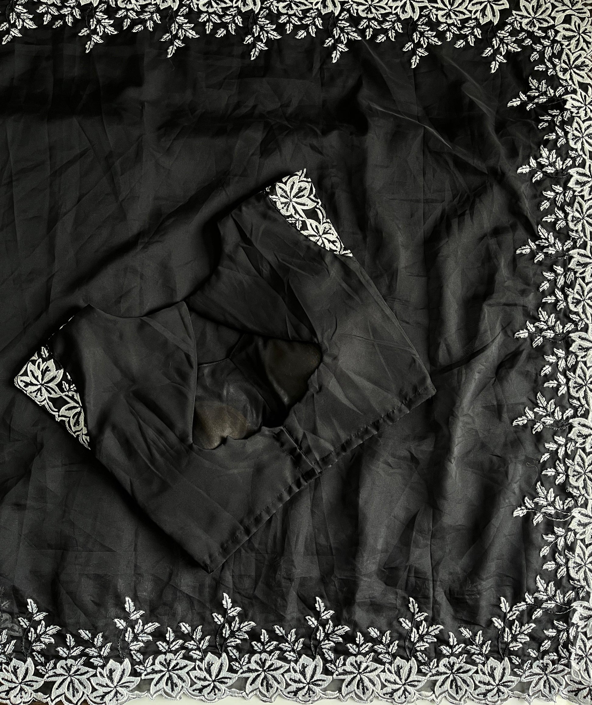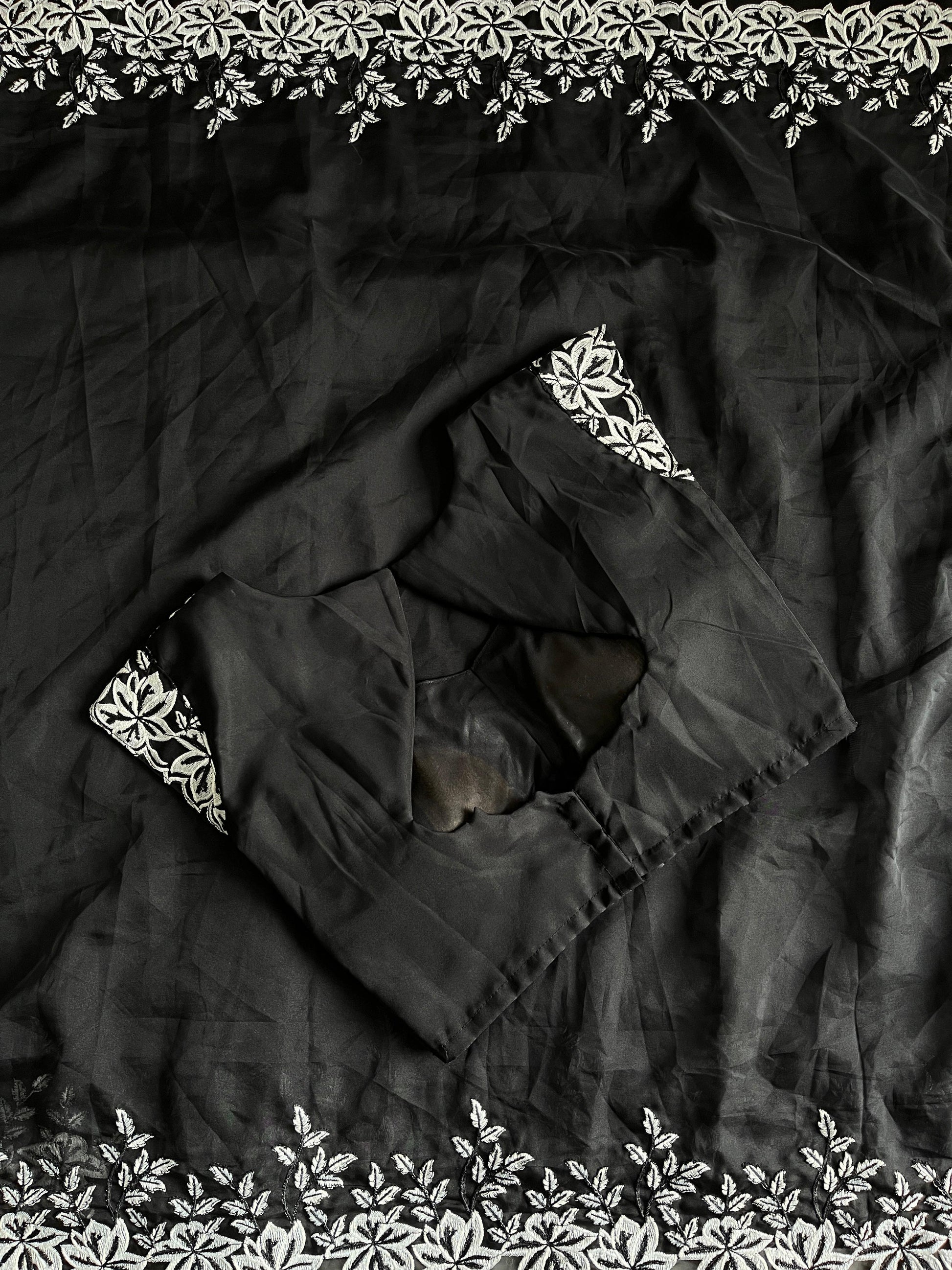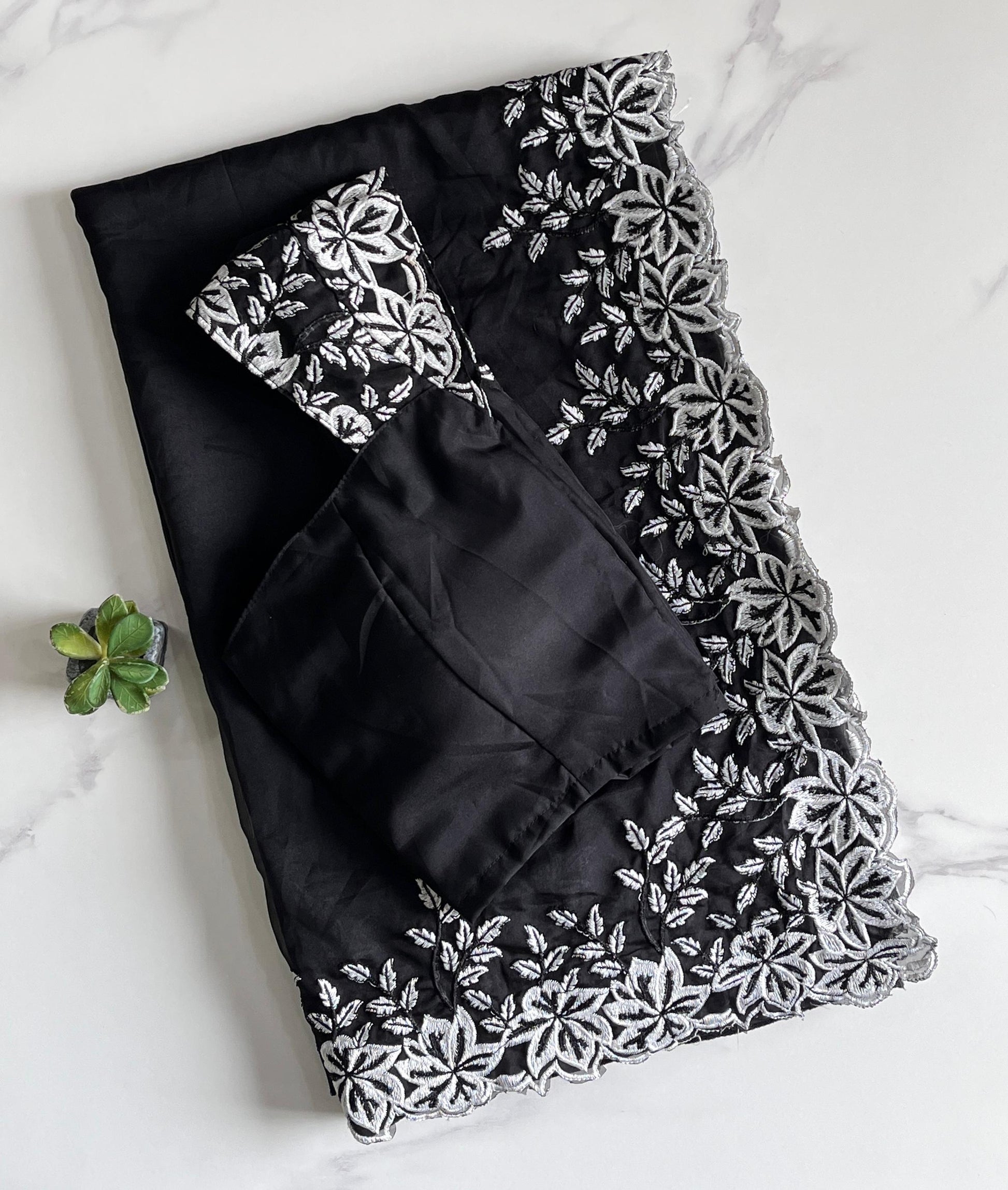 Elegant Premium Tabi Silk Saree adorned with delicate white thread work and scalloped detailing on both sides. Paired with a designer stitched blouse piece, tailored to your measurements and style preference.