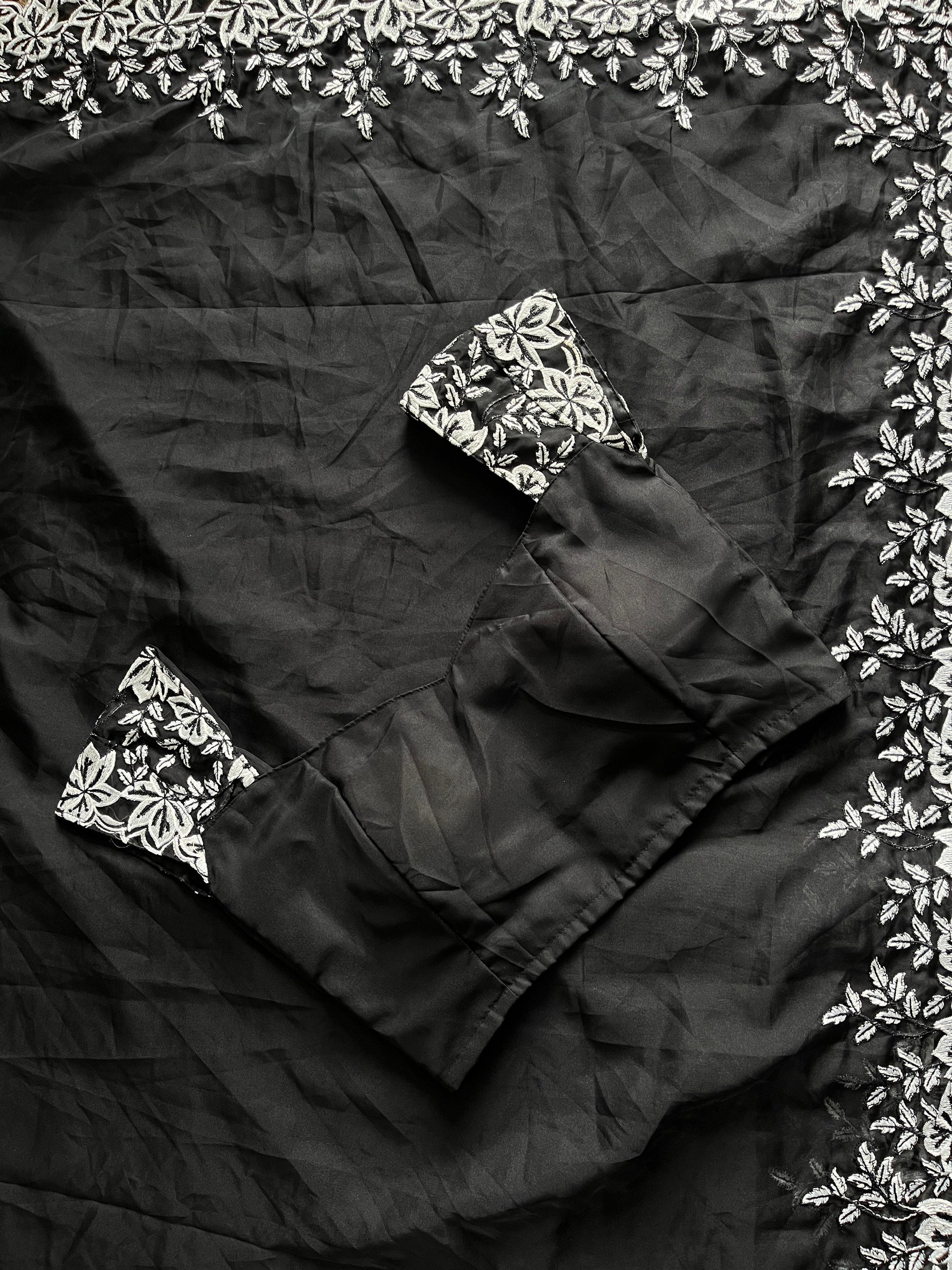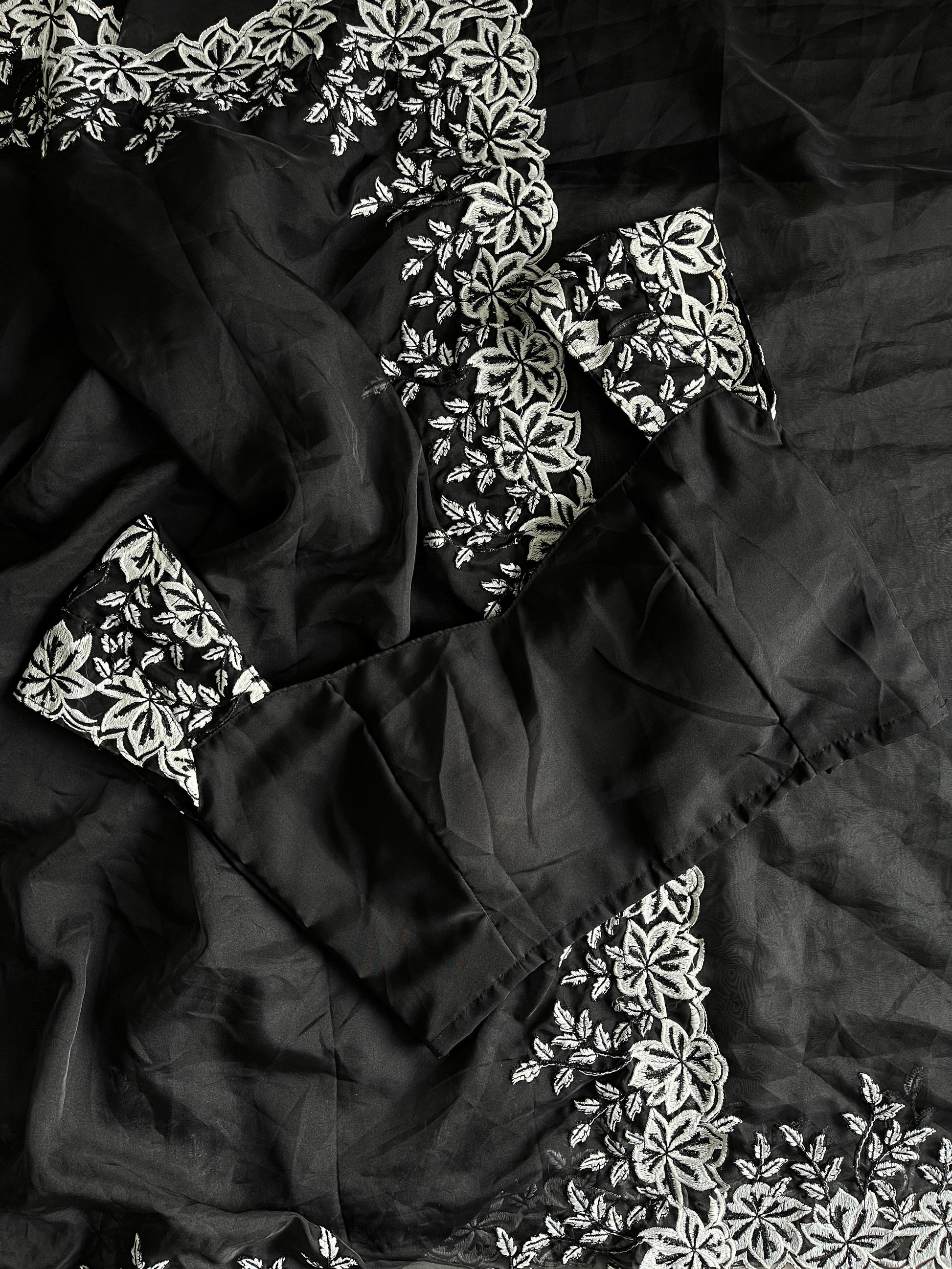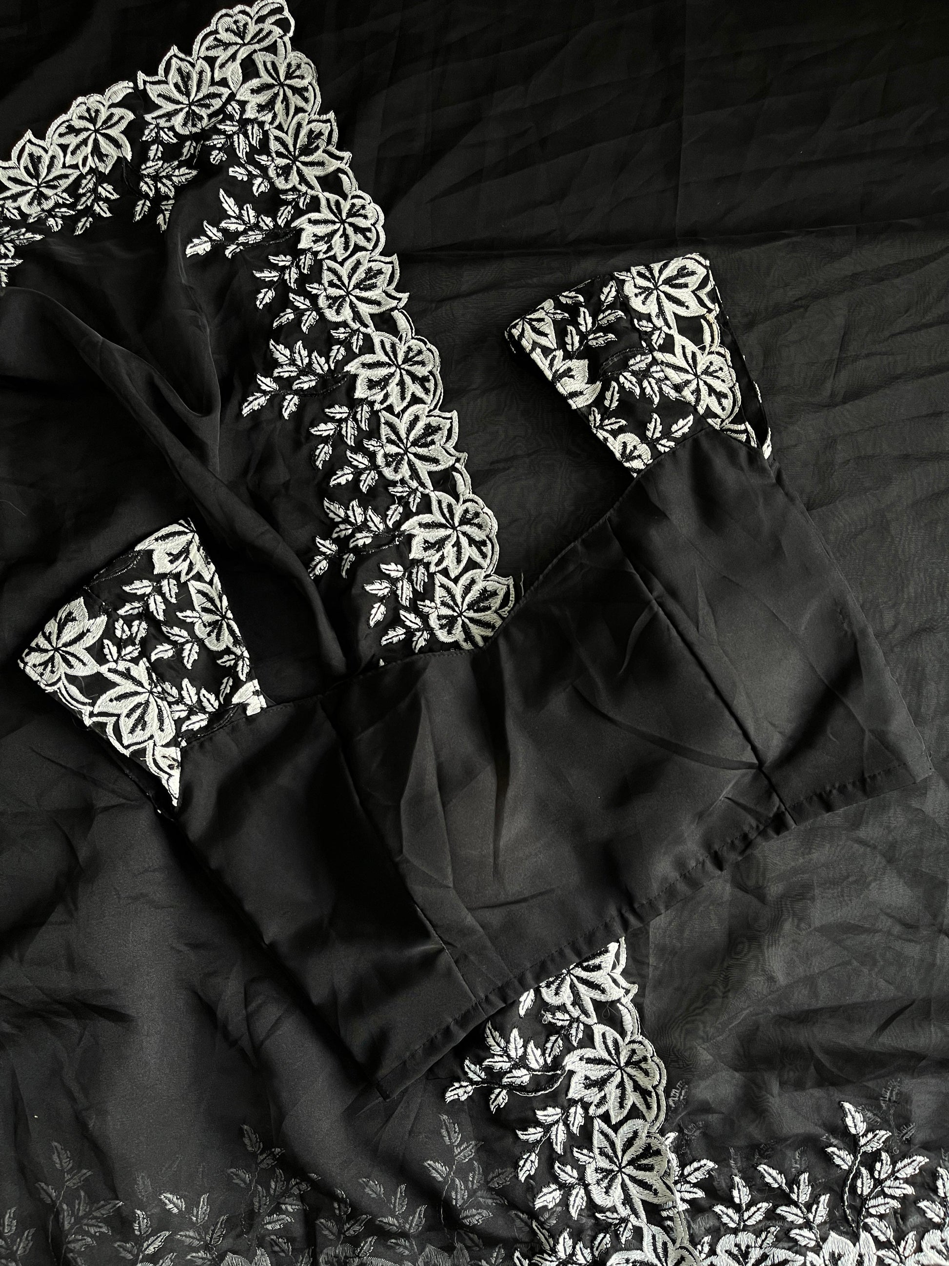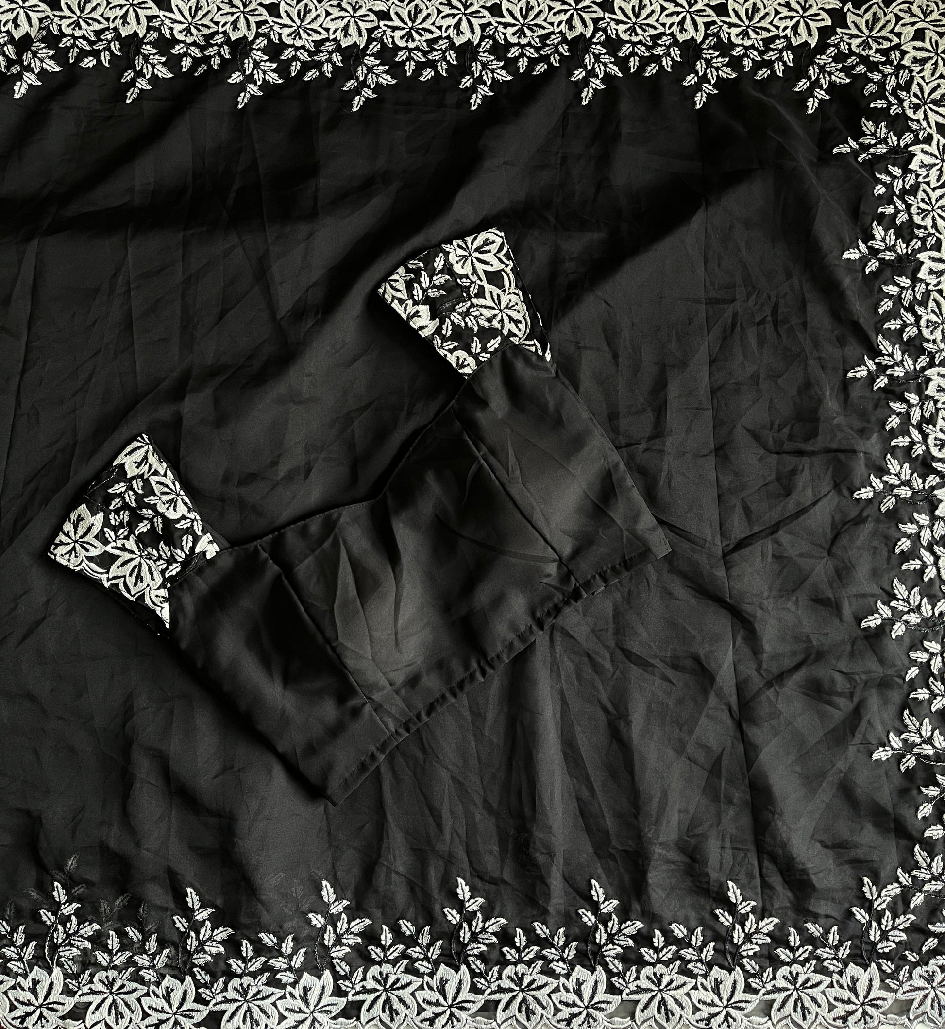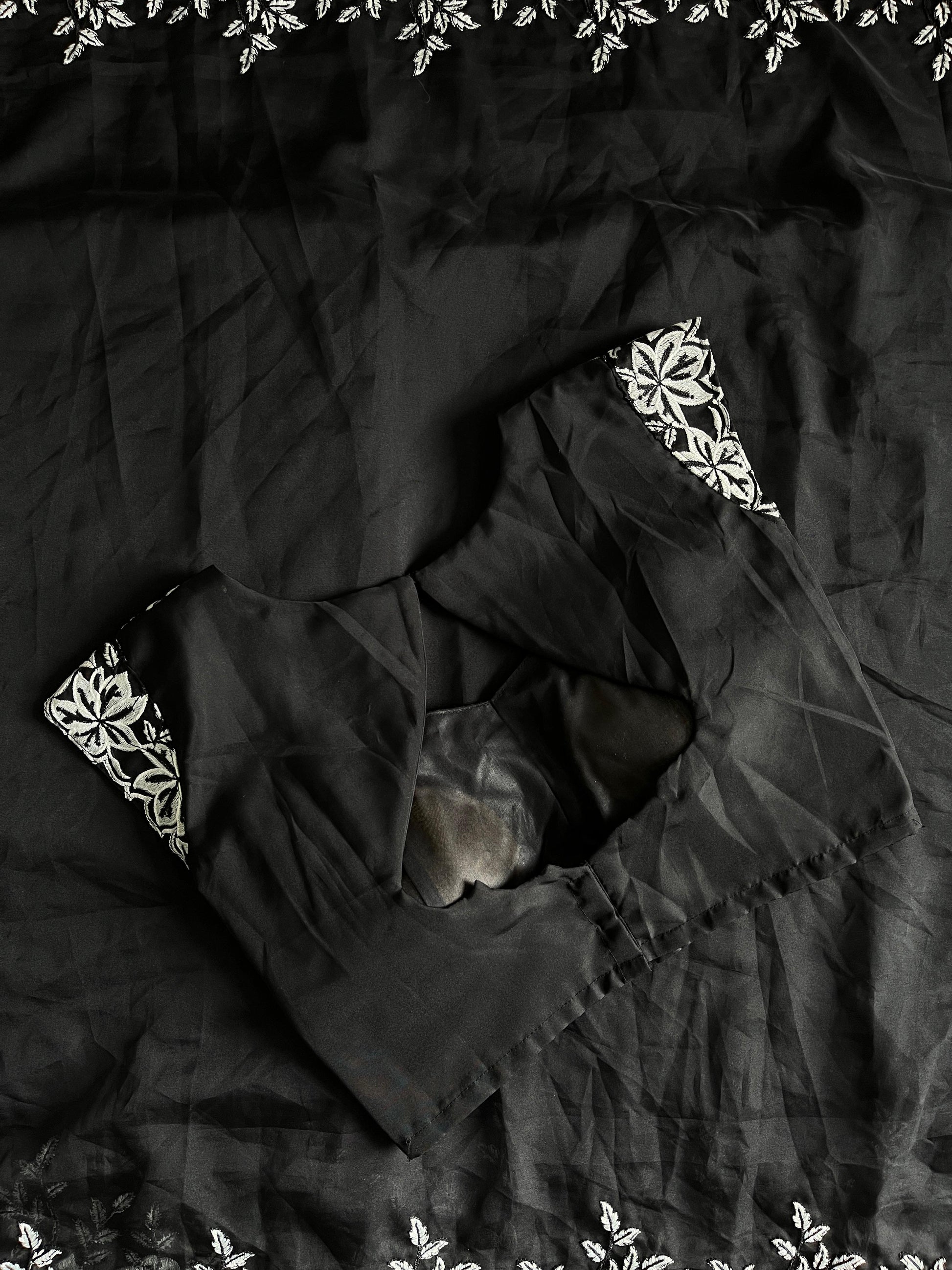 Elegant Premium Tabi Silk Saree adorned with delicate white thread work and scalloped detailing on both sides. Paired with a designer stitched blouse piece, tailored to your measurements and style preference.