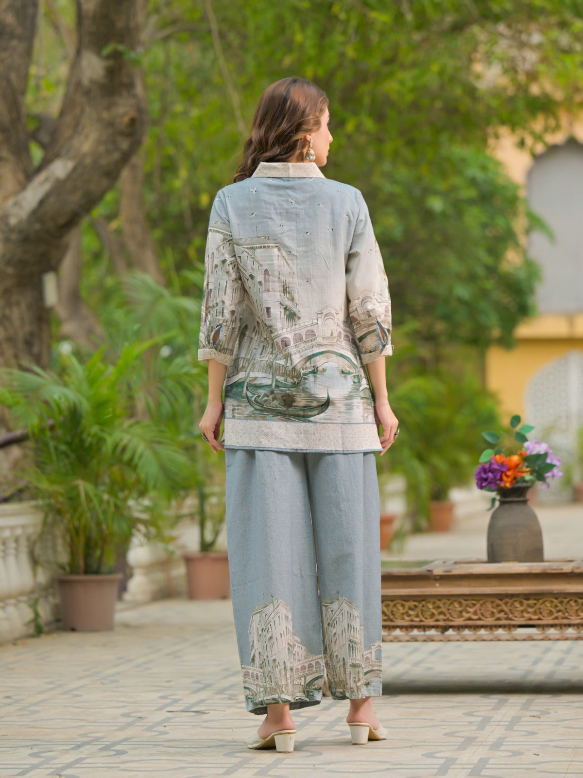 Made from pure cotton, this co-ord set features a stunning townscape print, blending artful charm with everyday comfort,