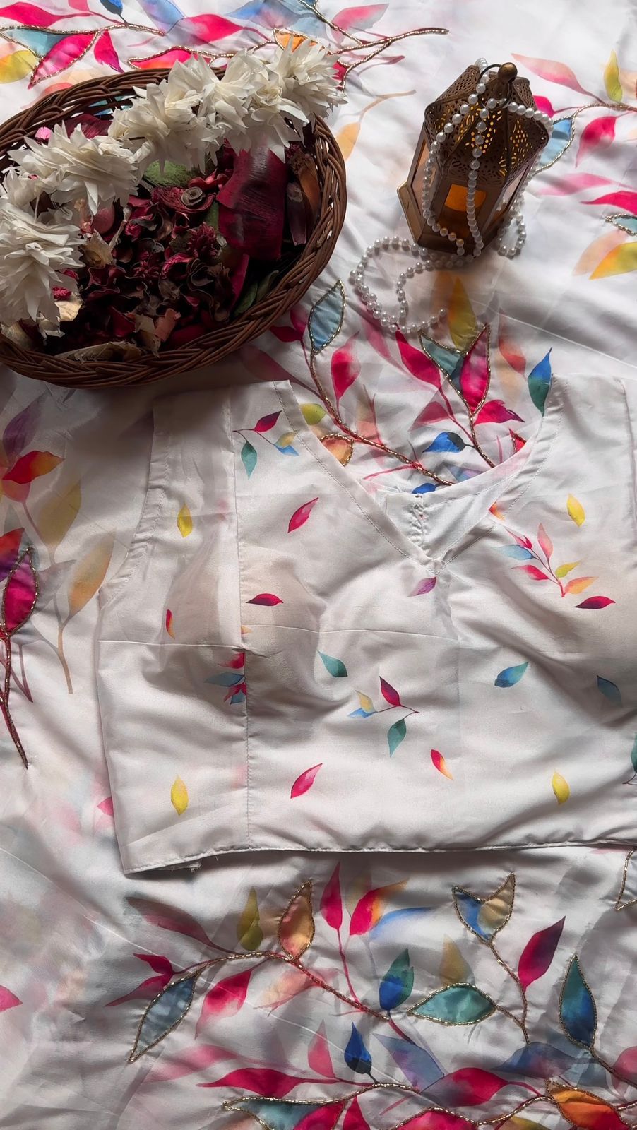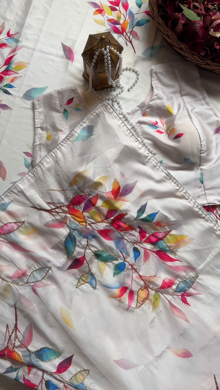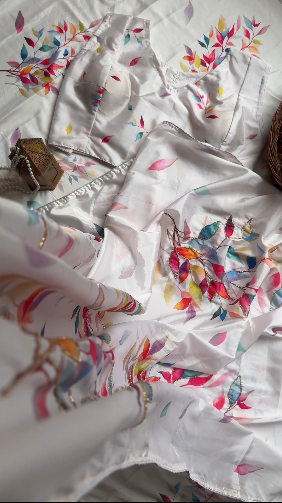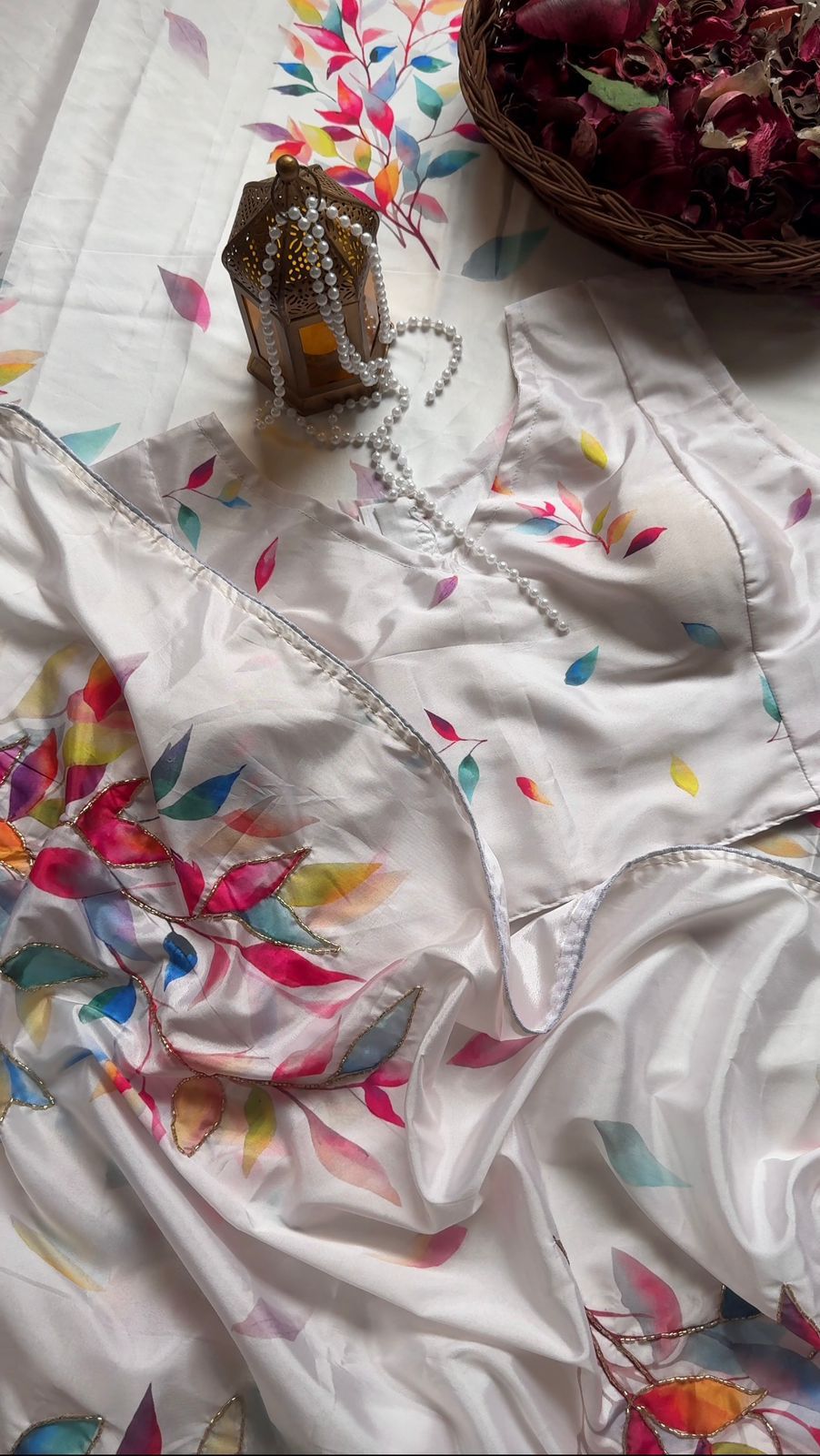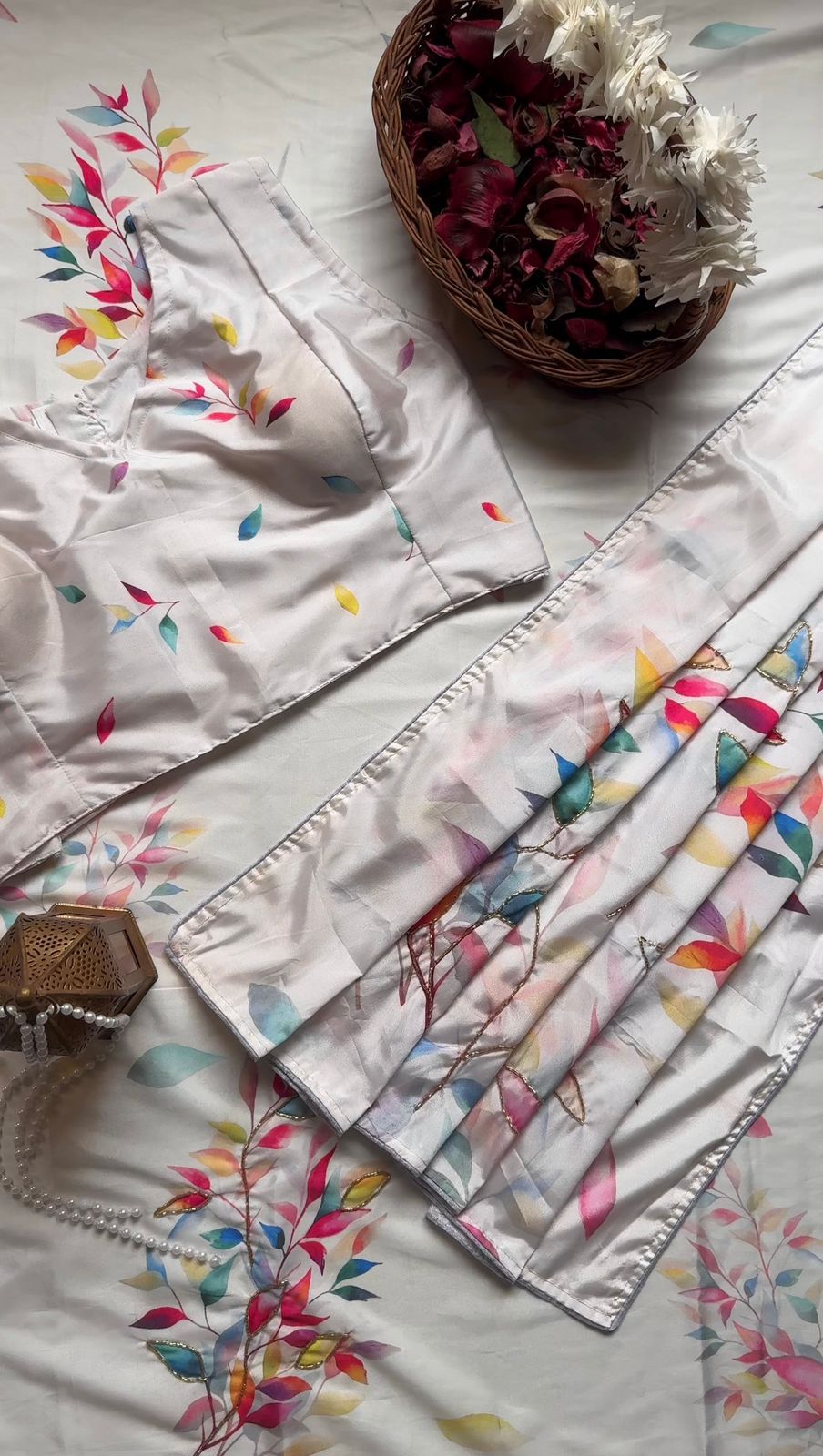 Elegant Pure Crepe Satin Silk Saree with digital print, adorned with delicate moti bits and cutdana handwork. Paired with a matching unstitched pure crepe satin silk blouse fabric.