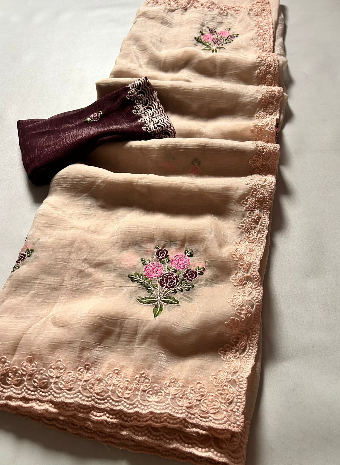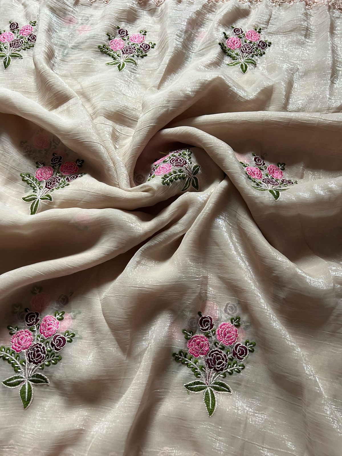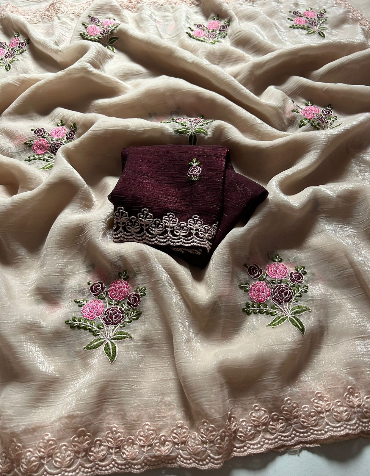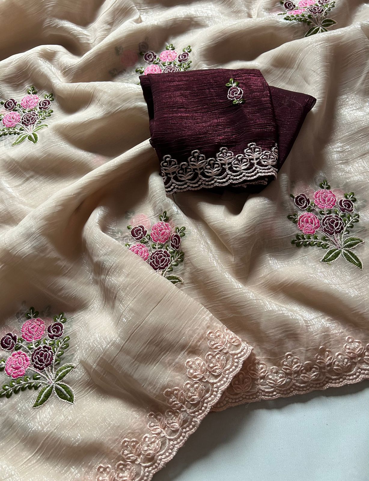 This elegant Pure Crush Silk Saree features intricate all-over embroidery and cut work for a luxurious touch. The contrast embroidered blouse with delicate butti designs completes the look, making it perfect for weddings, festivals, and special occasions,
