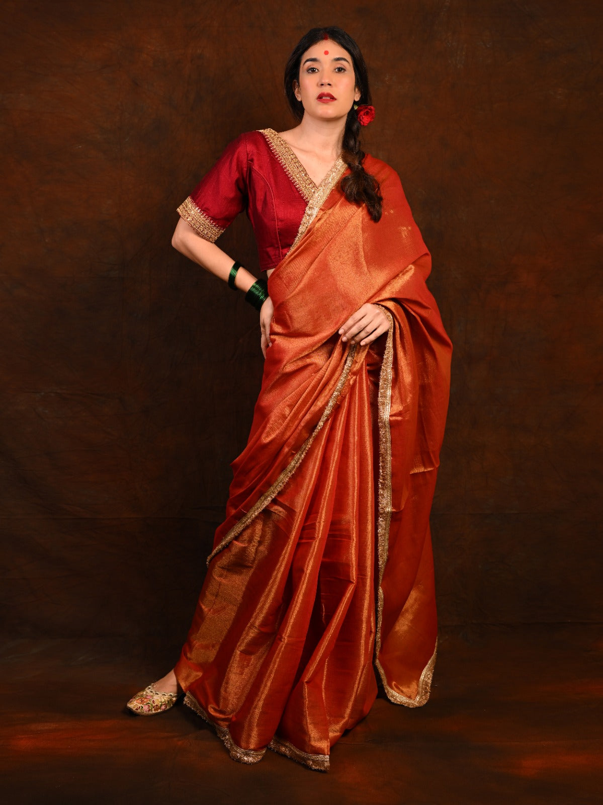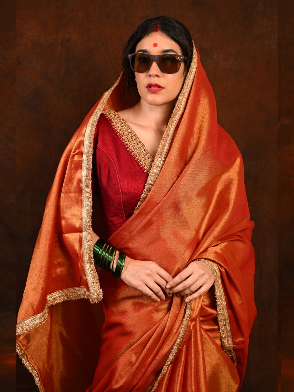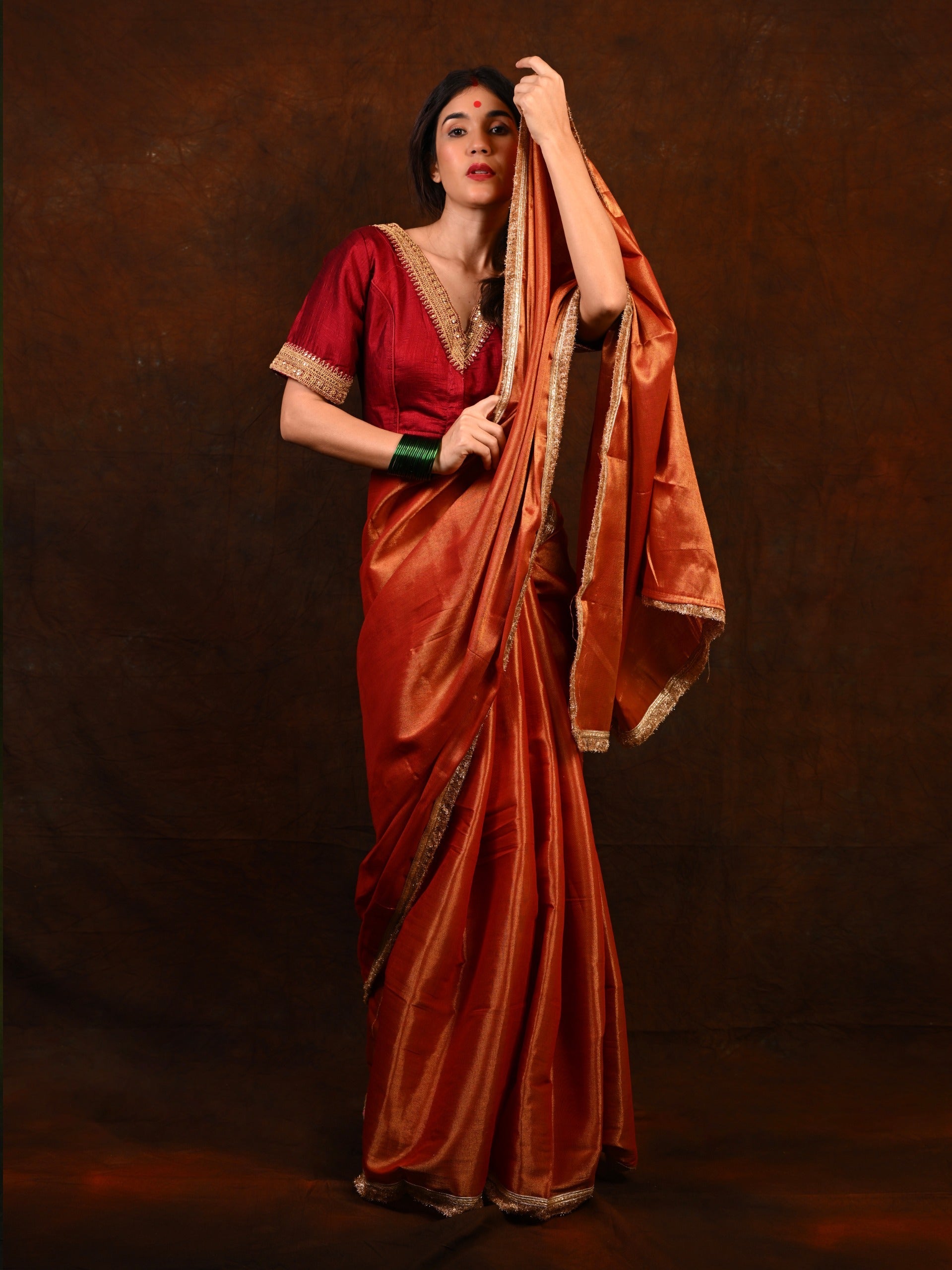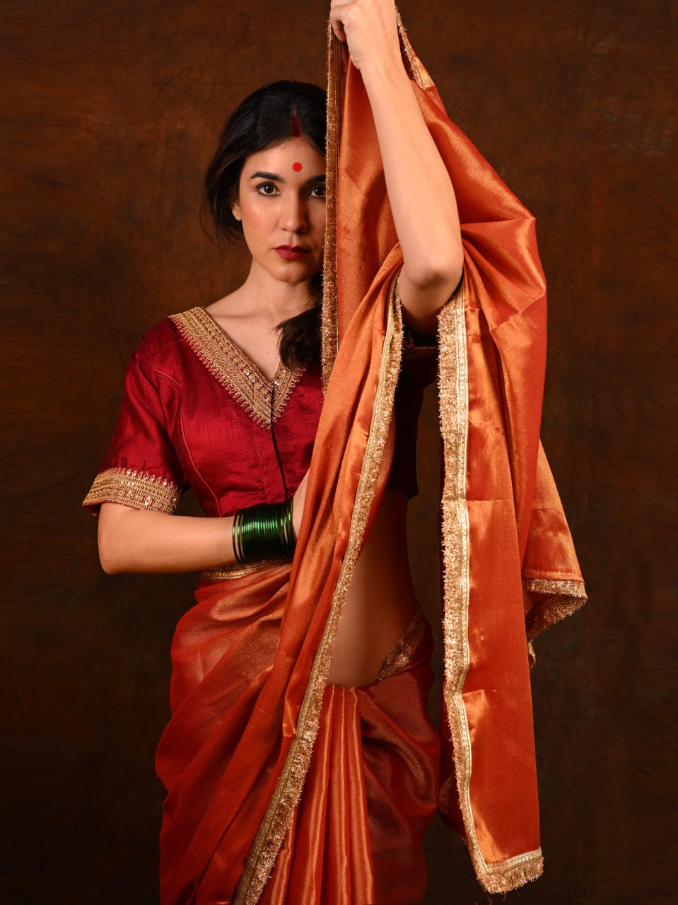 Paired with a silk blouse, this outfit exudes sophistication and opulence. The blouse features delicate embroidered work, adding a touch of artistic detail to your ensemble. The carefully designed embroidery complements the saree's rich tones, giving it an even more luxurious appeal.
