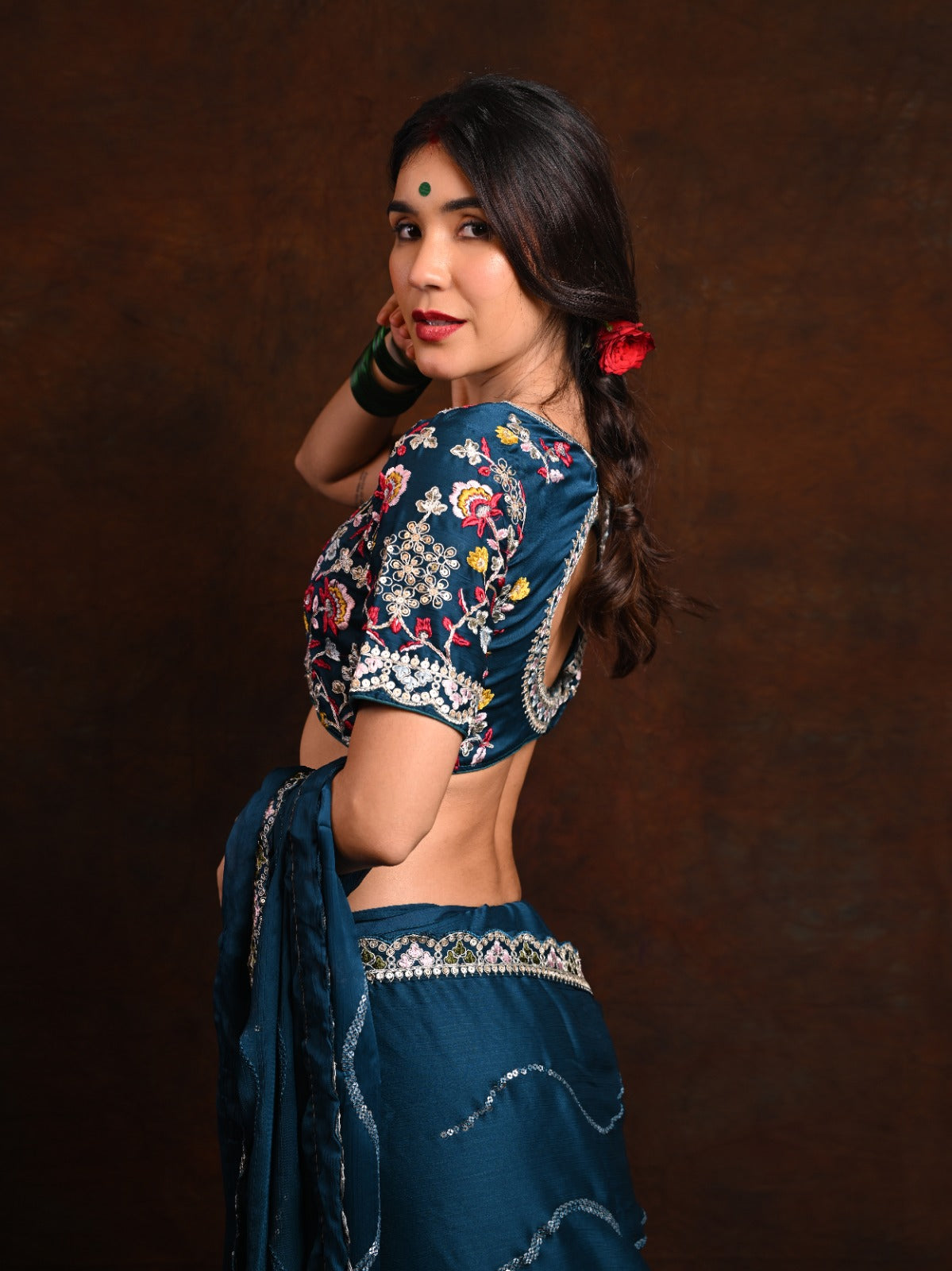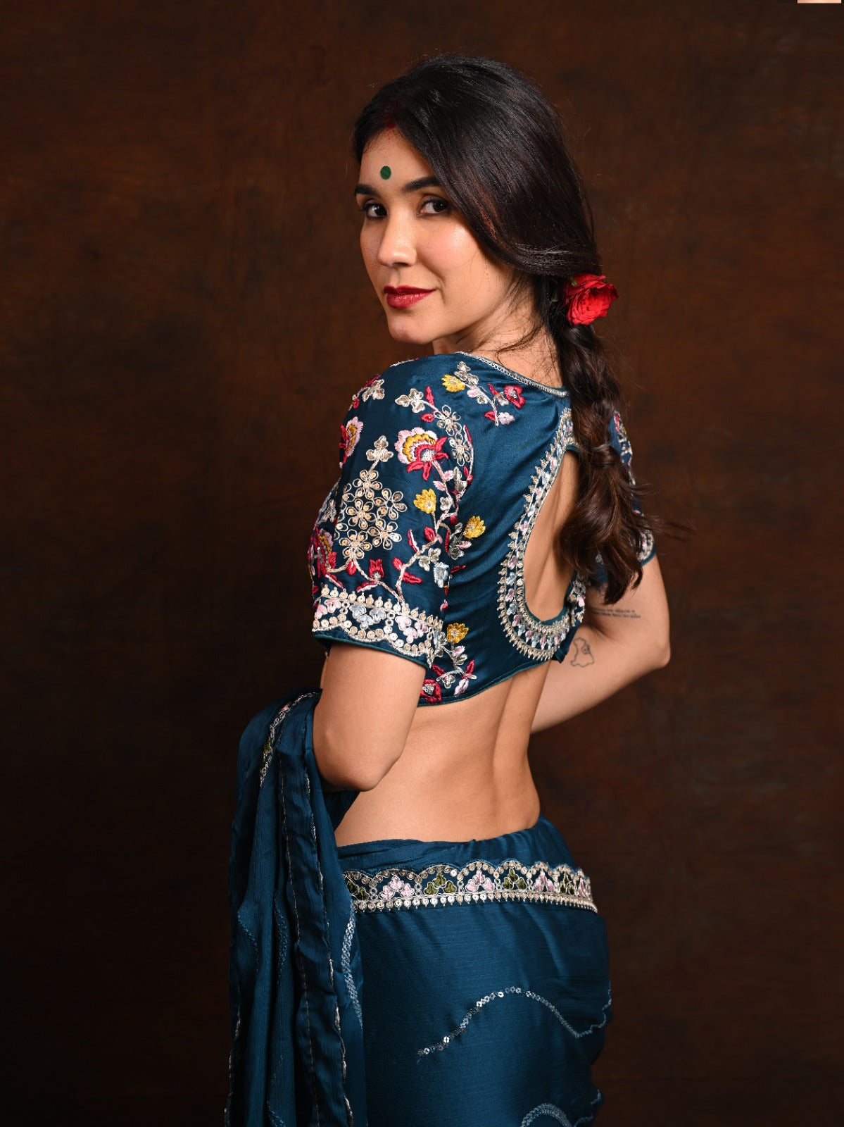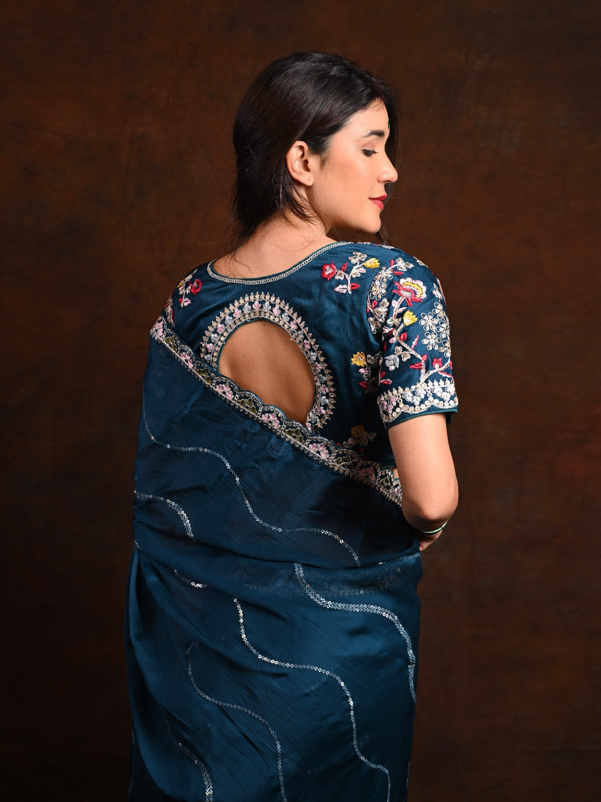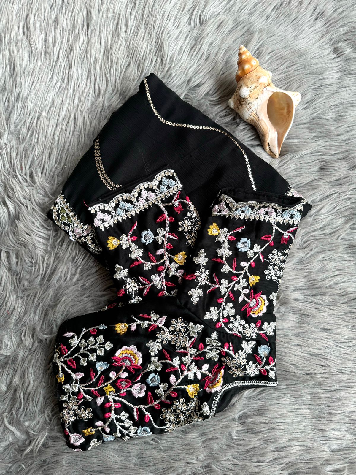 This stunning blouse is made from luxurious pure satin georgette fabric, offering a smooth and soft texture that drapes beautifully. The highlight of this piece is its exquisite multi-color six-needle sequence coding work, which adds a sophisticated and vibrant touch to the design. The intricate sequence work is carefully crafted, creating a stunning visual effect that makes this blouse perfect for festive occasions or elegant events.