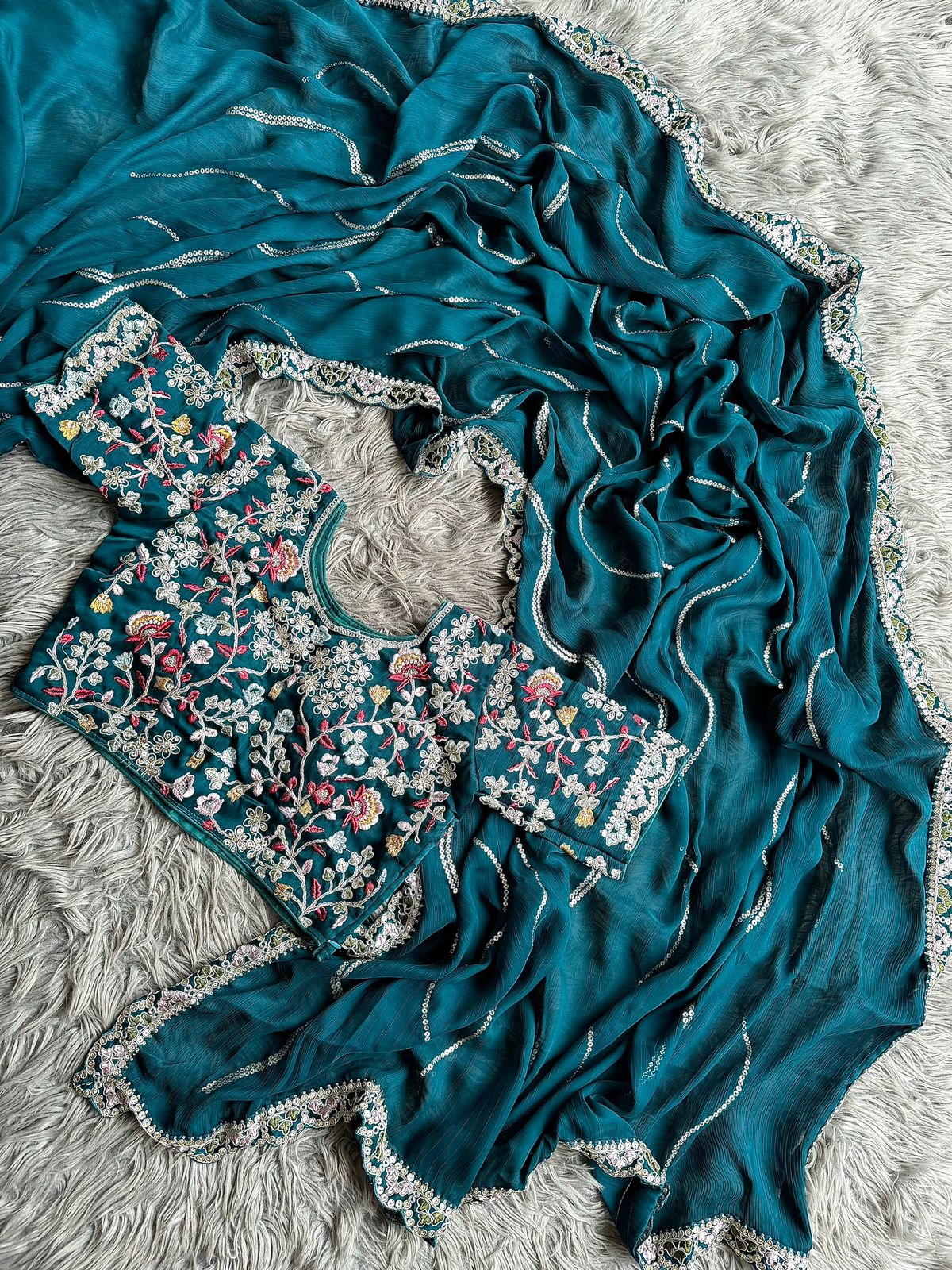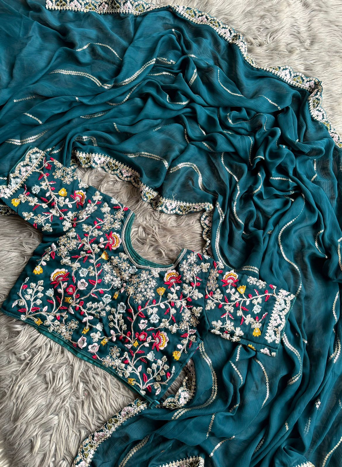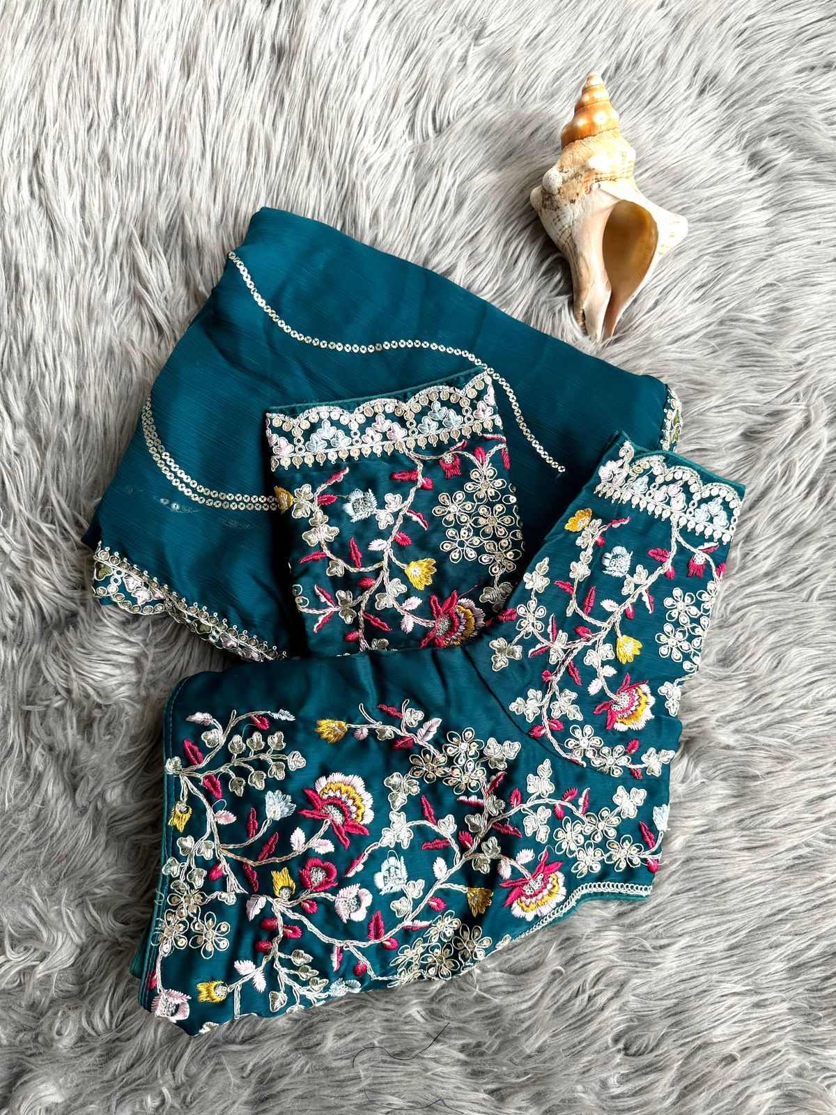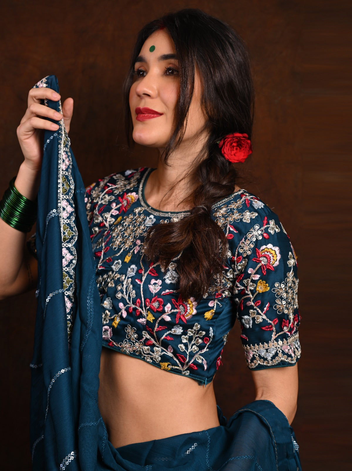 - Blouse Fabric : Pure Satin Georrgte with Multi Color 6 Niddle Sequnce Codding Work (UNSTICHED)