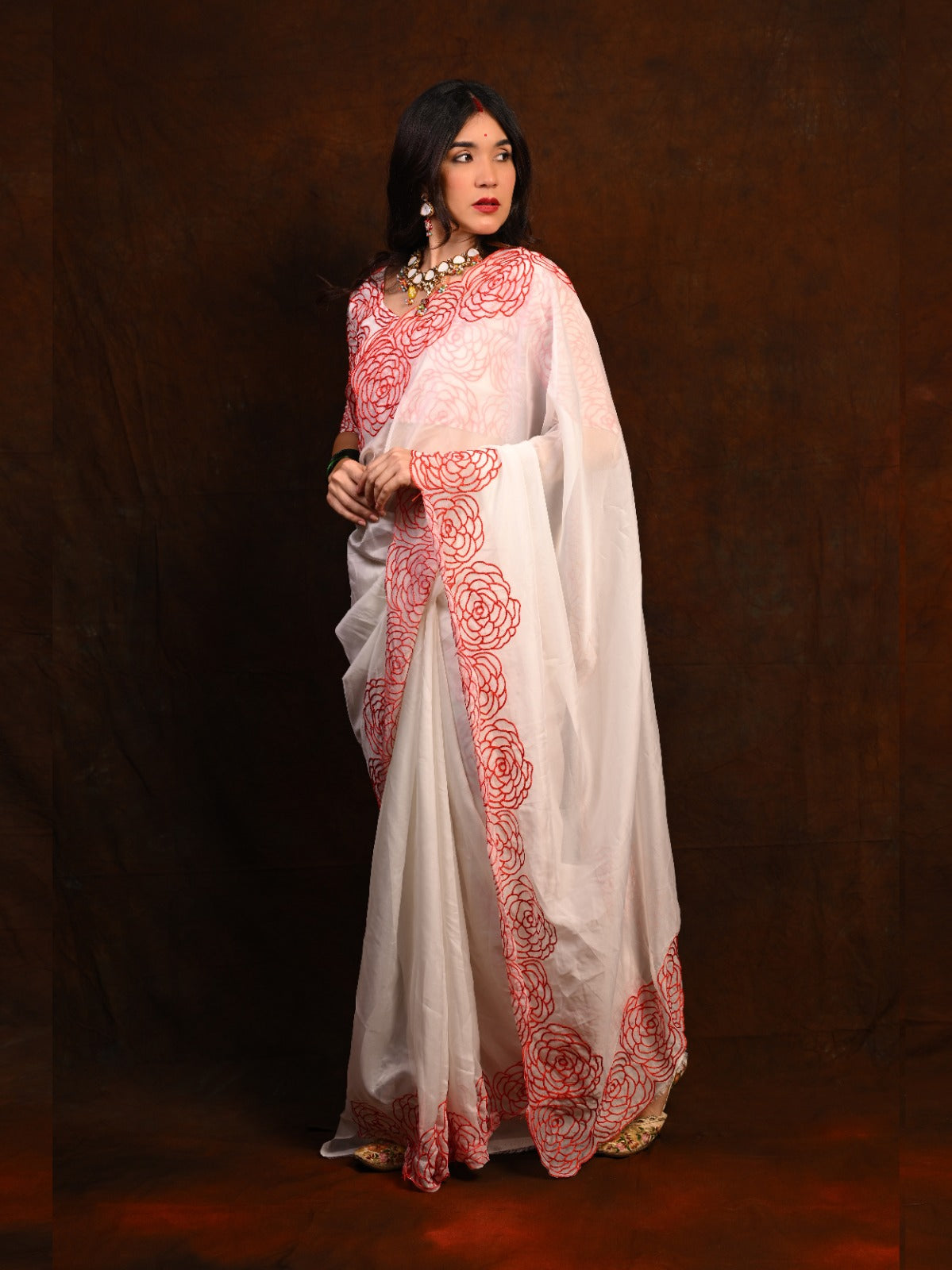 Pure Soft Organza Saree with Red Floral Thread Work D1152