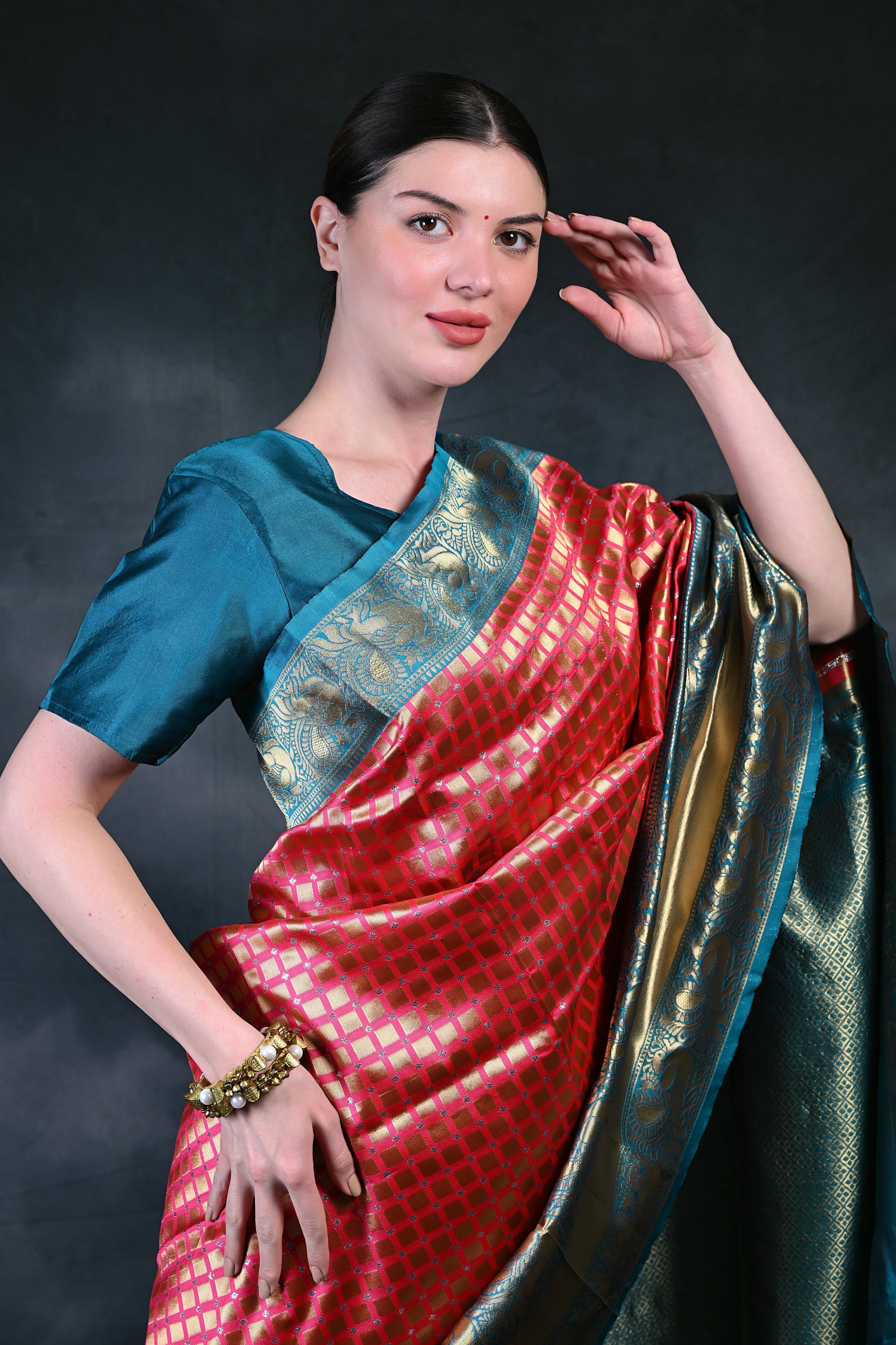 Ready to ship, this saree is the epitome of traditional craftsmanship and modern elegance, perfect for any celebratory occasion.