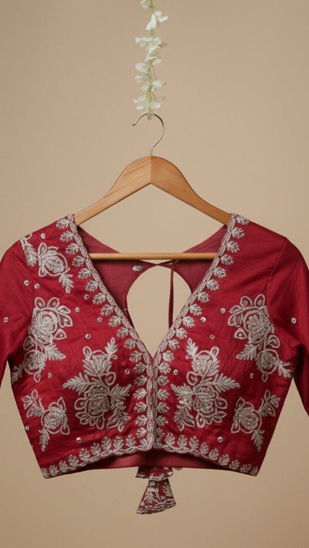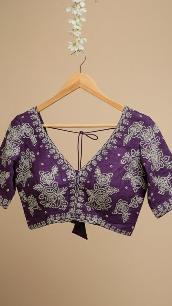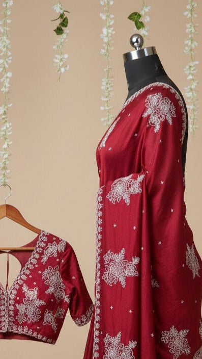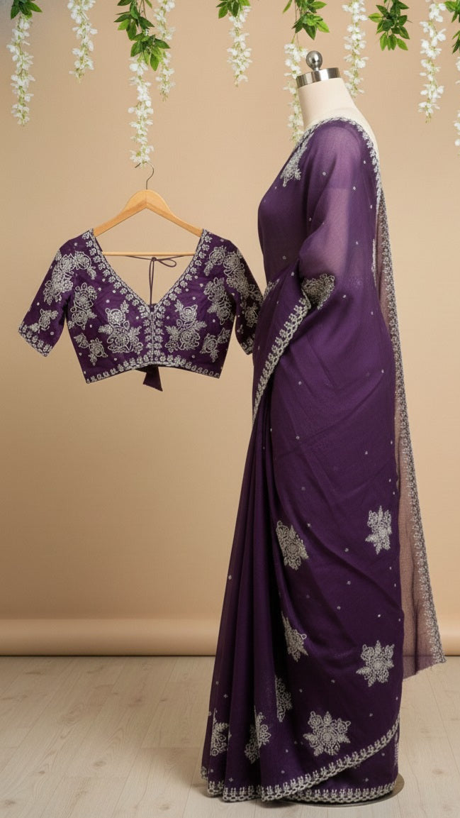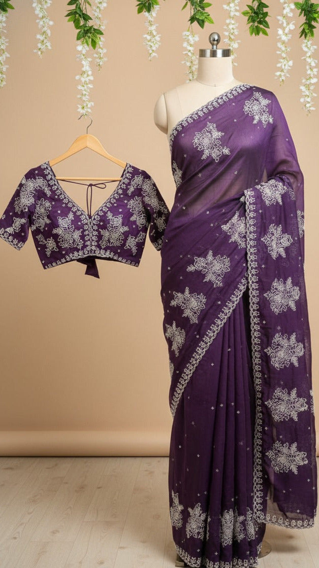 Matching Designer Blouse: Each saree comes with a matching unstitched blouse piece. The blouse features heavy floral embroidery on the sleeves, front, and back to perfectly complement the saree's minimal body design.