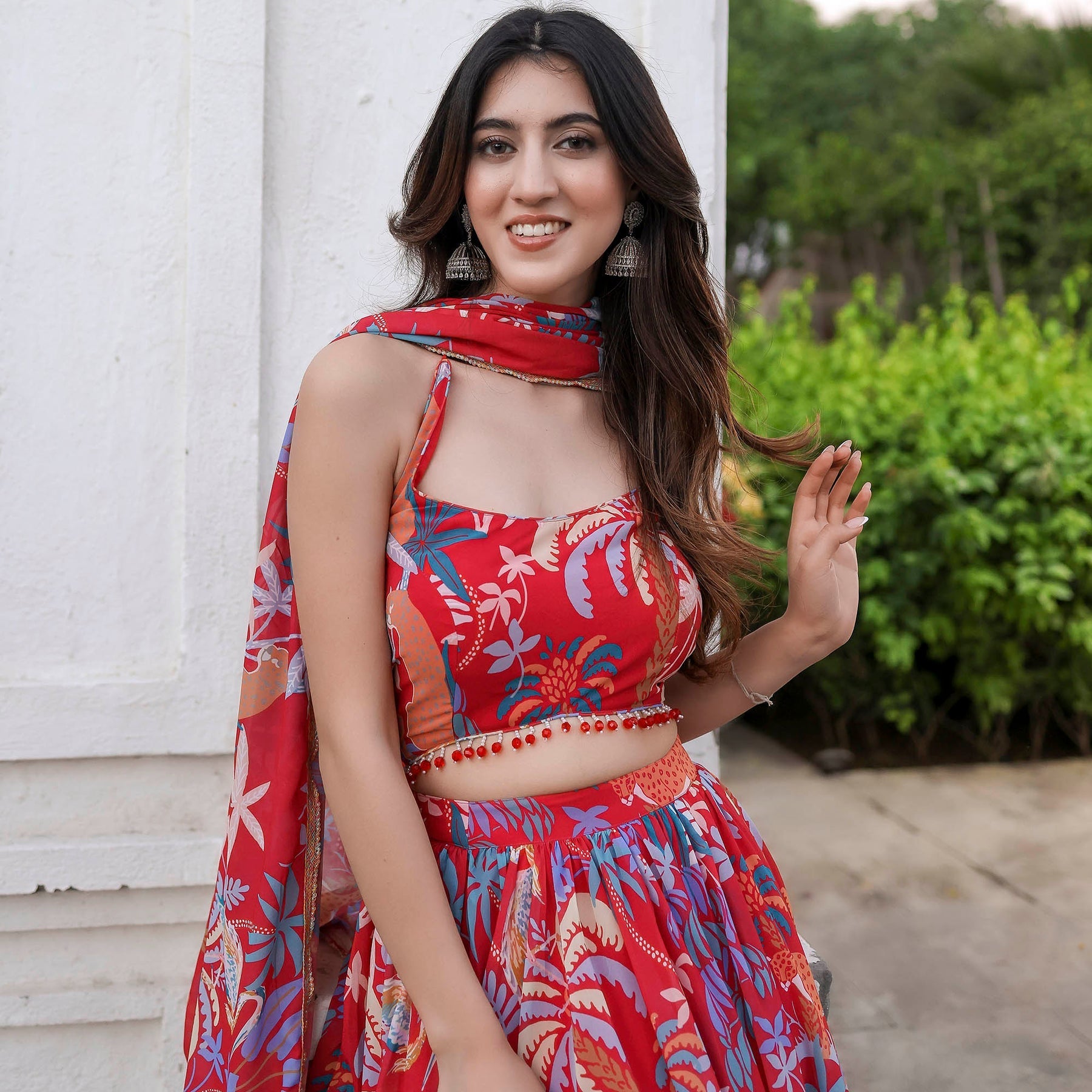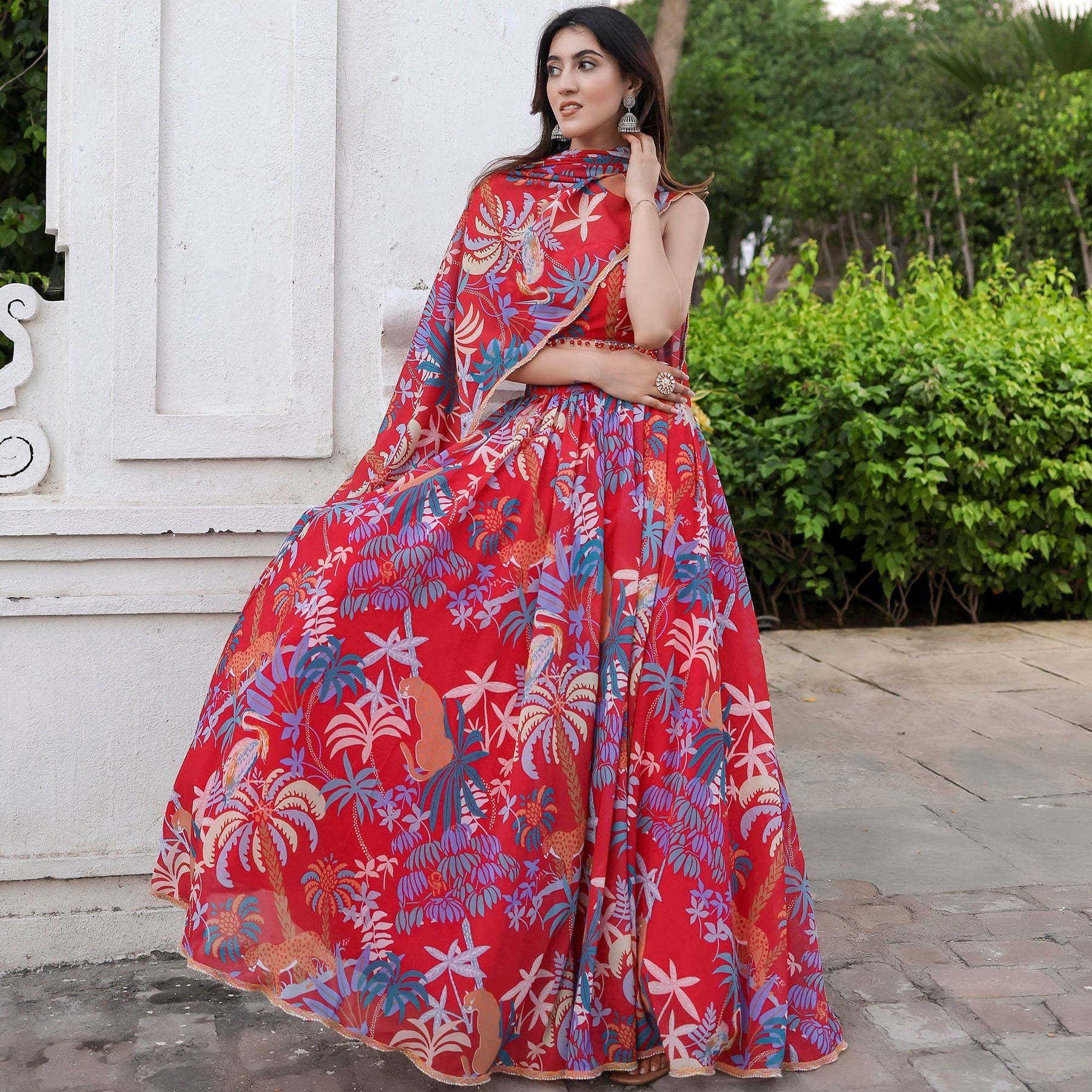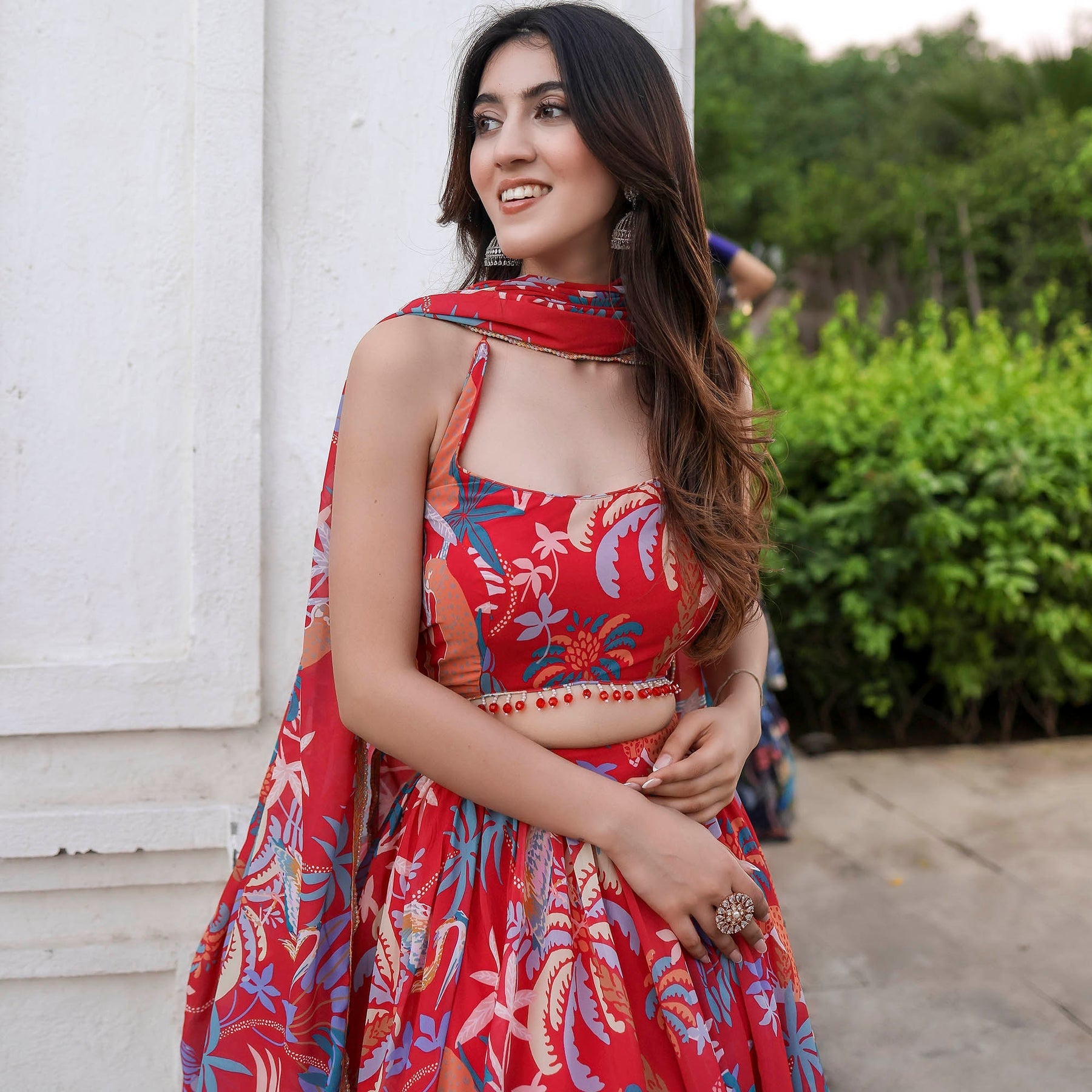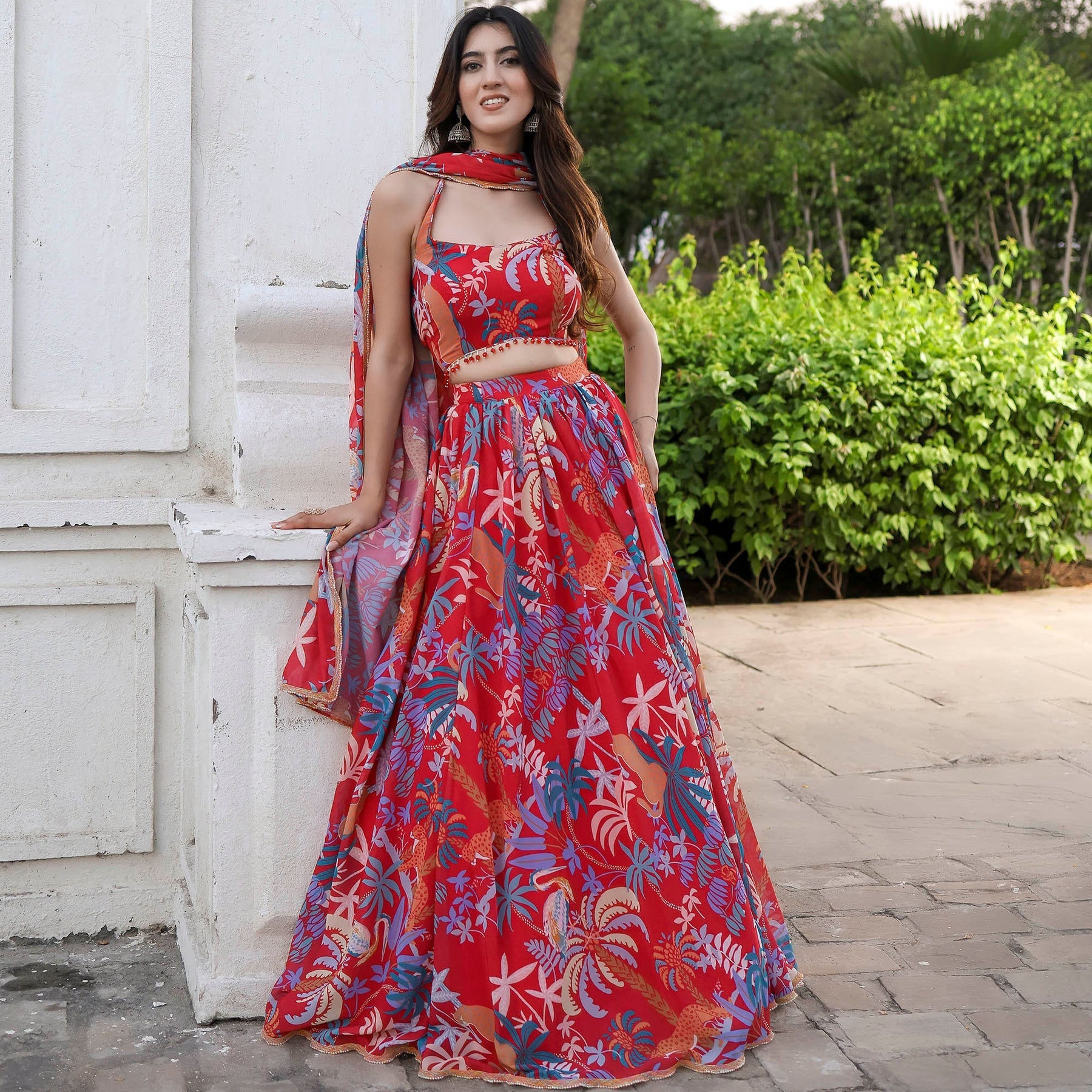 Shine bright in the festivities with our Radiant in MultiColor Sleeveless Printed Lehenga Set. Boasting a charming round neckline and a regular fit, this ensemble beautifully blends tradition with modernity. The vibrant print adds a burst of color to your celebration, while the convenient loop closure ensures ease of wear. Elevate your style with high-rise elegance and make a statement that resonates with sophistication and grace.