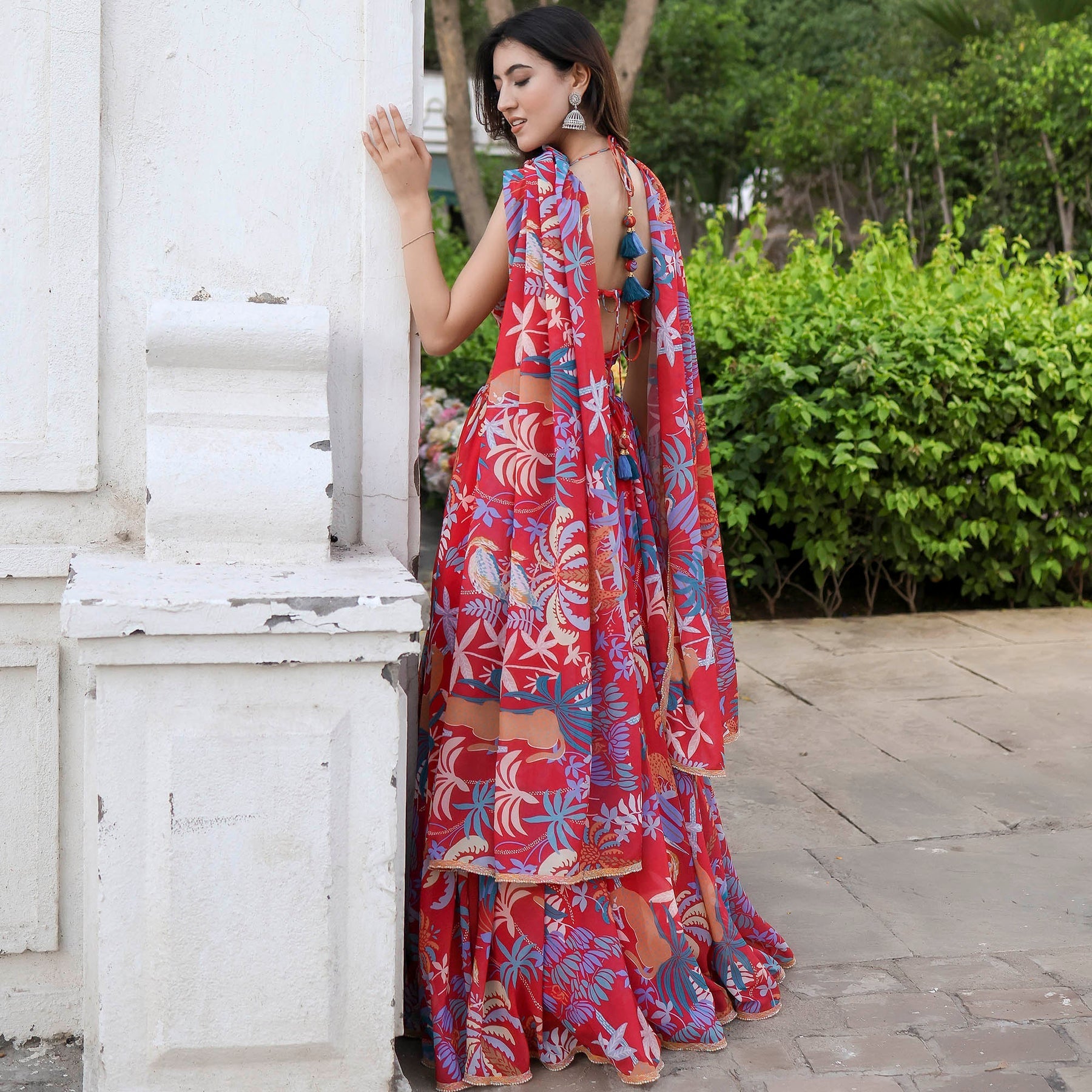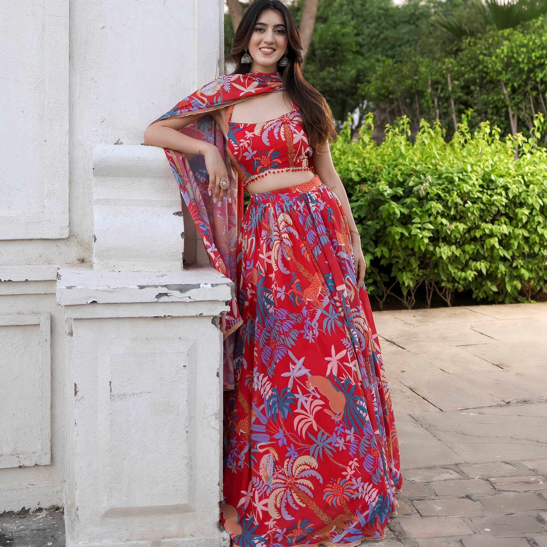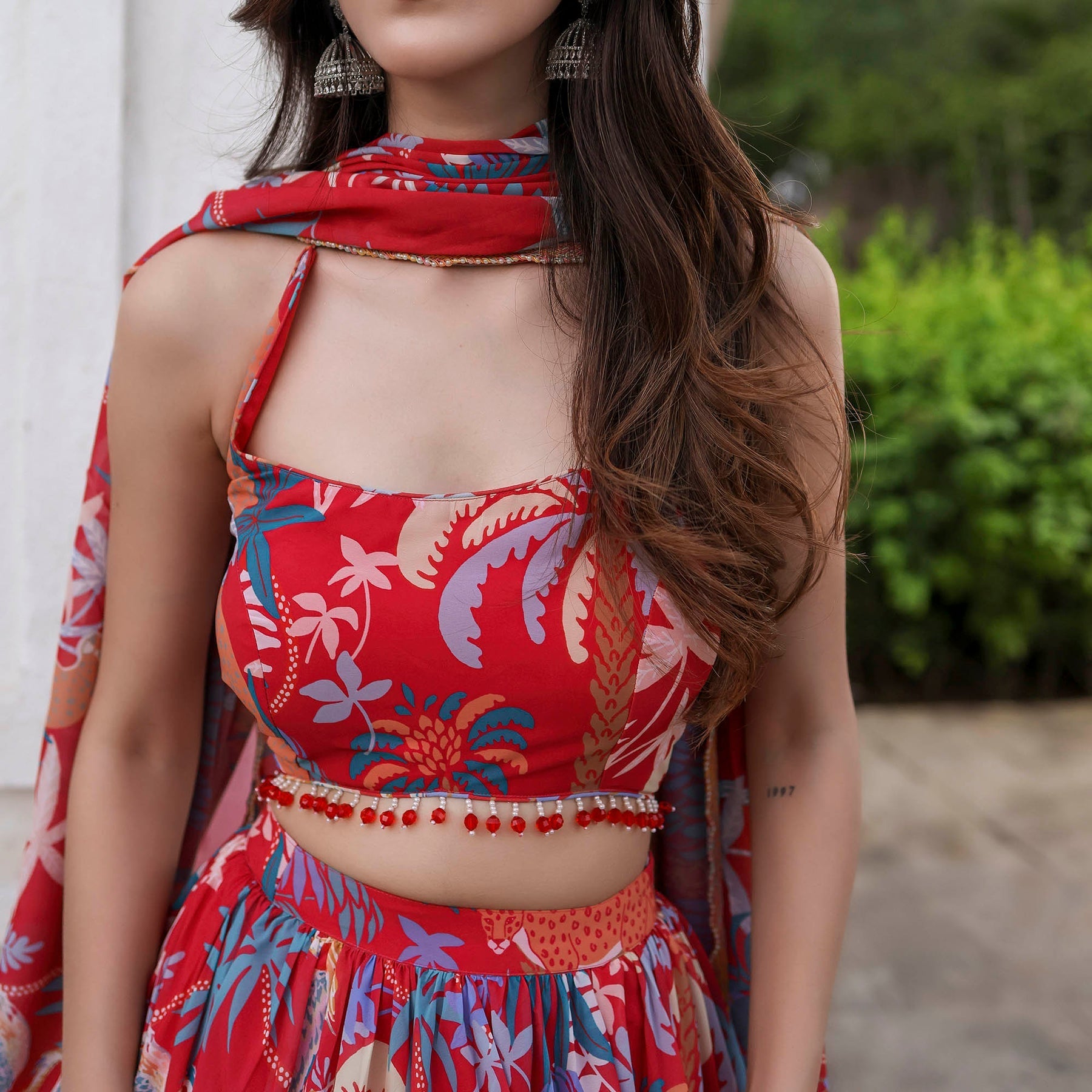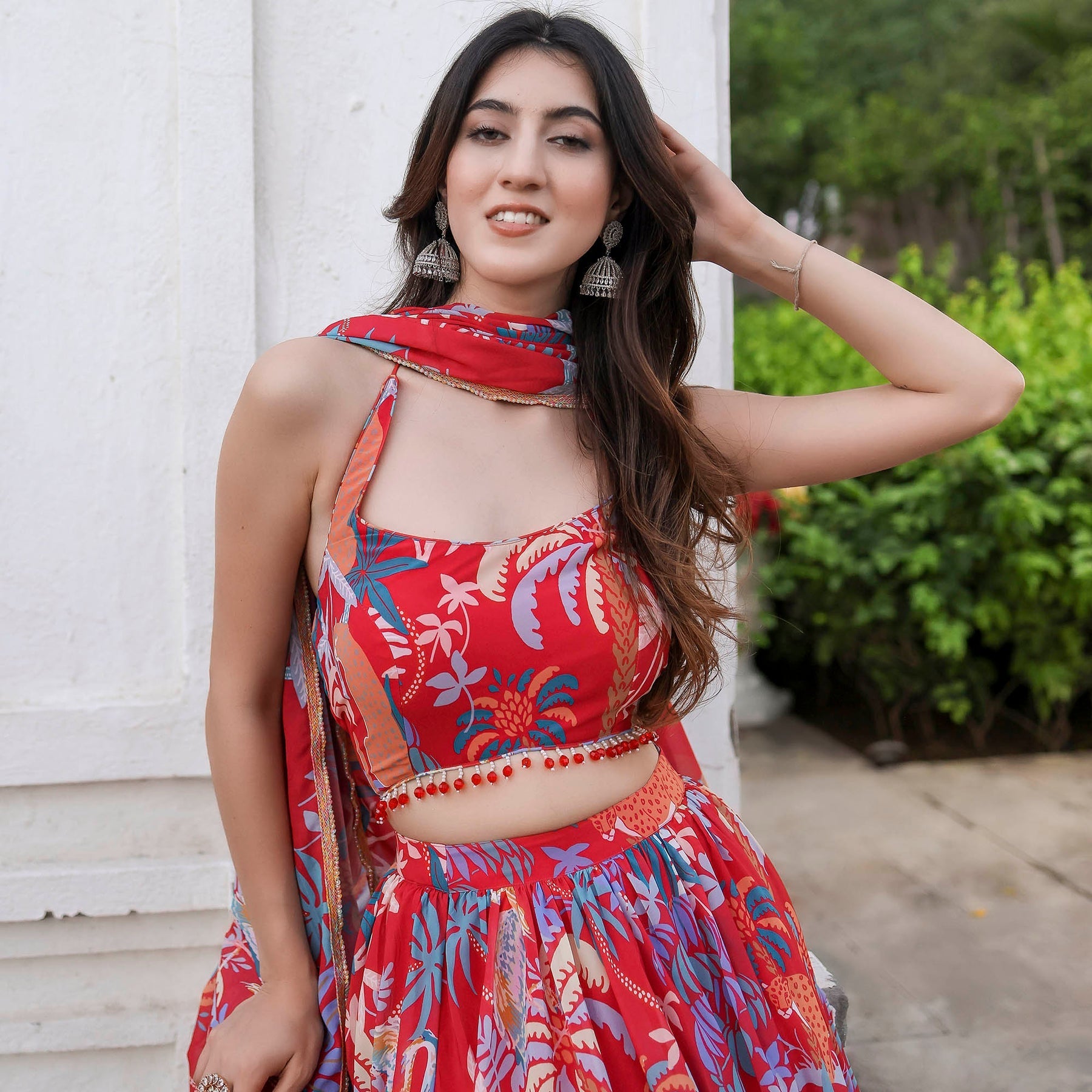 Shine bright in the festivities with our Radiant in MultiColor Sleeveless Printed Lehenga Set. Boasting a charming round neckline and a regular fit, this ensemble beautifully blends tradition with modernity. The vibrant print adds a burst of color to your celebration, while the convenient loop closure ensures ease of wear. Elevate your style with high-rise elegance and make a statement that resonates with sophistication and grace.