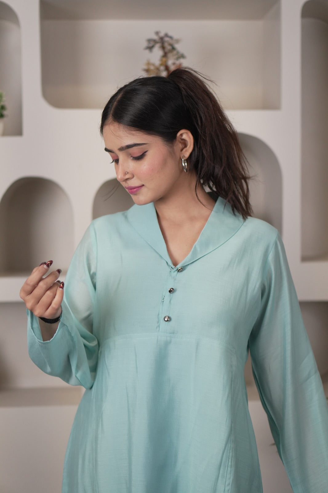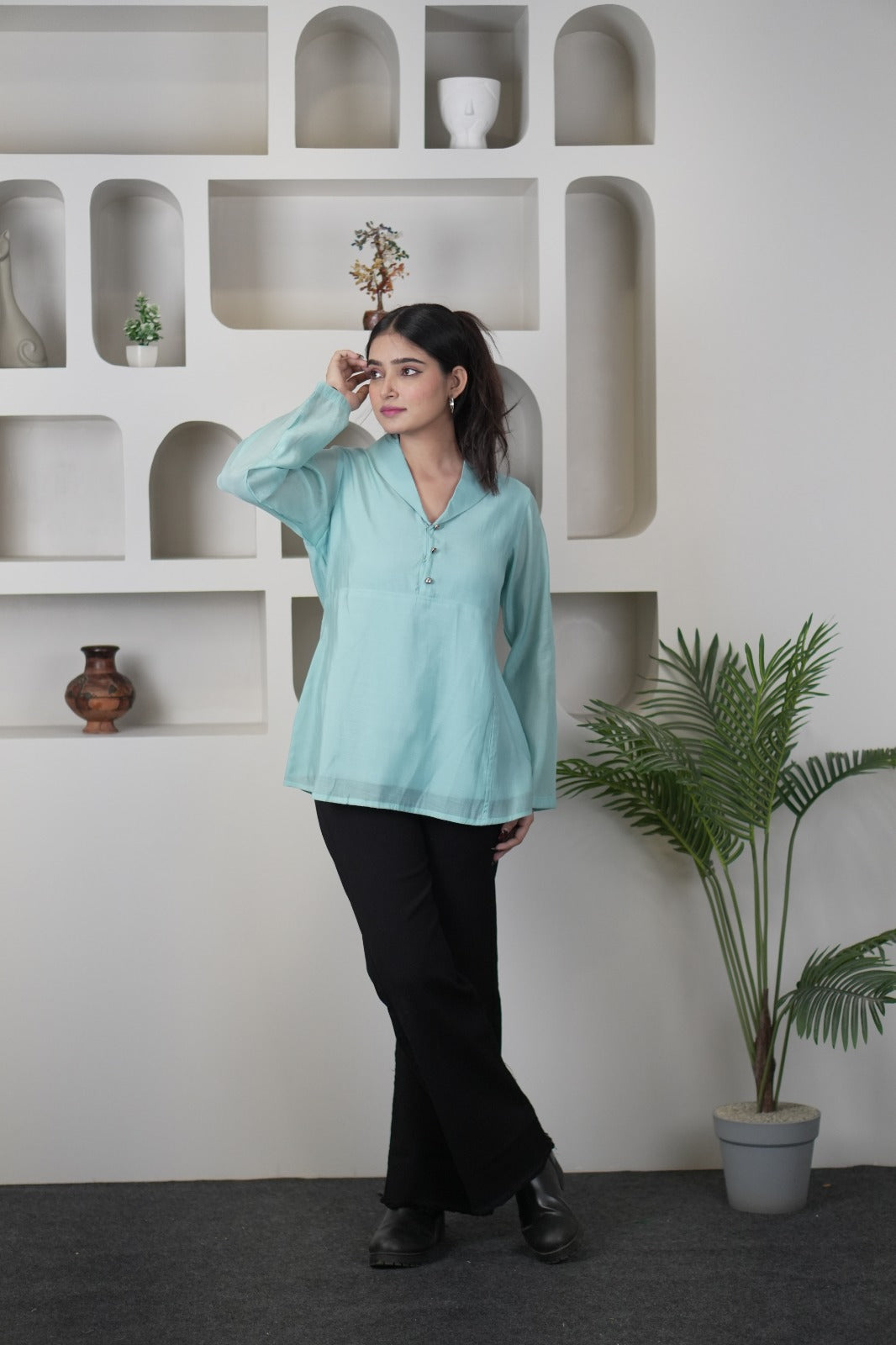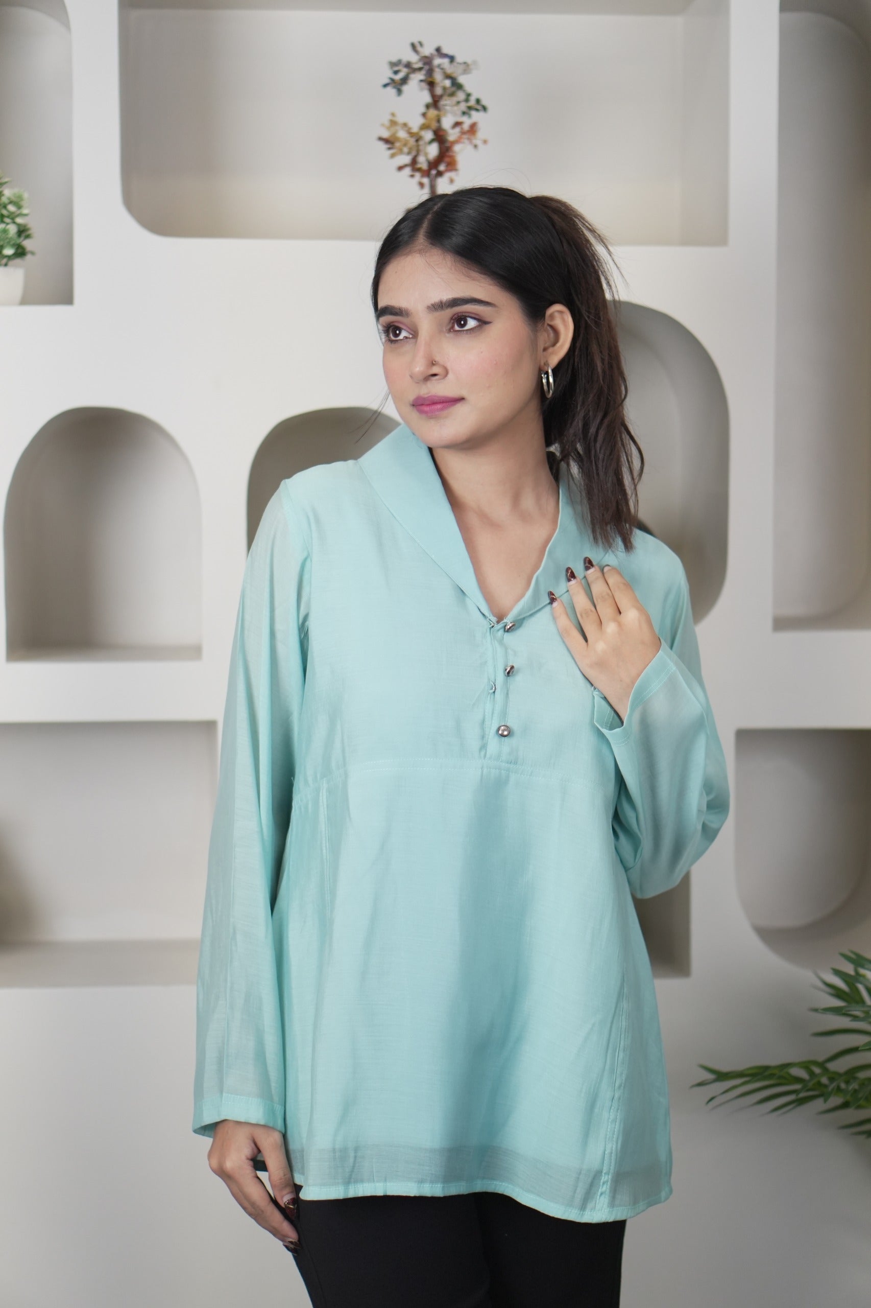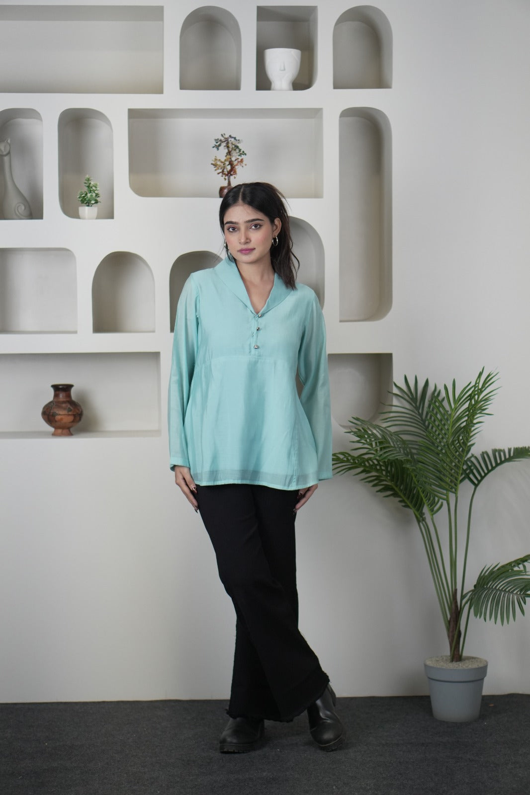 Stylish Teal Chanderi Silk Blend Kurti-Style Top D6279
