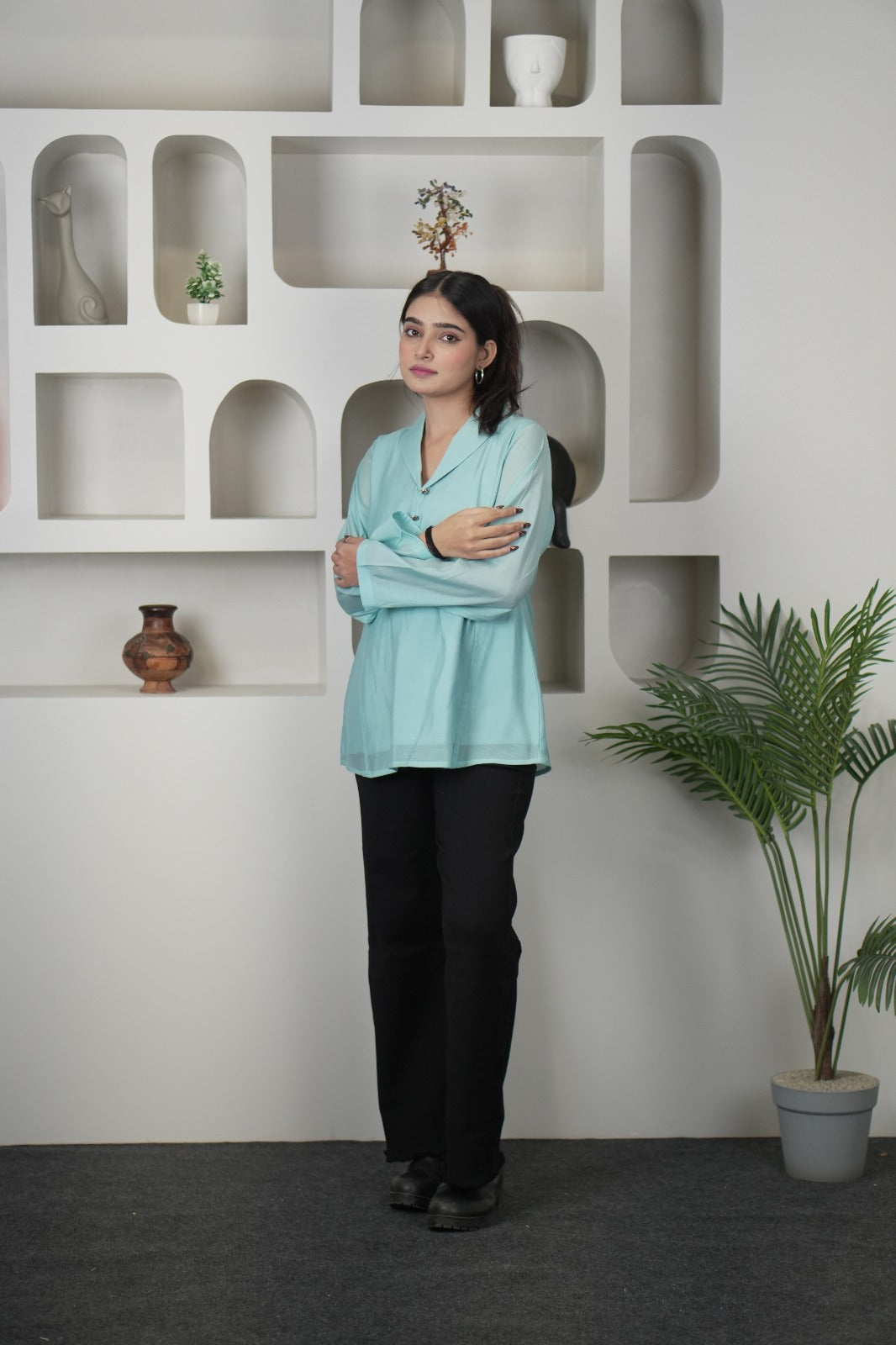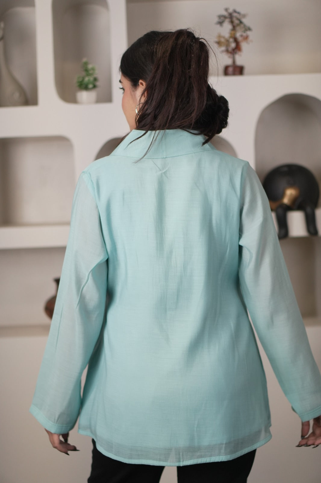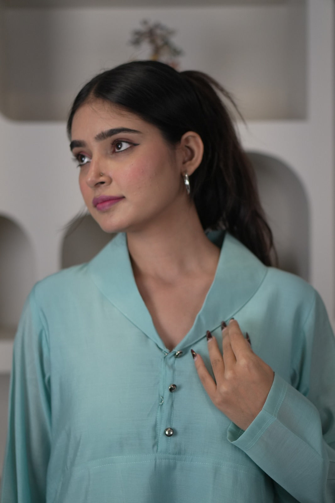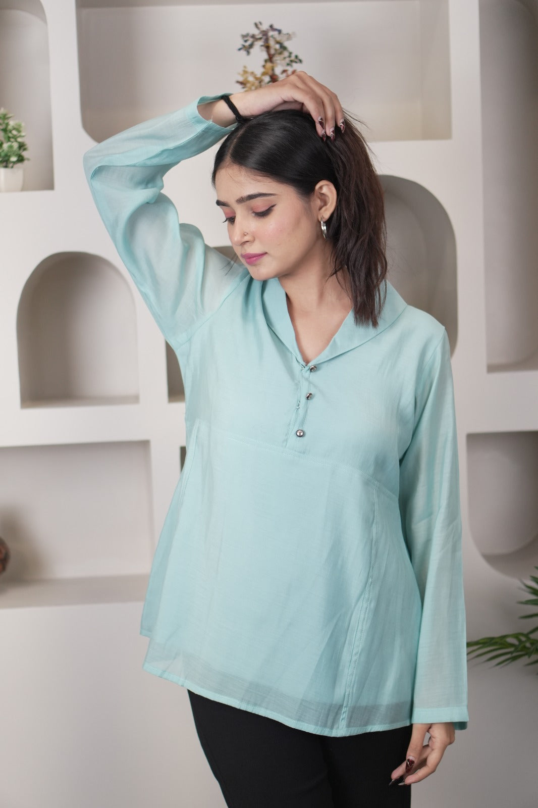 Stylish Teal Chanderi Silk Blend Kurti-Style Top D6279