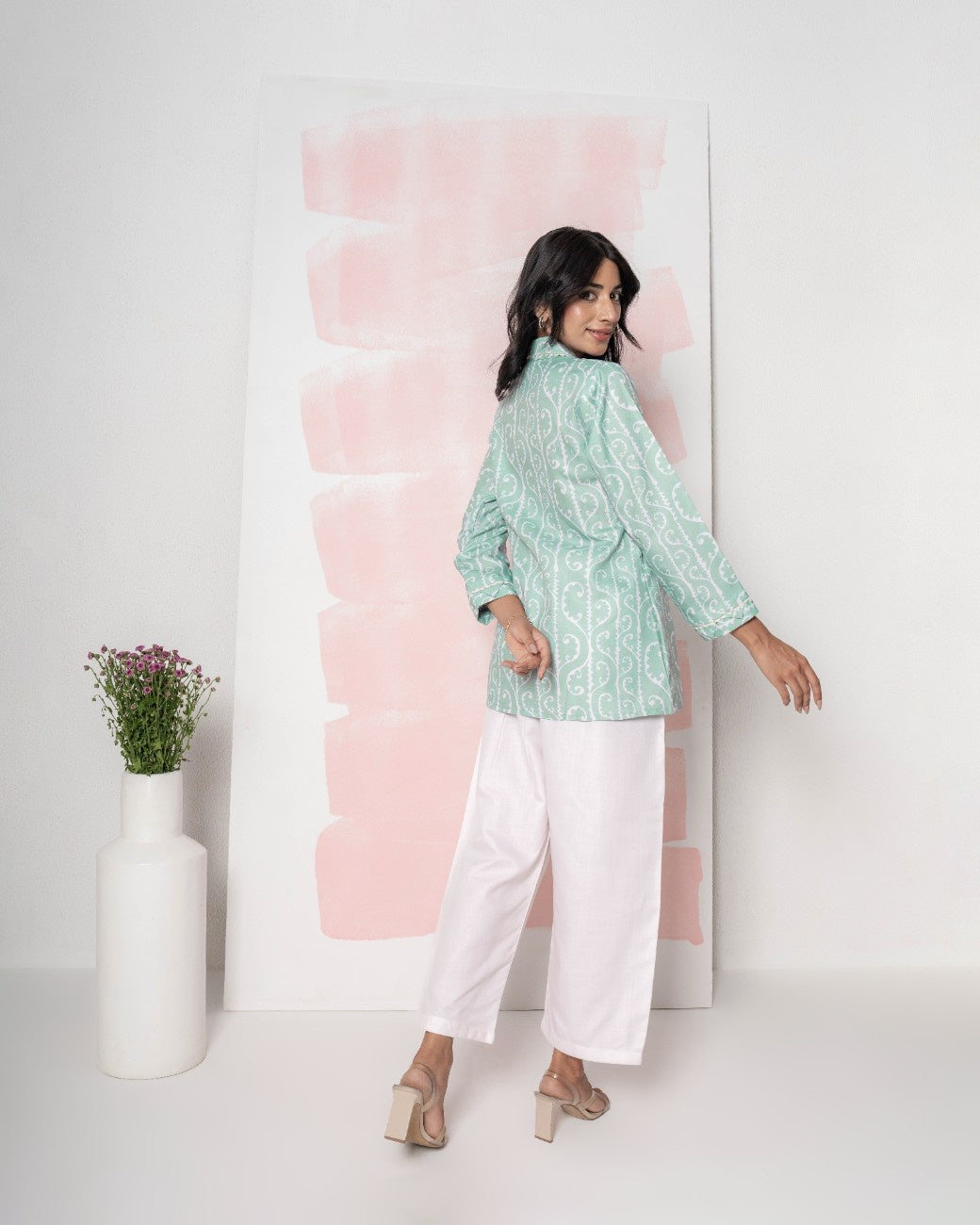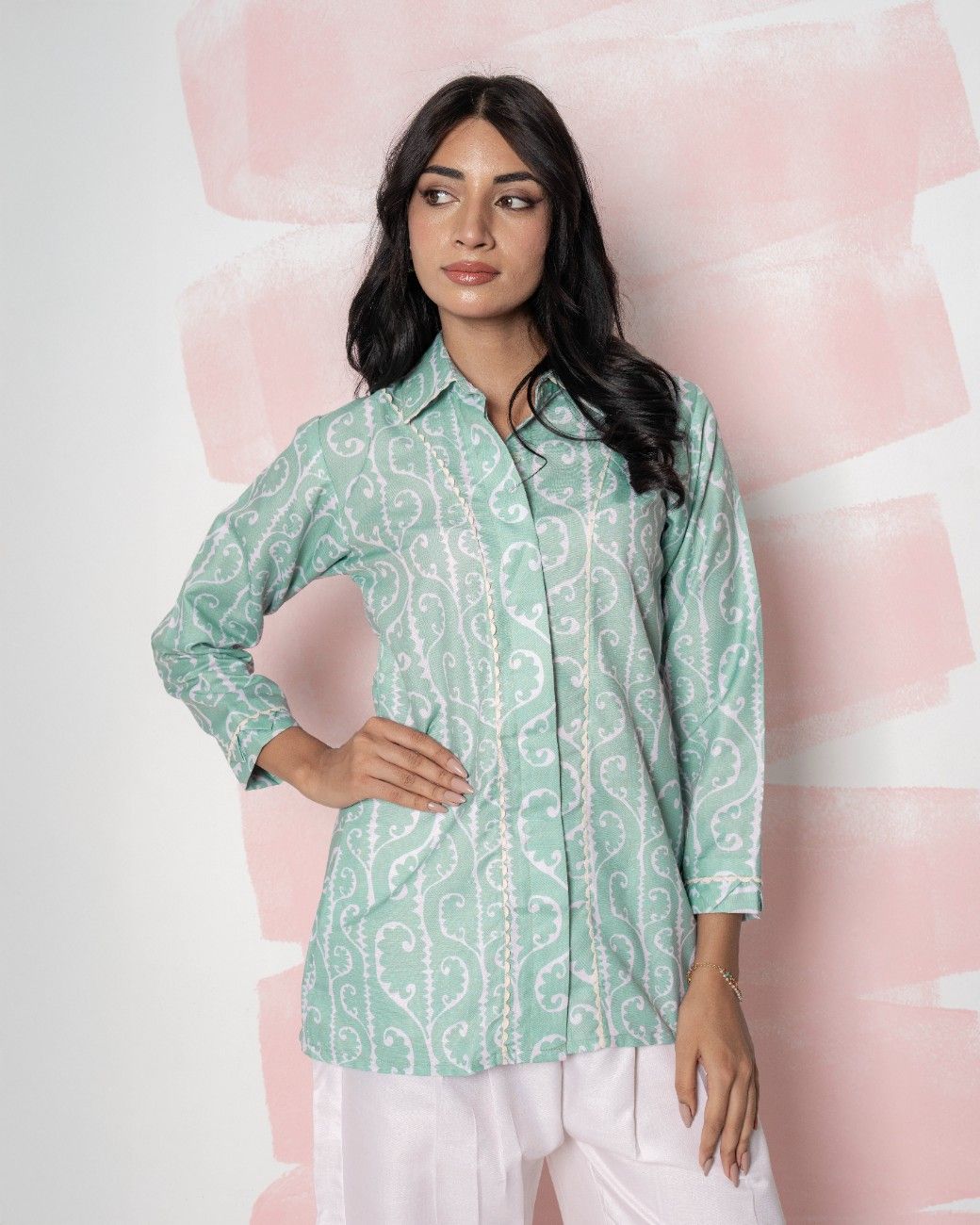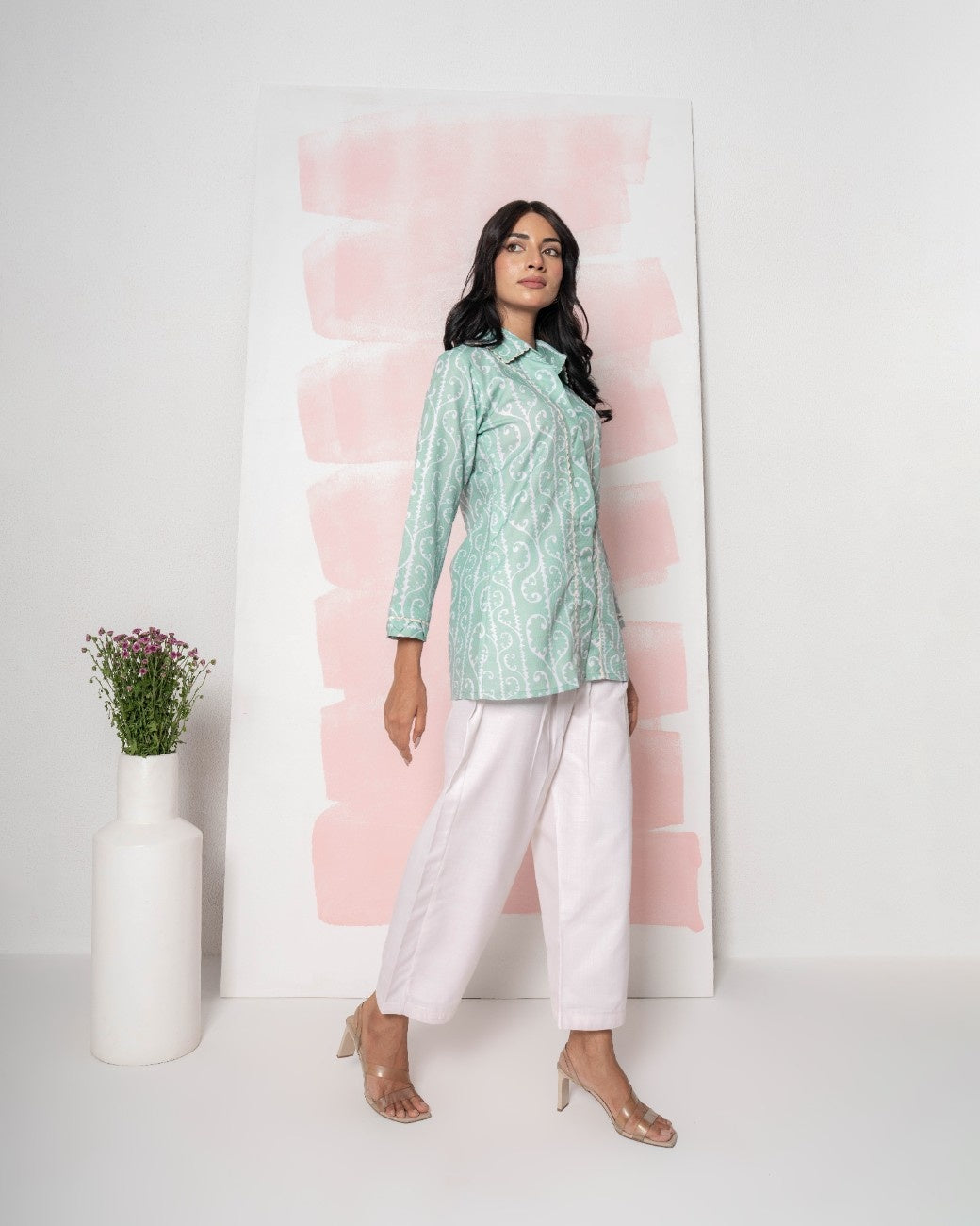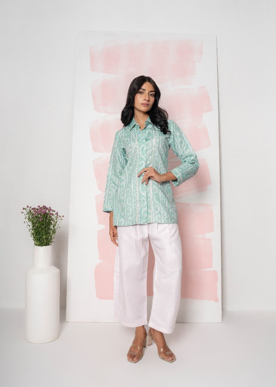 Stay effortlessly chic in this contemporary co-ord set crafted from breathable Bamboo Linen. The crisp white ensemble showcases subtle earthy-toned embroidered patterns on the shirt front, sleeves, and along the side seams of the straight-leg trousers. Its relaxed silhouette combines modern tailoring with soft, sustainable fabric, making it perfect for casual outings or smart-casual gatherings.