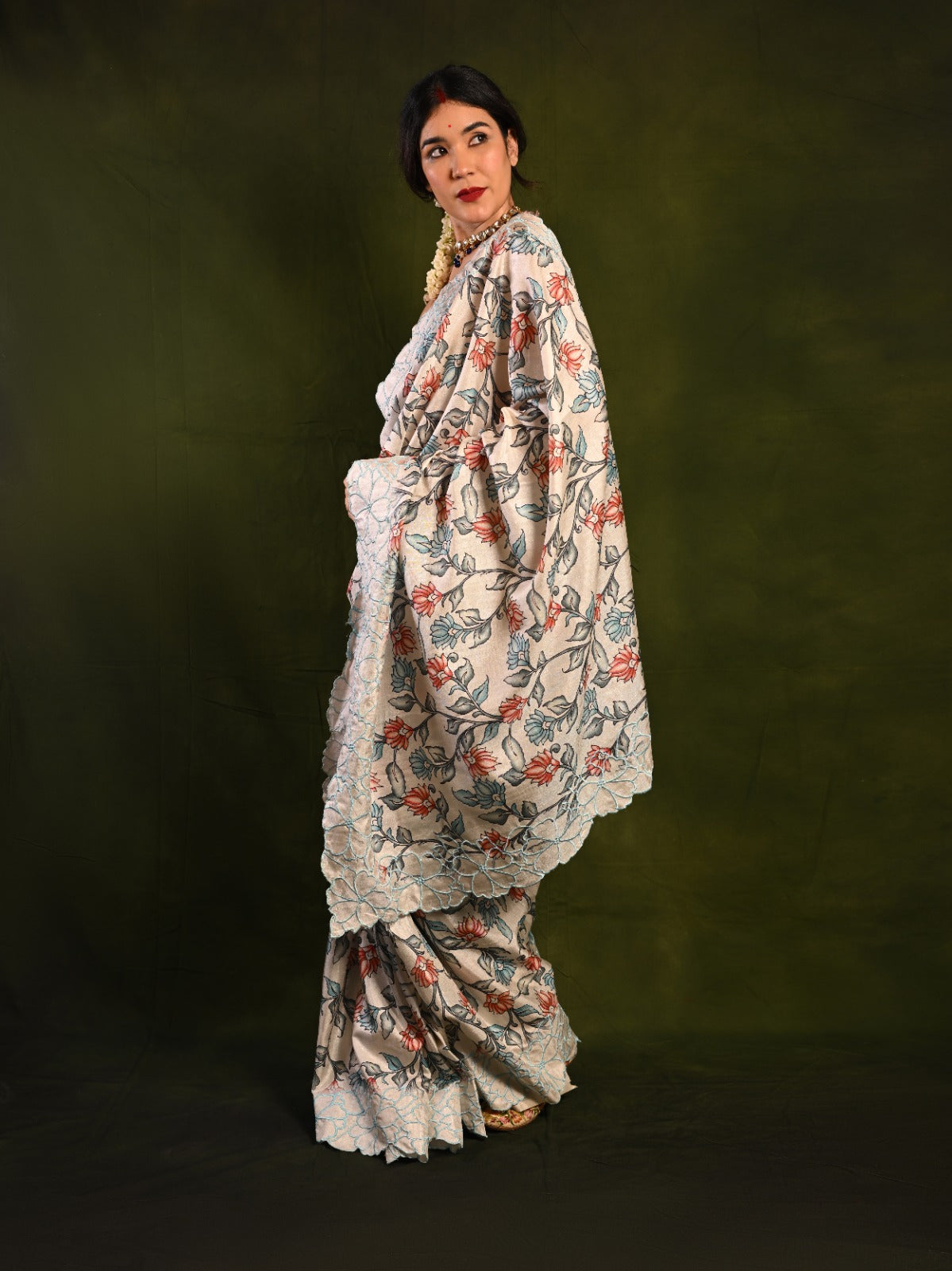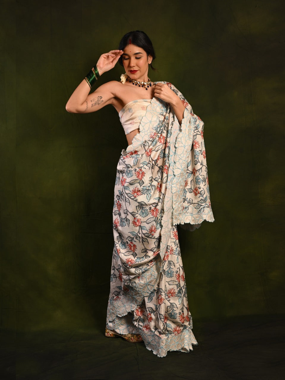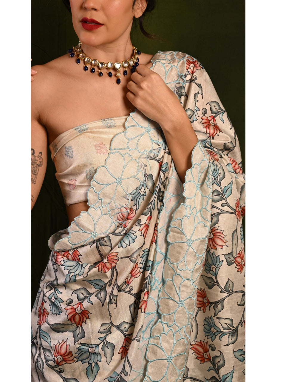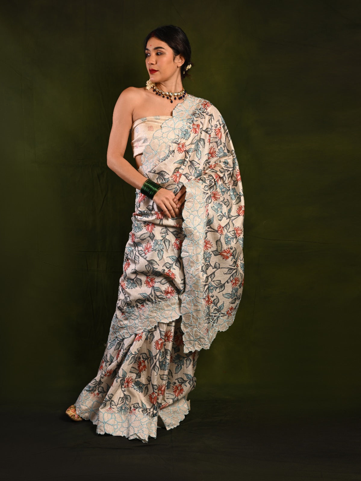 Tussar Silk Saree with Digital Print & Embroidered Cutwork S2016