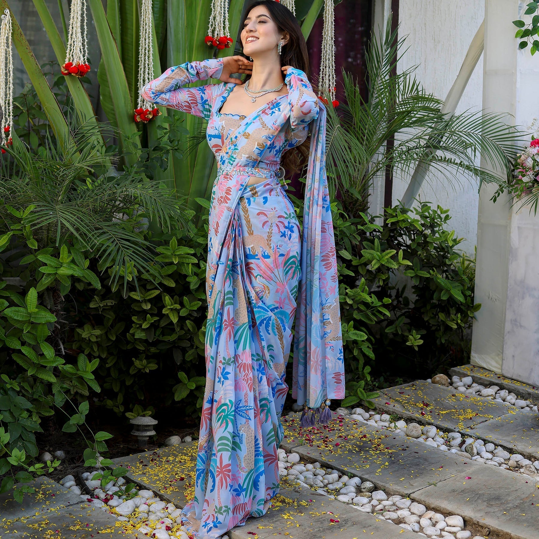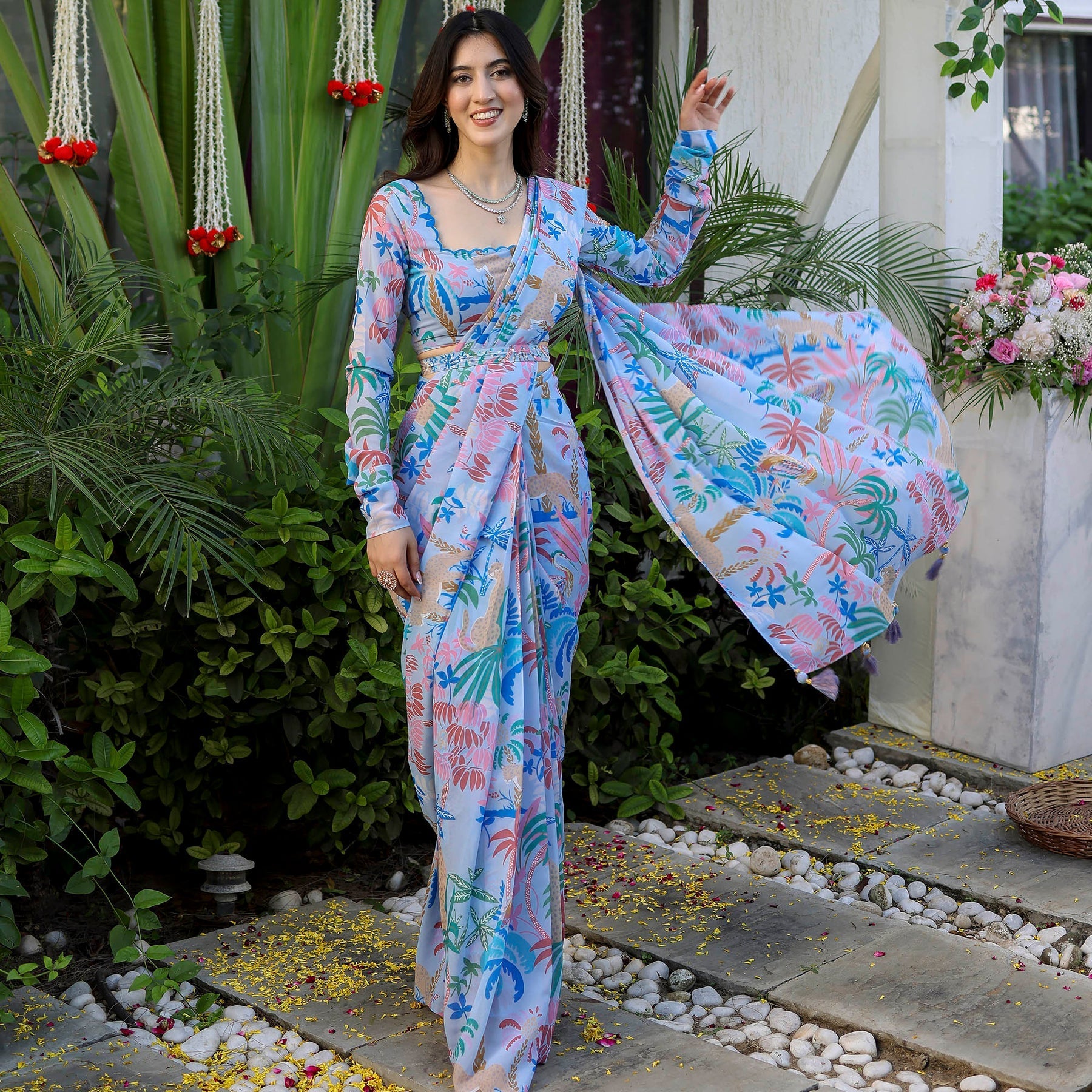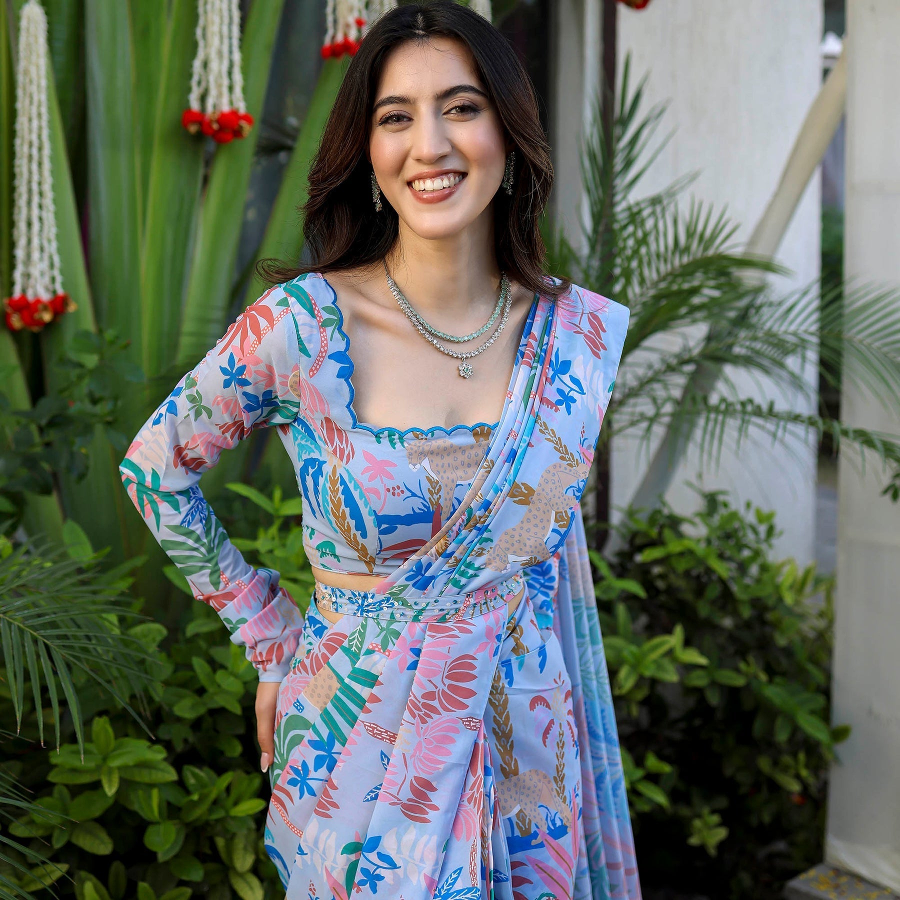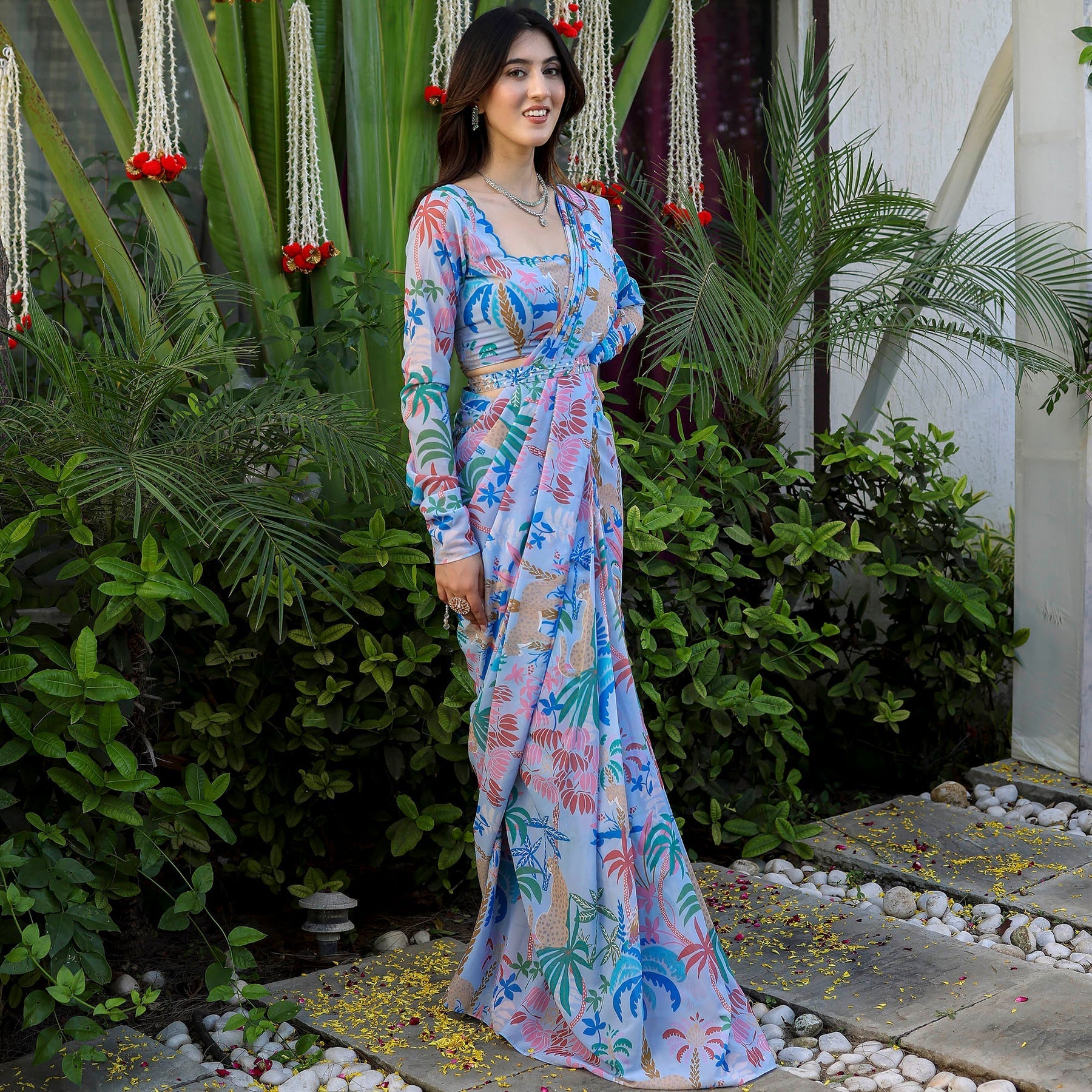 Embrace the essence of festive chic with our Women's Leopard Printed Stylish Georgette Ready-To-Wear Saree. Step into elegance effortlessly with our Baag Printed Ready Saree, meticulously crafted to elevate your festive ensemble. Adorned with chudi sleeves and a stylish square neckline, this saree boasts a regular fit that flatters every silhouette. The captivating leopard print, accentuated with intricate machine work, adds a touch of sophistication to your look. Complete with a convenient hook-eye closure and high-rise elegance, this saree ensures you celebrate the occasion in style, effortlessly blending tradition with contemporary flair.