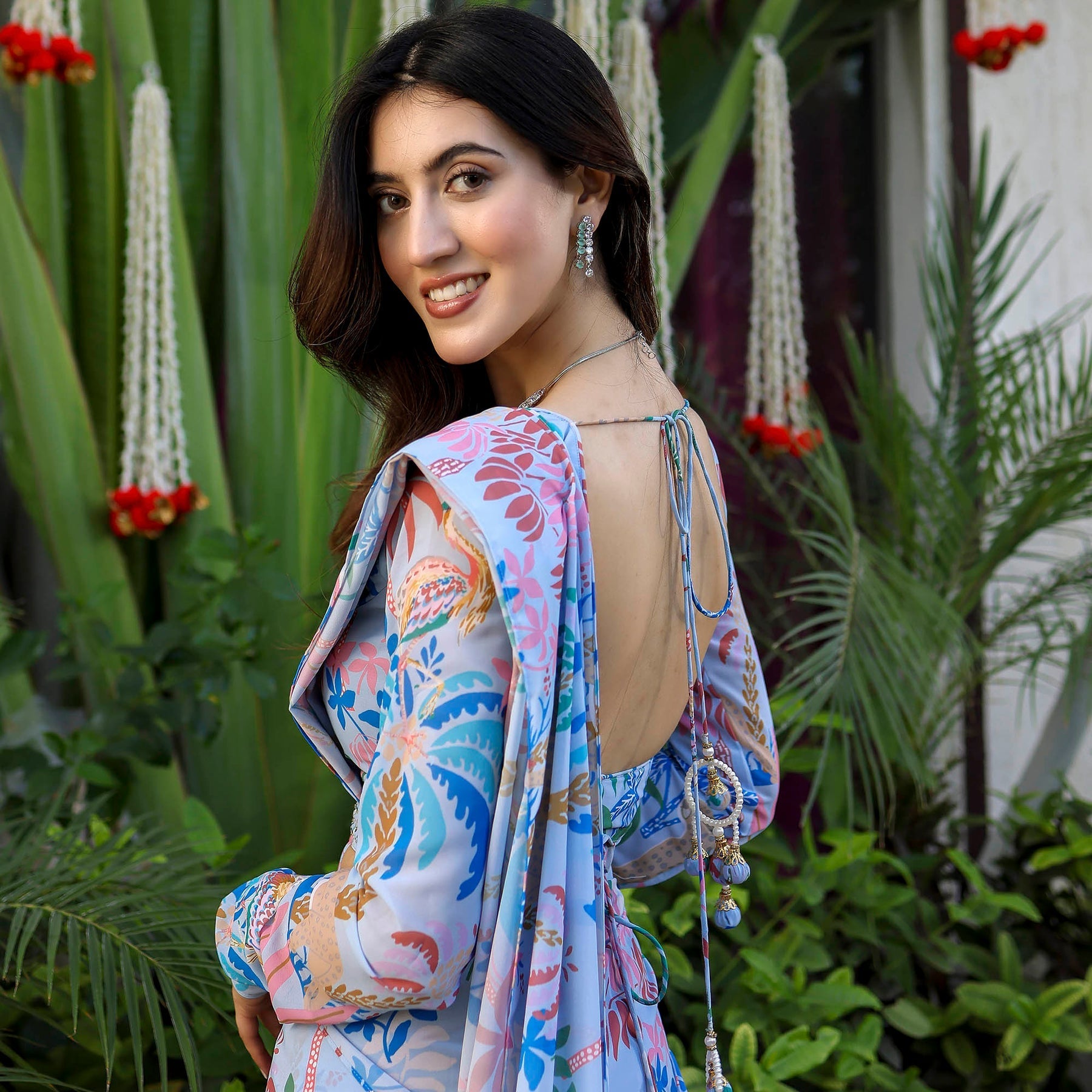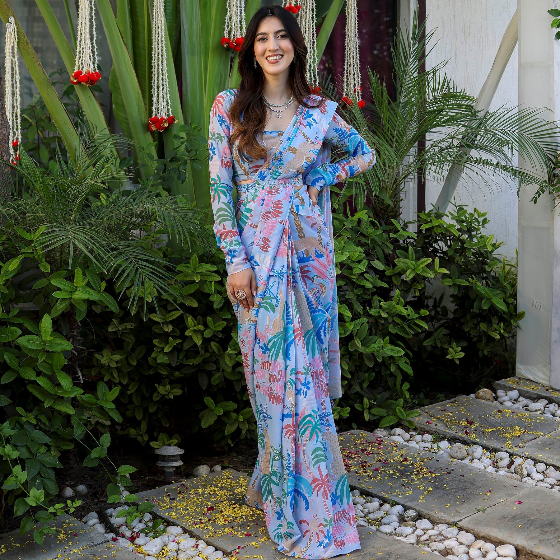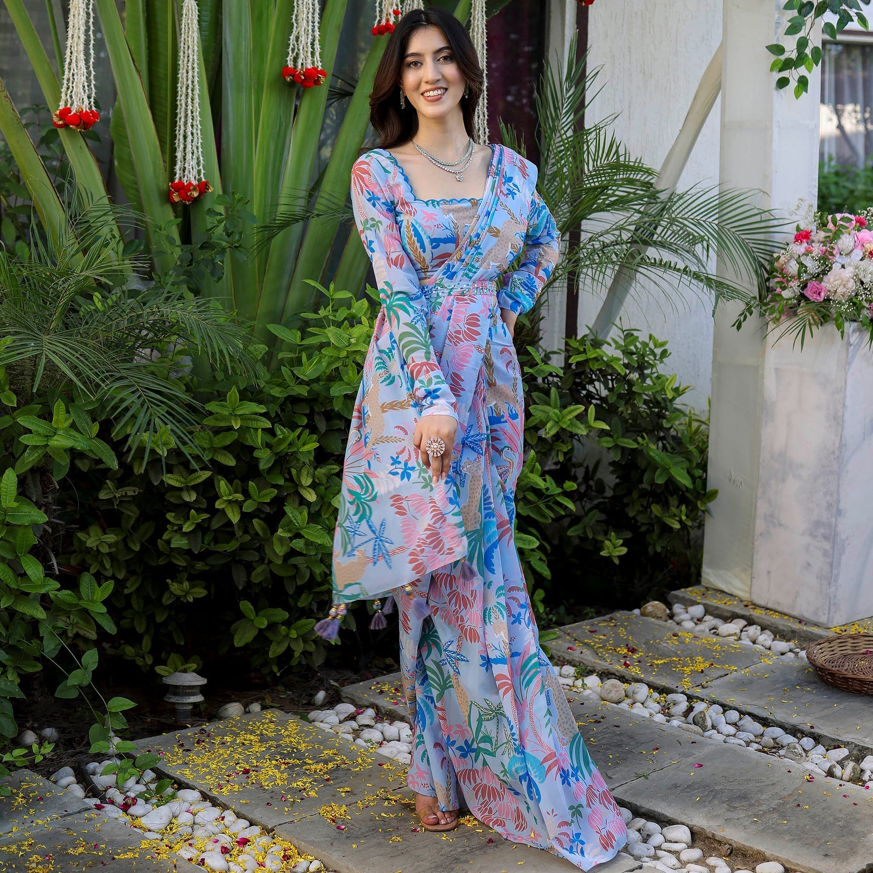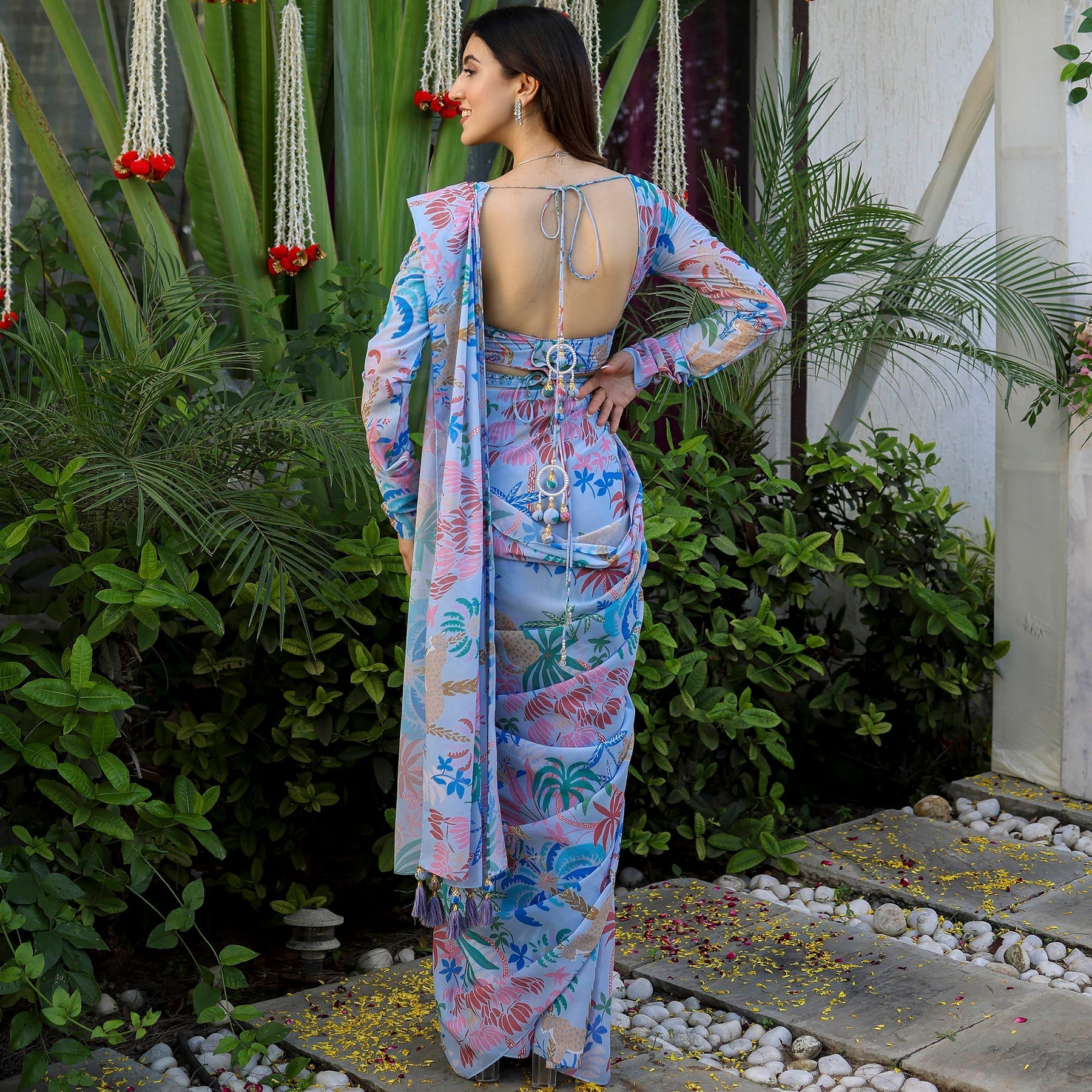 Embrace the essence of festive chic with our Women's Leopard Printed Stylish Georgette Ready-To-Wear Saree. Step into elegance effortlessly with our Baag Printed Ready Saree, meticulously crafted to elevate your festive ensemble. Adorned with chudi sleeves and a stylish square neckline, this saree boasts a regular fit that flatters every silhouette. The captivating leopard print, accentuated with intricate machine work, adds a touch of sophistication to your look. Complete with a convenient hook-eye closure and high-rise elegance, this saree ensures you celebrate the occasion in style, effortlessly blending tradition with contemporary flair.