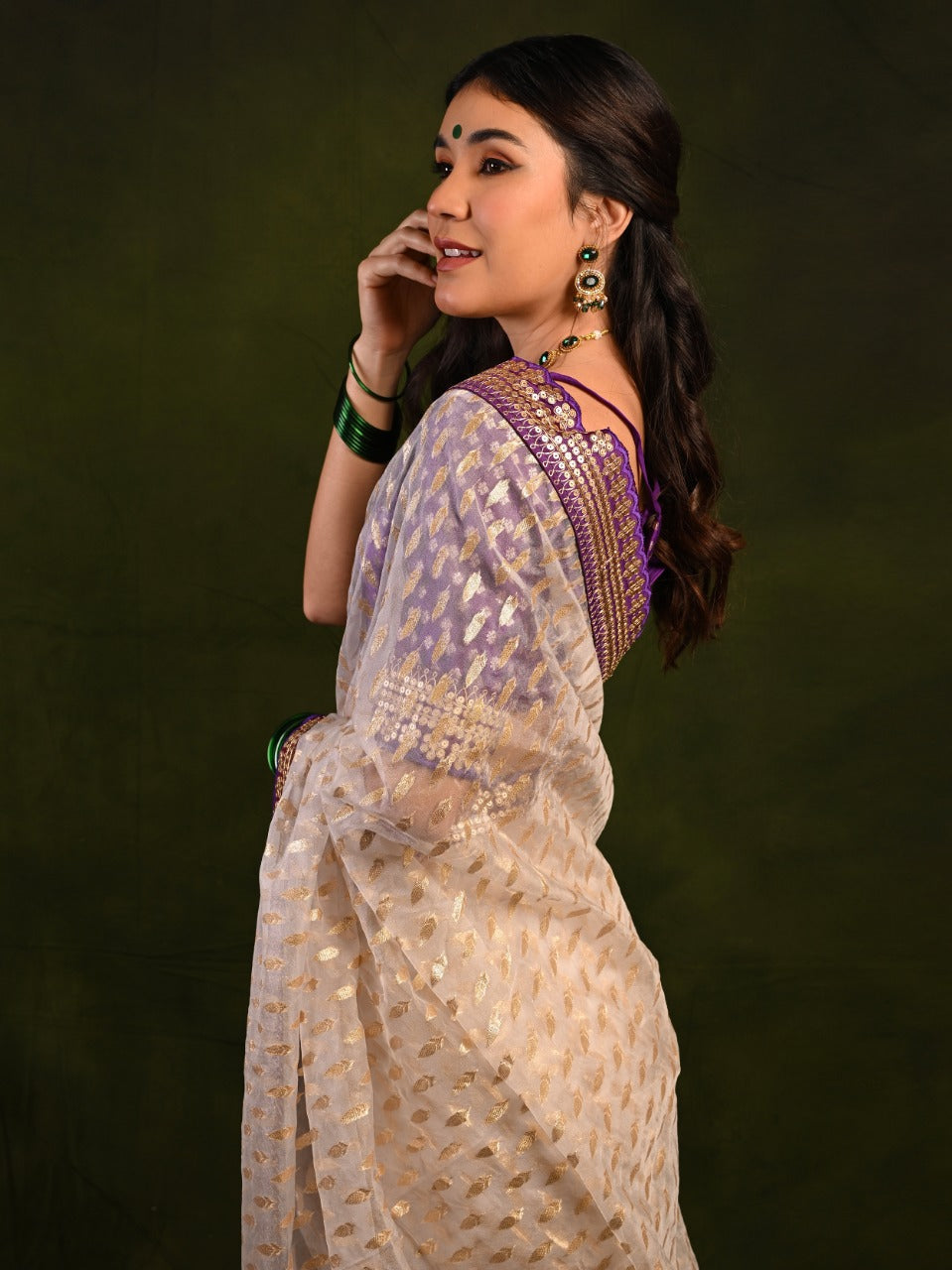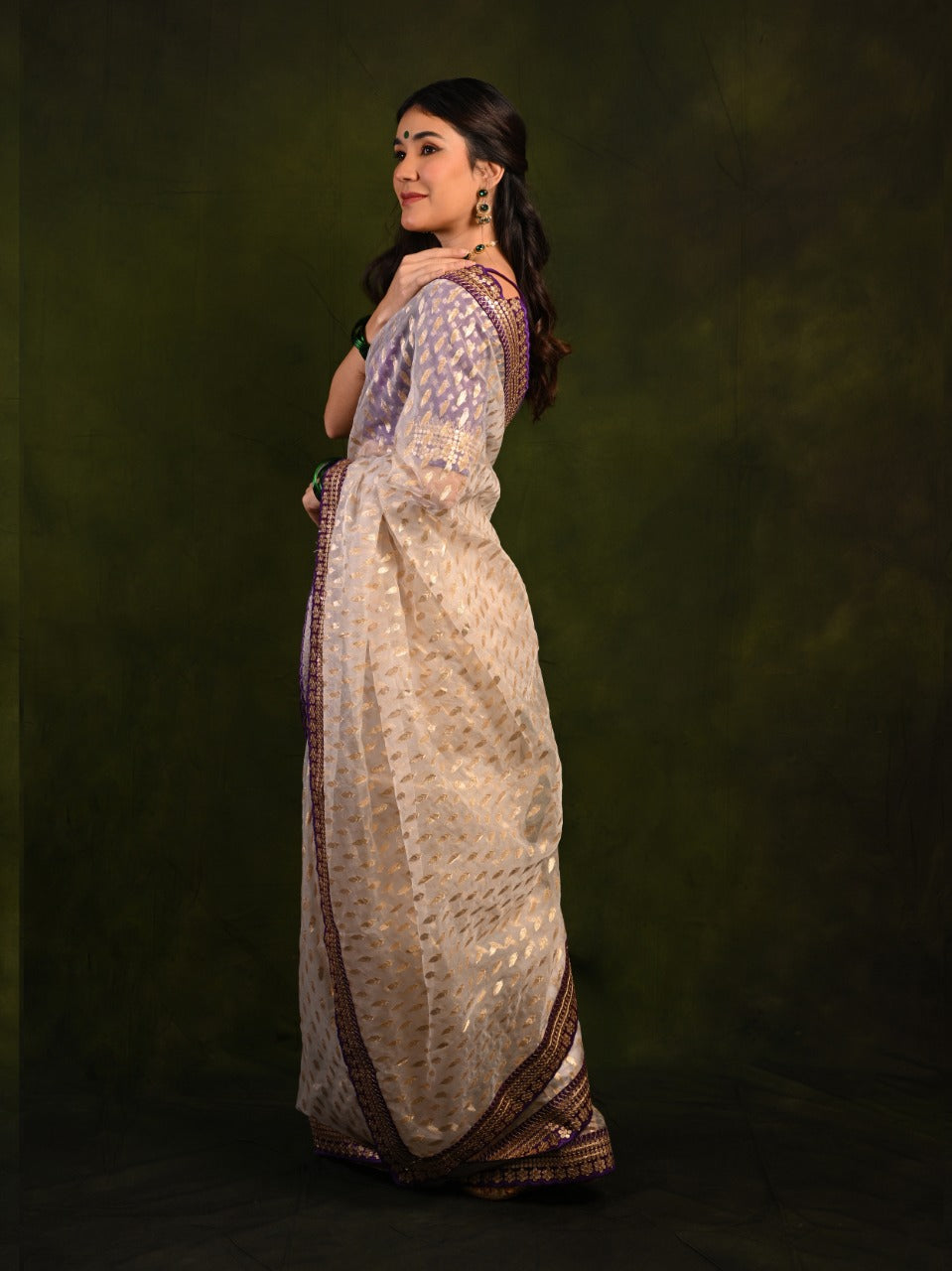 This exquisite saree is crafted from delicate organza fabric, featuring intricate coding lace that adds a touch of elegance and sophistication. The saree is paired with a luxurious Banarsi silk unstitched blouse, beautifully embroidered for a traditional and refined look. Perfect for special occasions, this combination offers both style and comfort, allowing for customization to suit your personal taste.